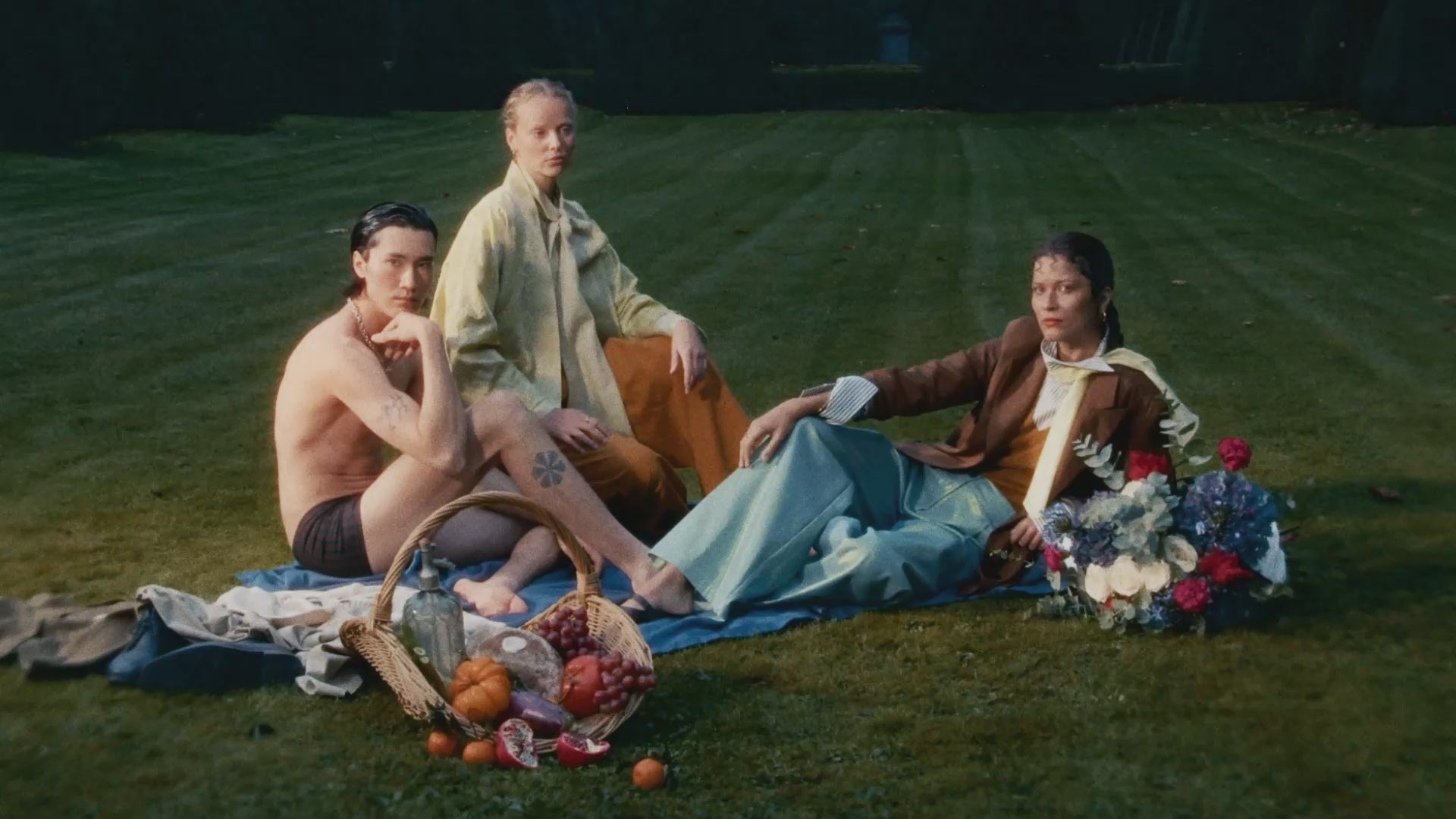 Das Kampagnenshooting unterstreicht diese Fluidität. Ein Schlossgarten, ein malerisches déjeuner sur l’herbe, Romantik mit einer gewissen Edge. Der Mann in einem verspielten Piece, die Frau in einer markanten Silhouette.