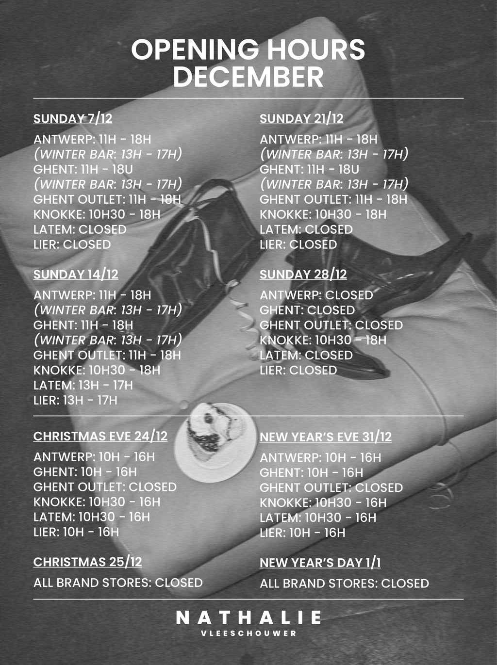 Unsere Brand Stores in Antwerpen und Gent sind an den ersten drei Sonntagen im Dezember geöffnet. Zwischen 13 und 17 Uhr kannst du während des Weihnachtsshoppings kurz entspannen – bei einem Mocktail, Cocktail oder einem belebenden Kaffee.