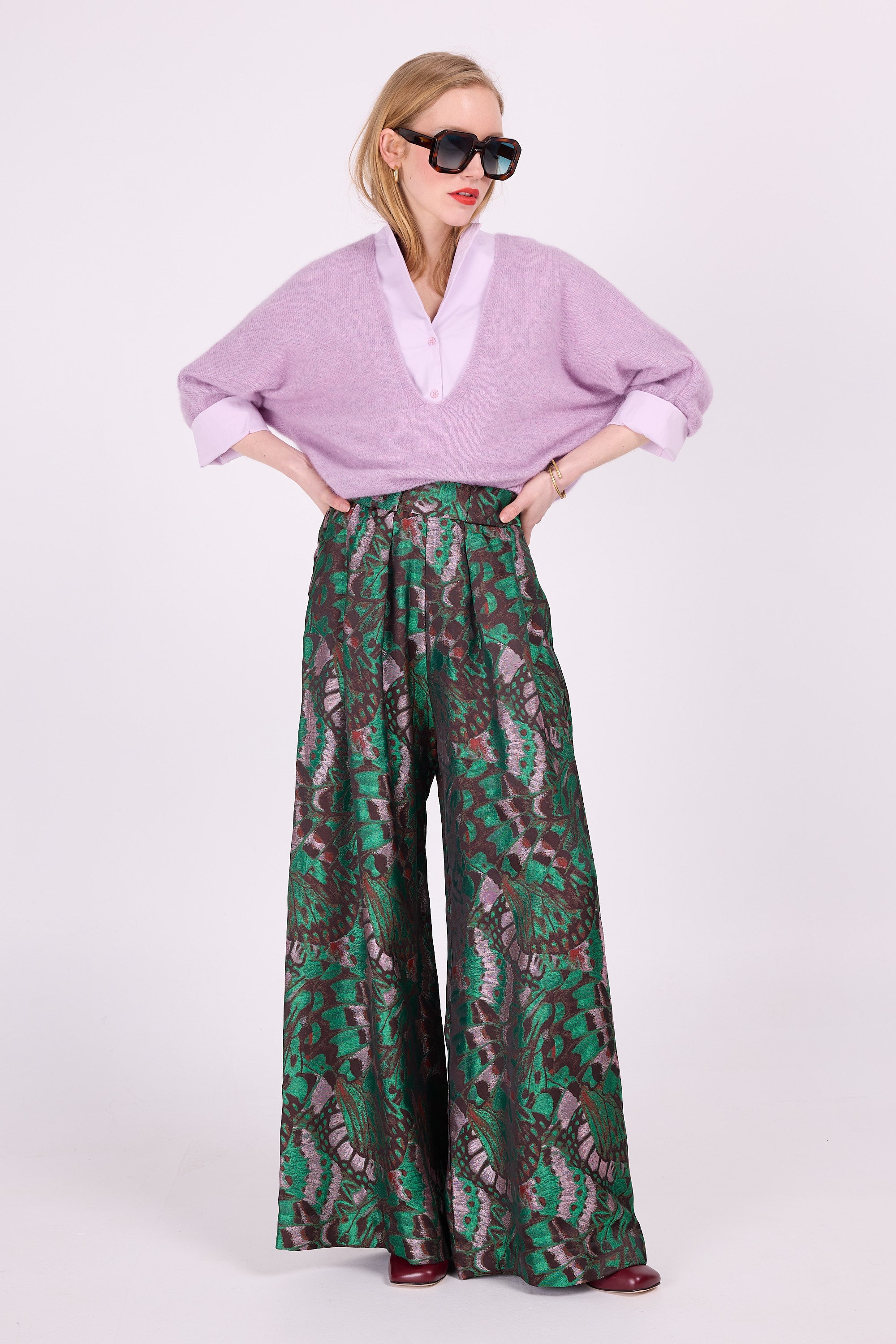Voluminöse Hose aus anschmiegsamem Stoff, der ihr fast den Look einer Culotte verleiht. Ausgeführt in einem weich fließenden, gewebten Jacquardstoff mit eingewebtem Schmetterlingsdruck, mit wunderschönen Farbtönen, die von leuchtendem Grün und Kupfer bis hin zu zartem Rosa und tiefem Braun reichen.