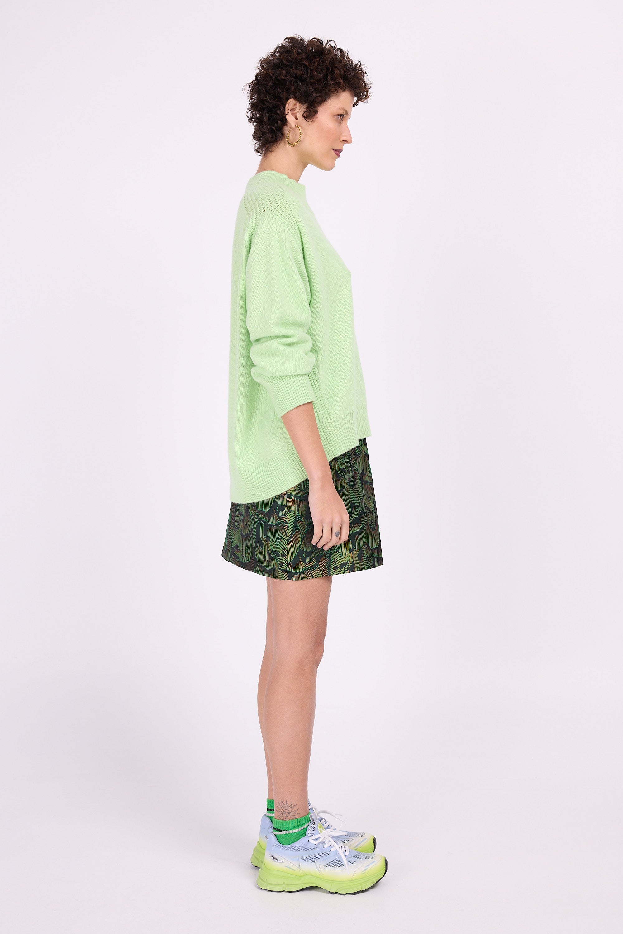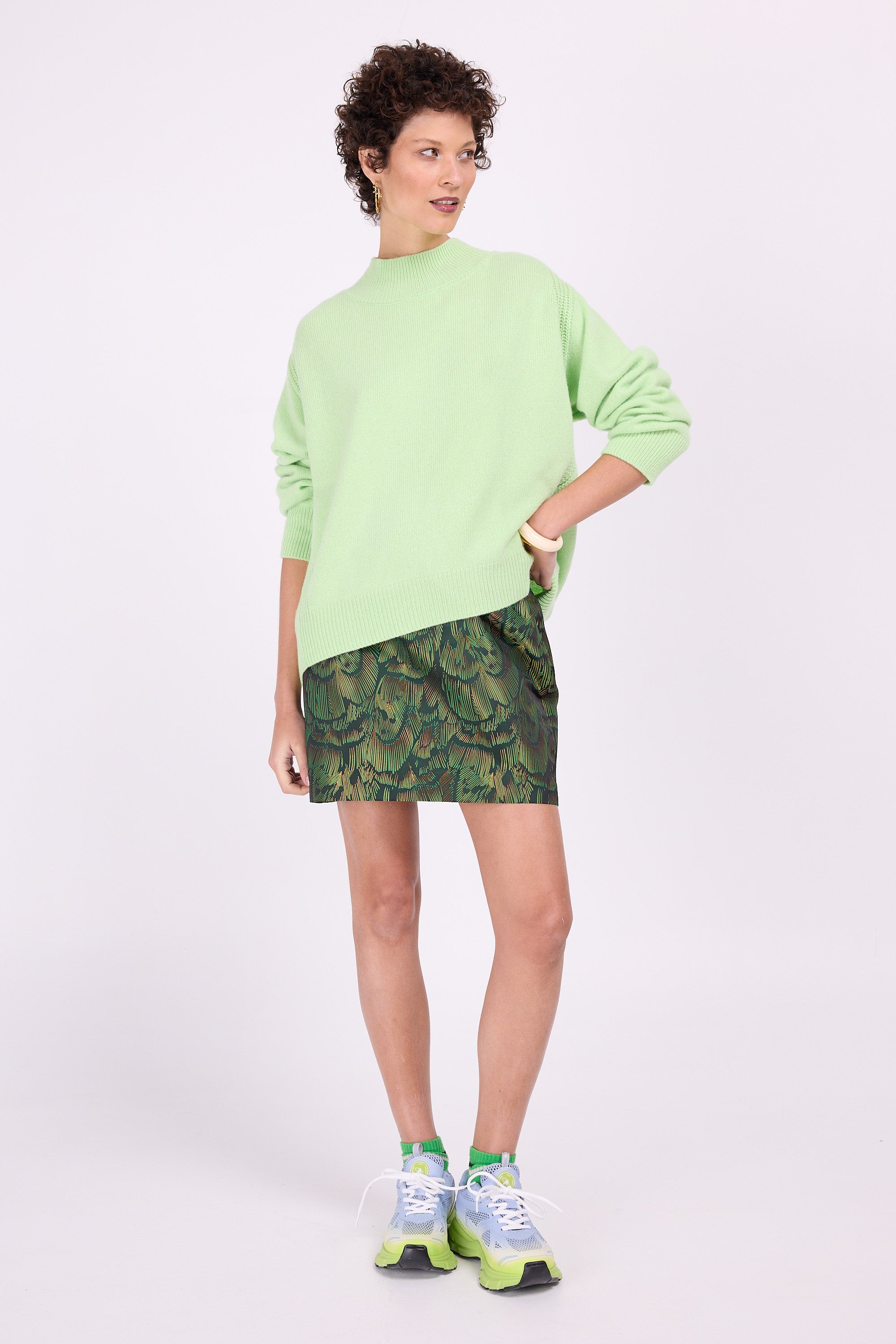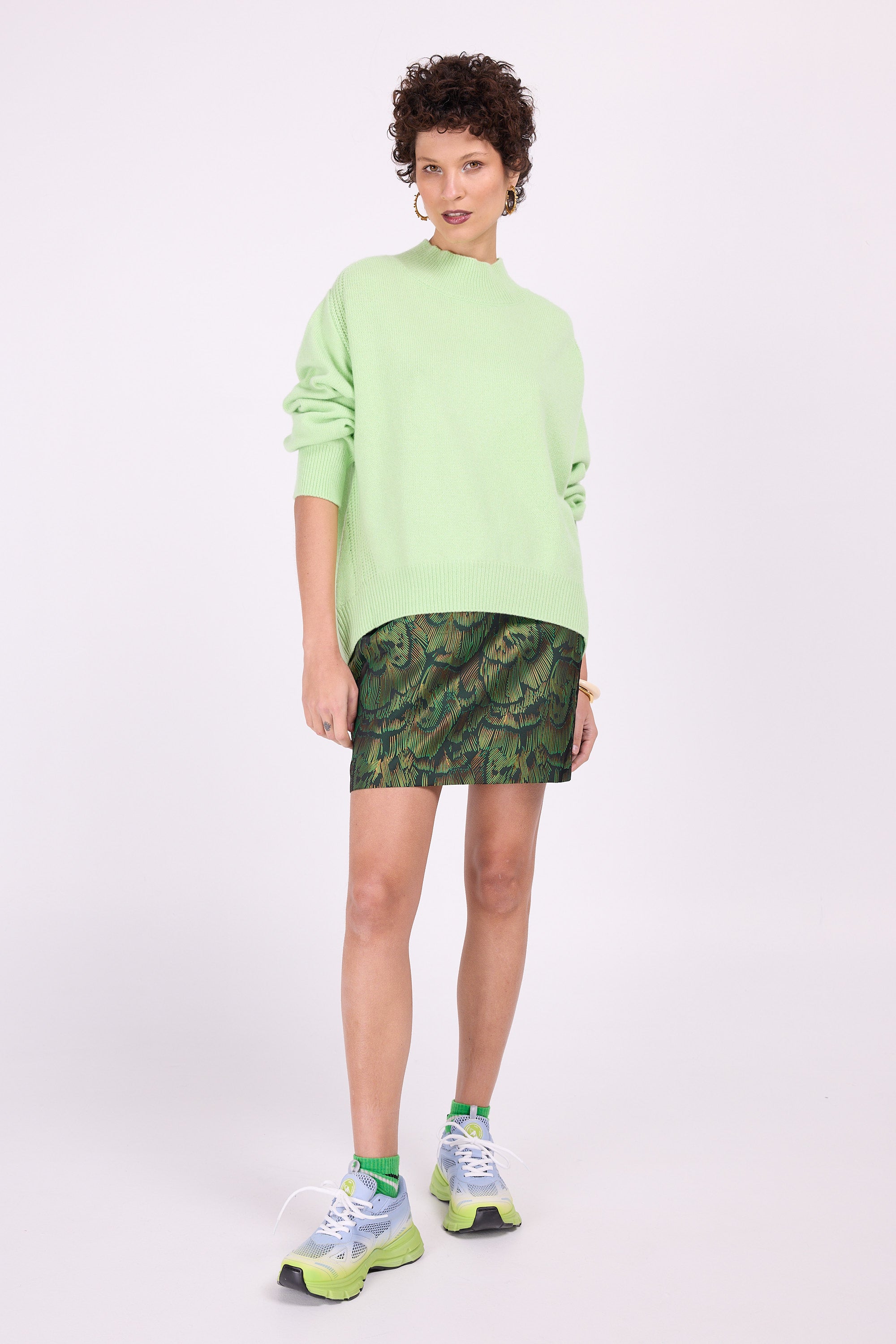 Minirock aus Libellen-Jacquard mit glänzendem Goldmetallic-Effekt. Mini-Teil für Maxi-Spaß.