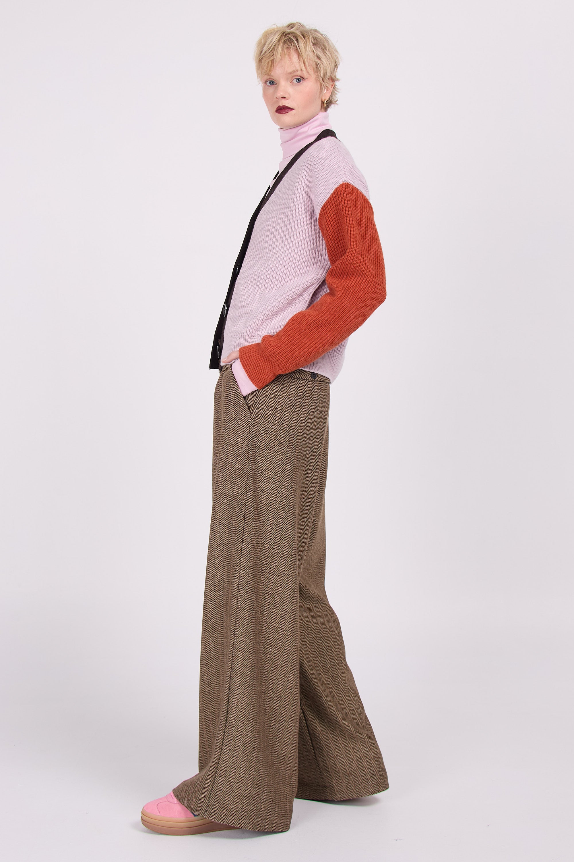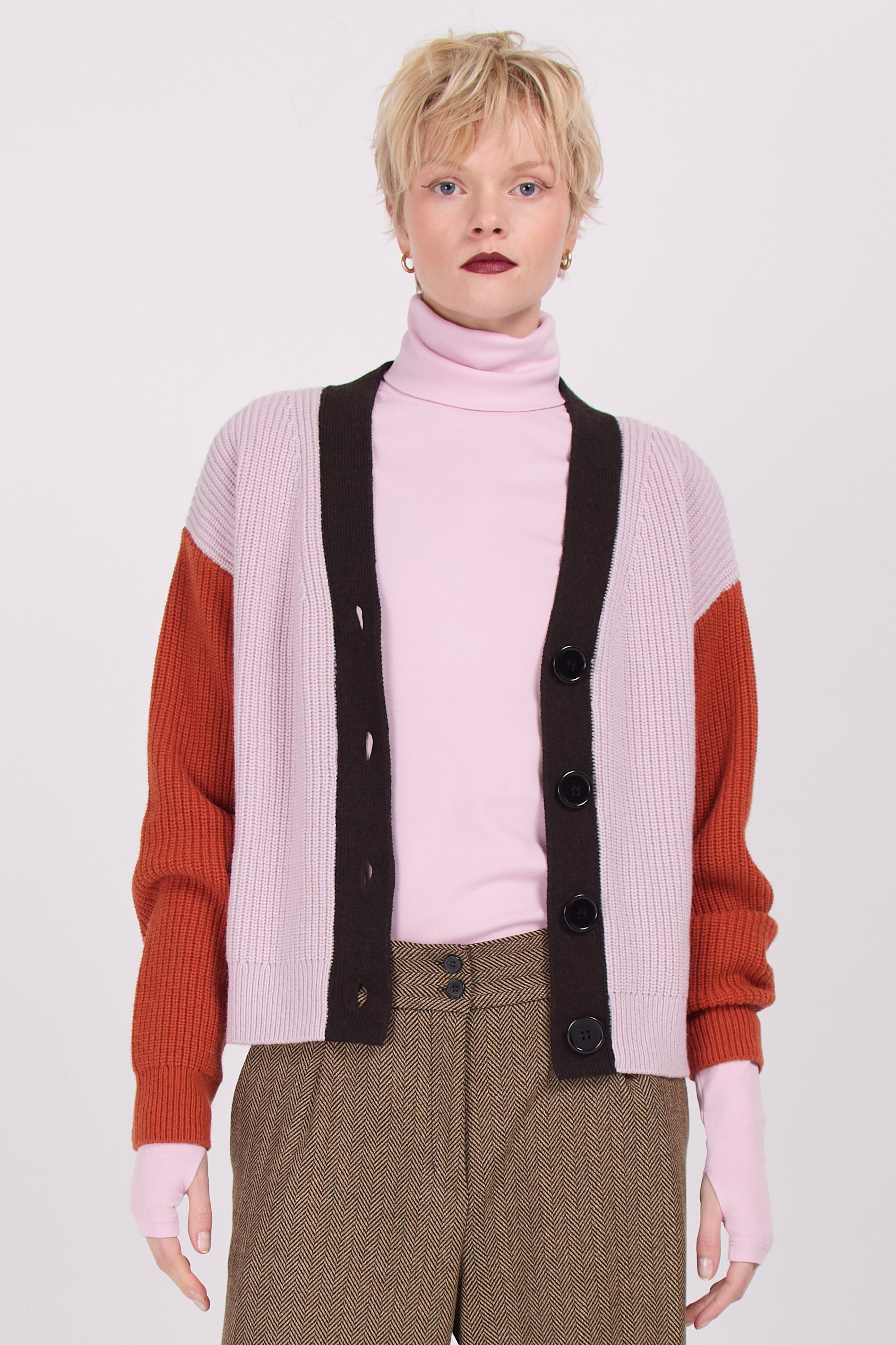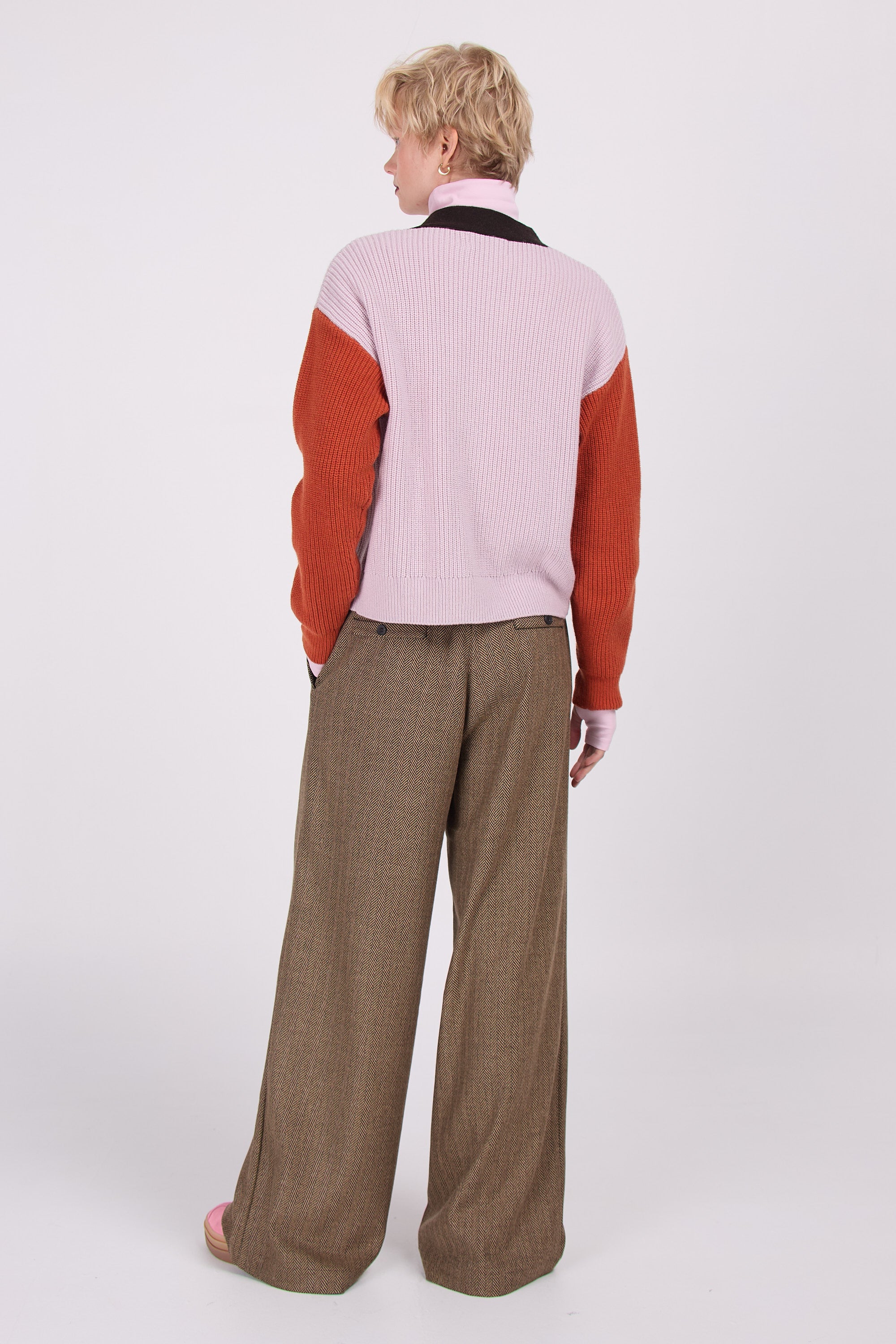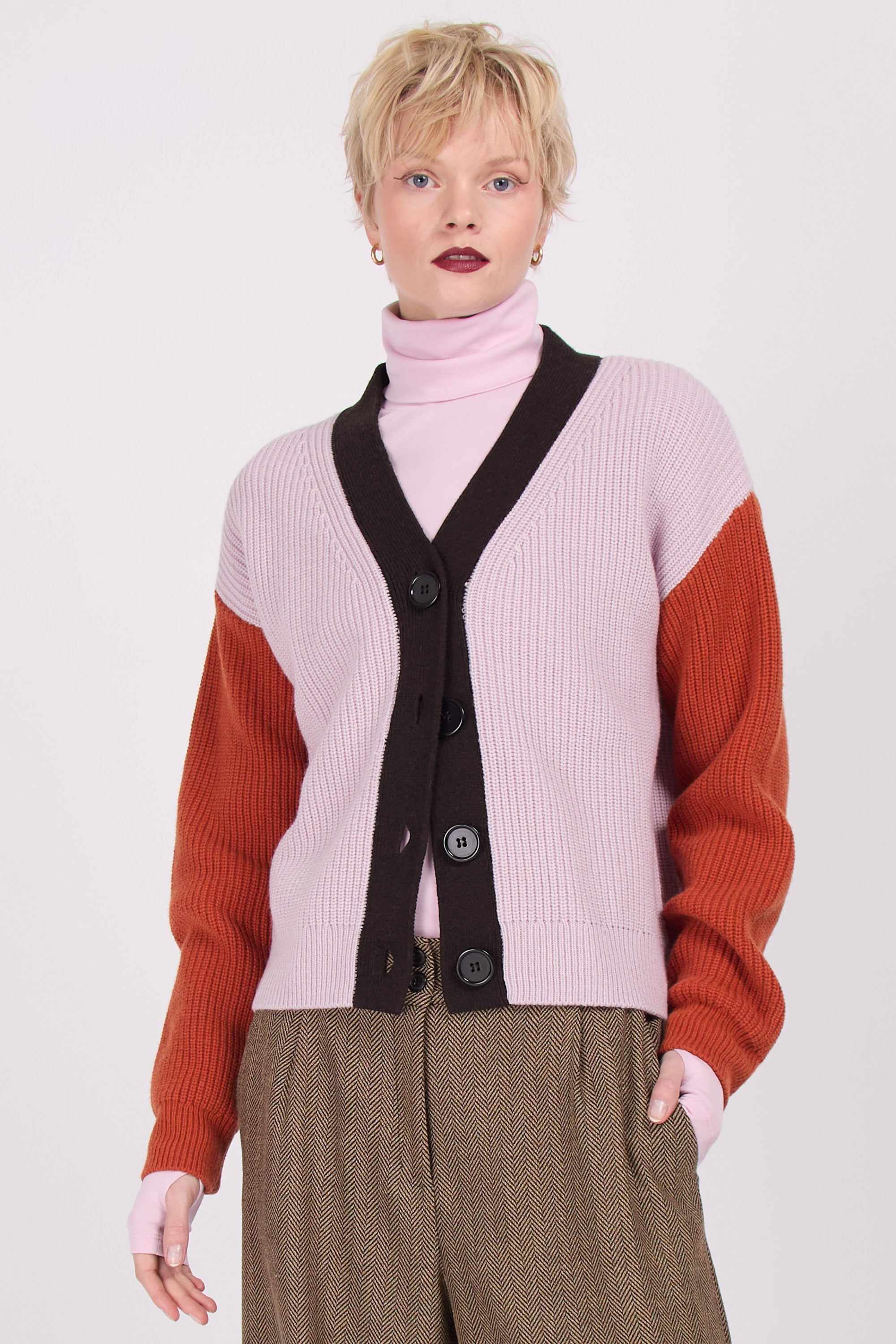 Majuro hält Sie den ganzen Winter lang warm. Im Herbst kann man diese auch als Jacke draußen tragen. Die großen Knospen und das gerippte Muster bestimmen den Charakter, in der Dreifarbkombination aus Flieder, Rost und Dunkelbraun wird es zu einem wirklich originellen Topteil.