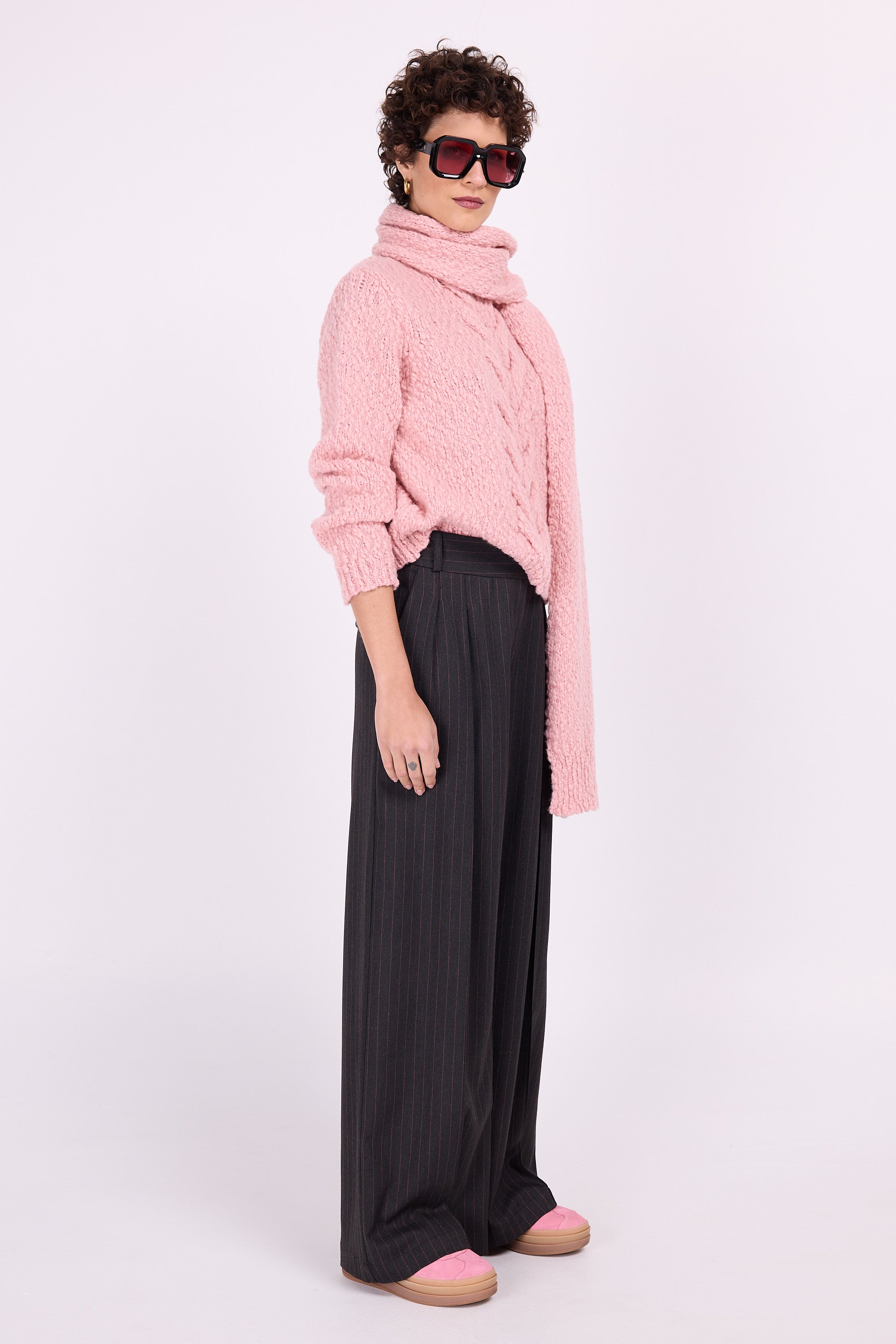 Nach zwei Saisons ist Cezar aus der Kollektion nicht mehr wegzudenken. Diese Hose hat großzügiges Volumen an den Beinen, die Bügelfalten sorgen für einen schönen Fall, die aufgenähten Abnäher verleihen Ihrer Silhouette Länge. Diese Version ist aus braunem Twill mit rosa Nadelstreifen gefertigt.