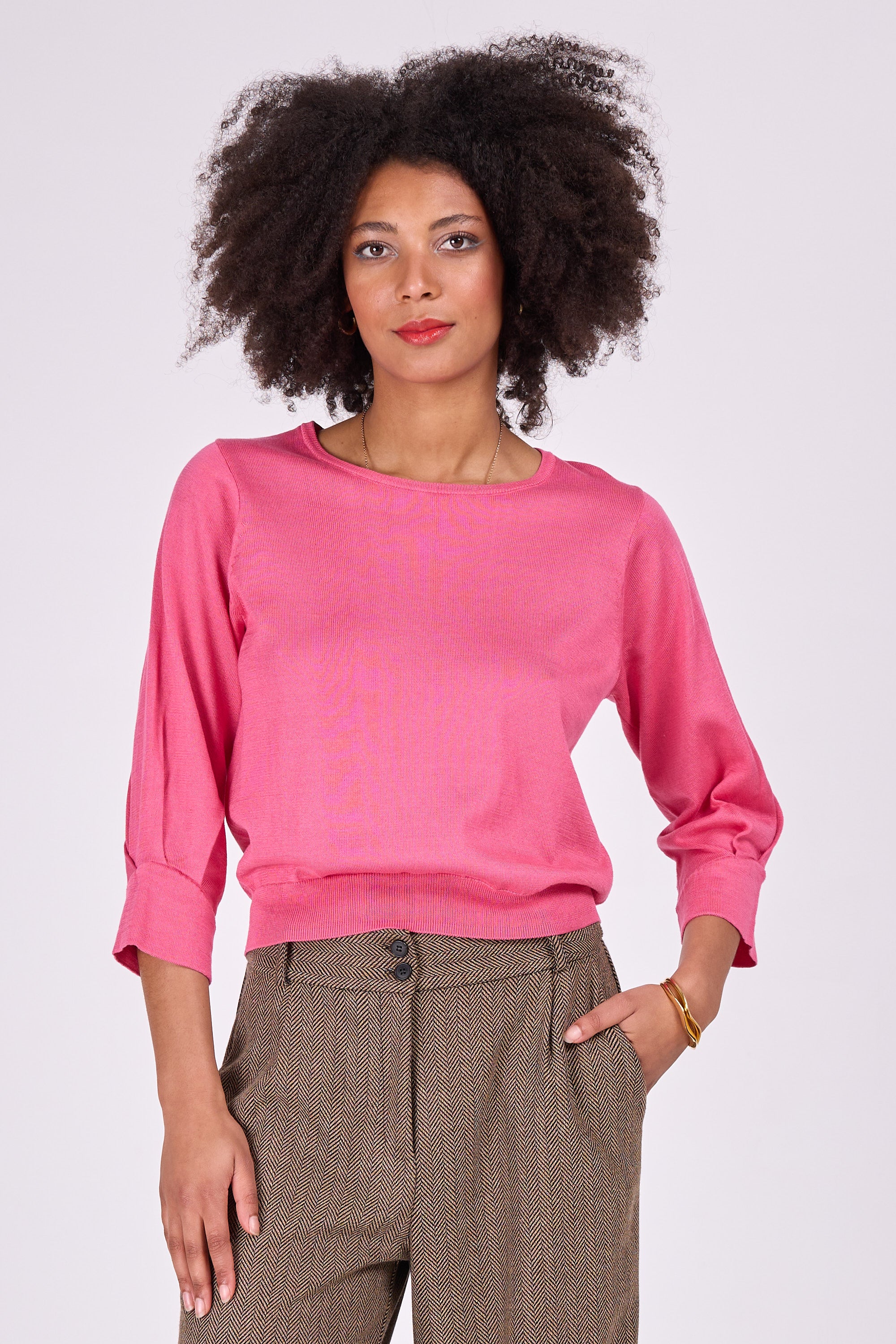 Passepartout-Pullover mit edler Falte am 7/8-Ärmel, ein fester Bestandteil der Kollektion. In dieser Saison aus Satin-Baumwolle gestrickt.