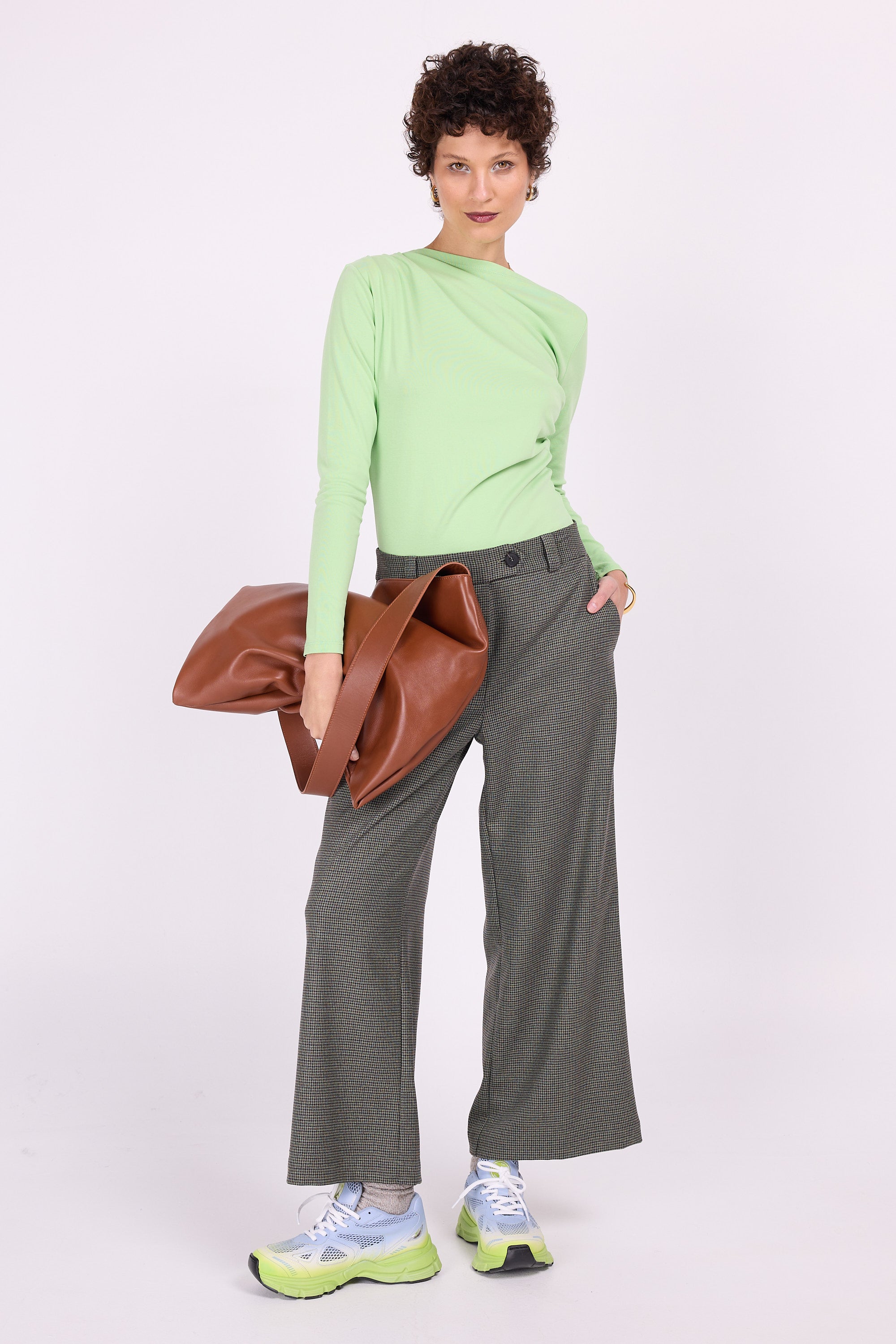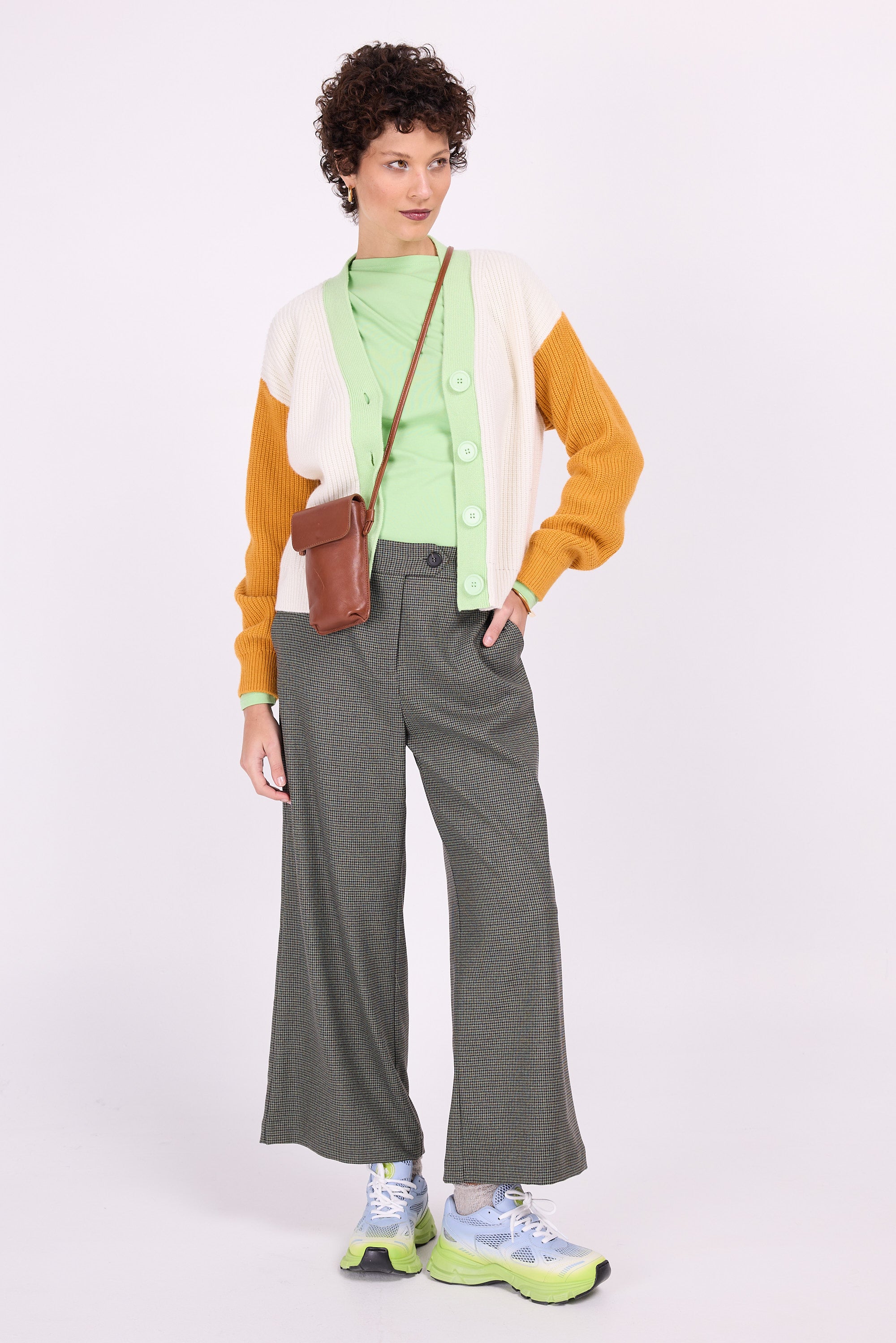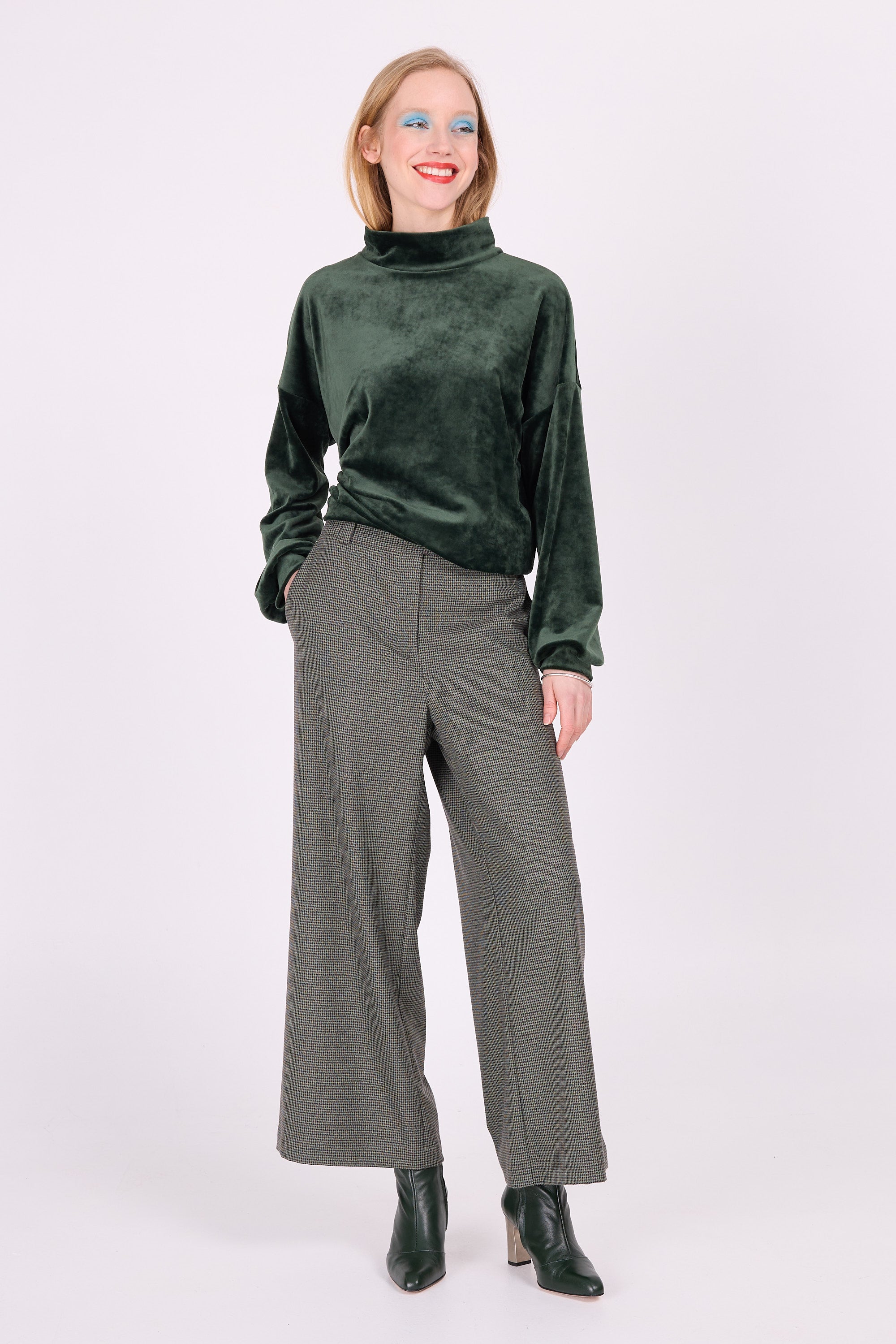 Dong hat eine bequeme Passform, eine verspielte 7/8-Länge und ein schönes gerades Volumen an den Beinen. Durch die etwas kürzere Länge ist dieses Modell auch bei kleineren Frauen sehr beliebt. Hergestellt aus weichem grünbraunem Stoff mit Hahnentrittmuster.