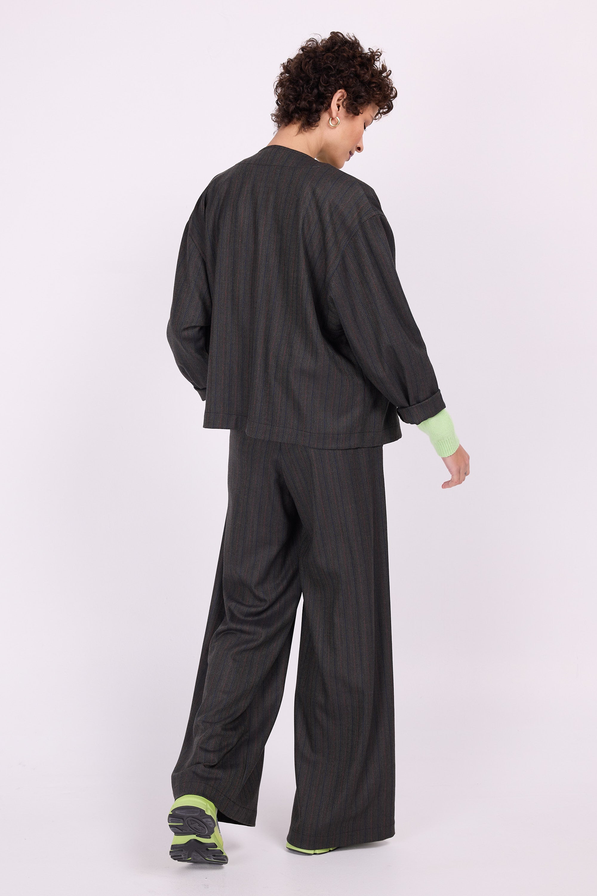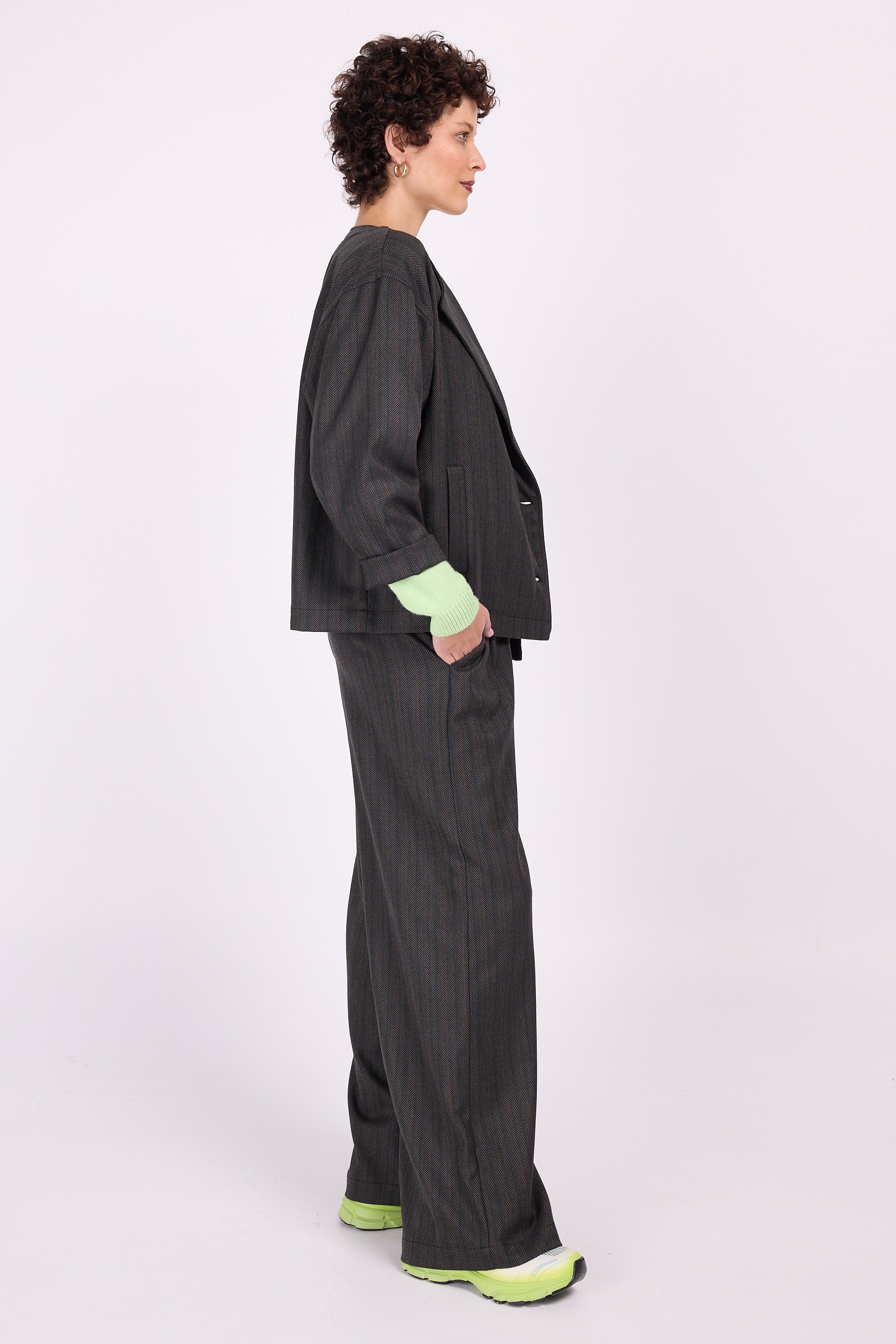 Lässige Jacke, die Sie problemlos zu allem tragen können. Charel ist nicht gefüttert, aber mit seinen weiten Ärmeln und geräumigen Schultern können Sie es mühelos über den dicksten Pullovern tragen. Dadurch können Sie es lange tragen: vom ersten frischen Herbstmorgen bis zum dunkelsten Winterabend. In dieser Version besteht die Jacke aus einem gewebten Stoff mit Fischgrätenmuster und rosa Akzentstreifen. Vervollständigen Sie den Look, indem Sie es mit Hosen von Zoëlla oder Annie aus demselben Stoff kombinieren.