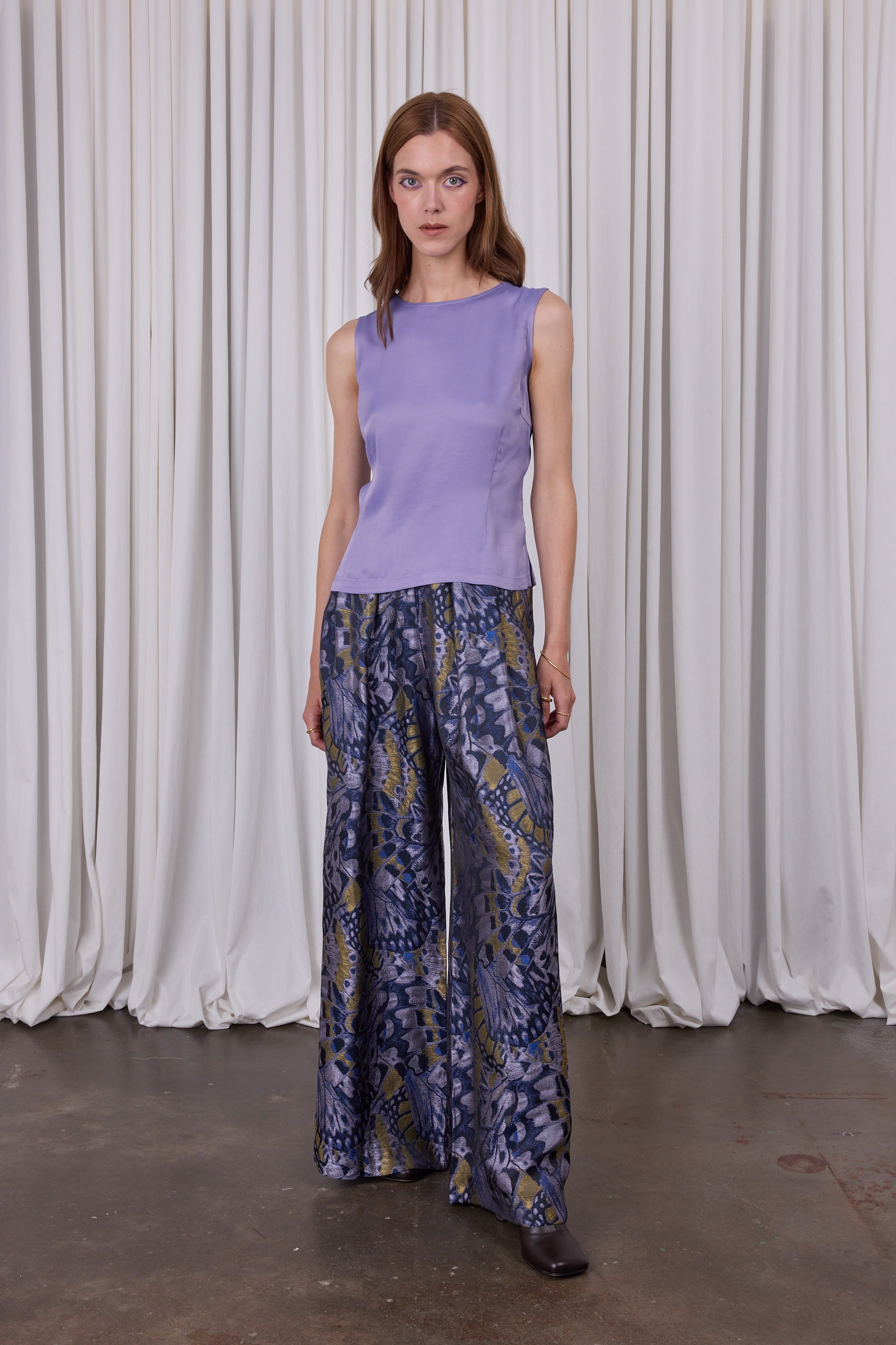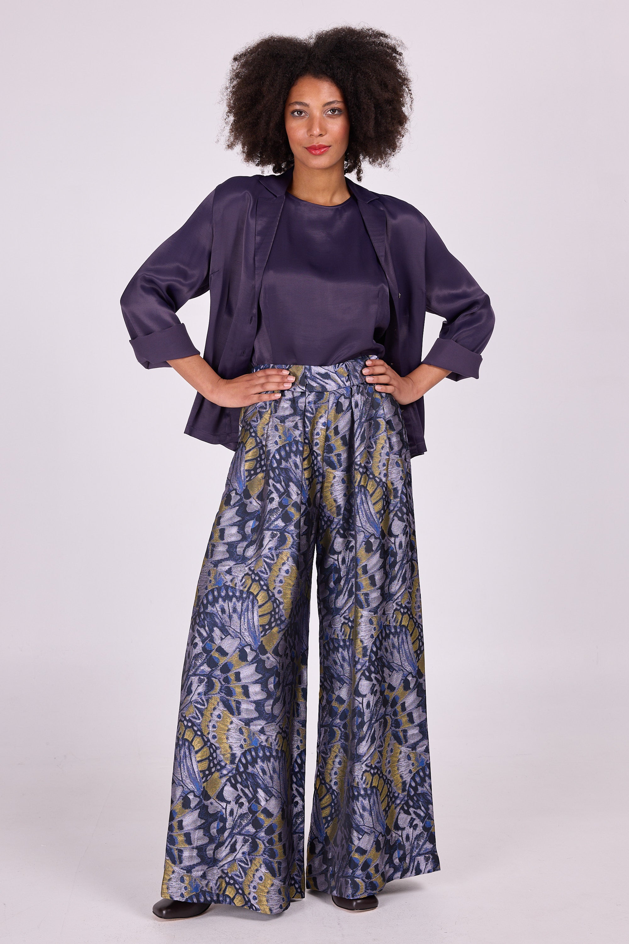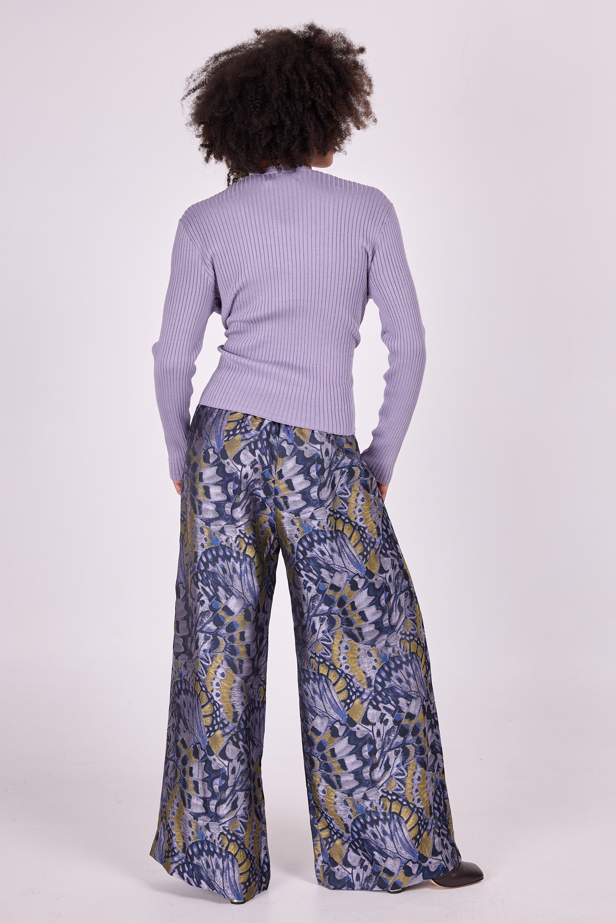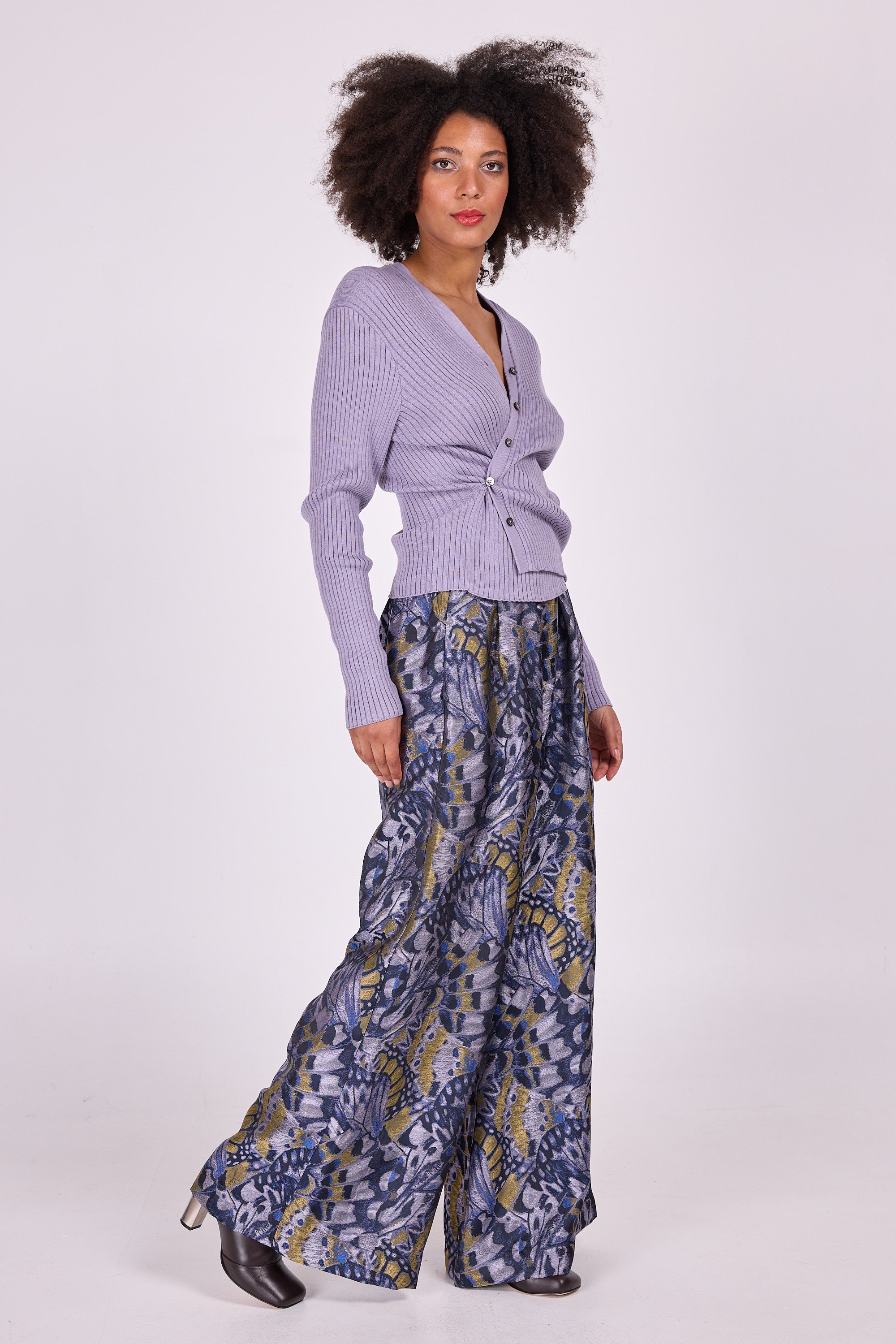 Voluminöse Hose aus anschmiegsamem Stoff, der ihr fast den Look einer Culotte verleiht. Diese Variante aus weich fallendem Jacquard mit eingewebtem Schmetterlingsprint besticht durch wunderschöne Farbtöne, die von Gold und Flieder bis hin zu Kobaltblau und Dunkelviolett reichen.