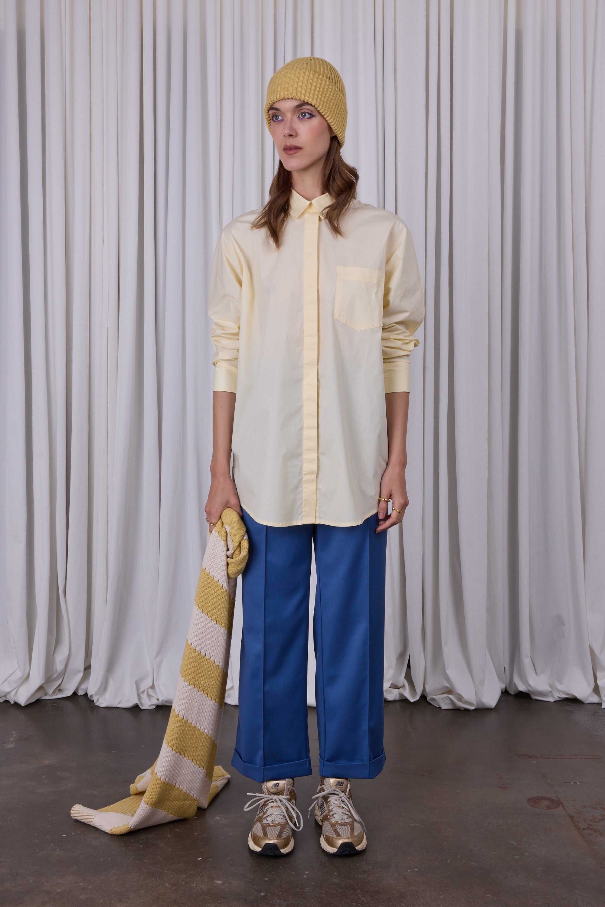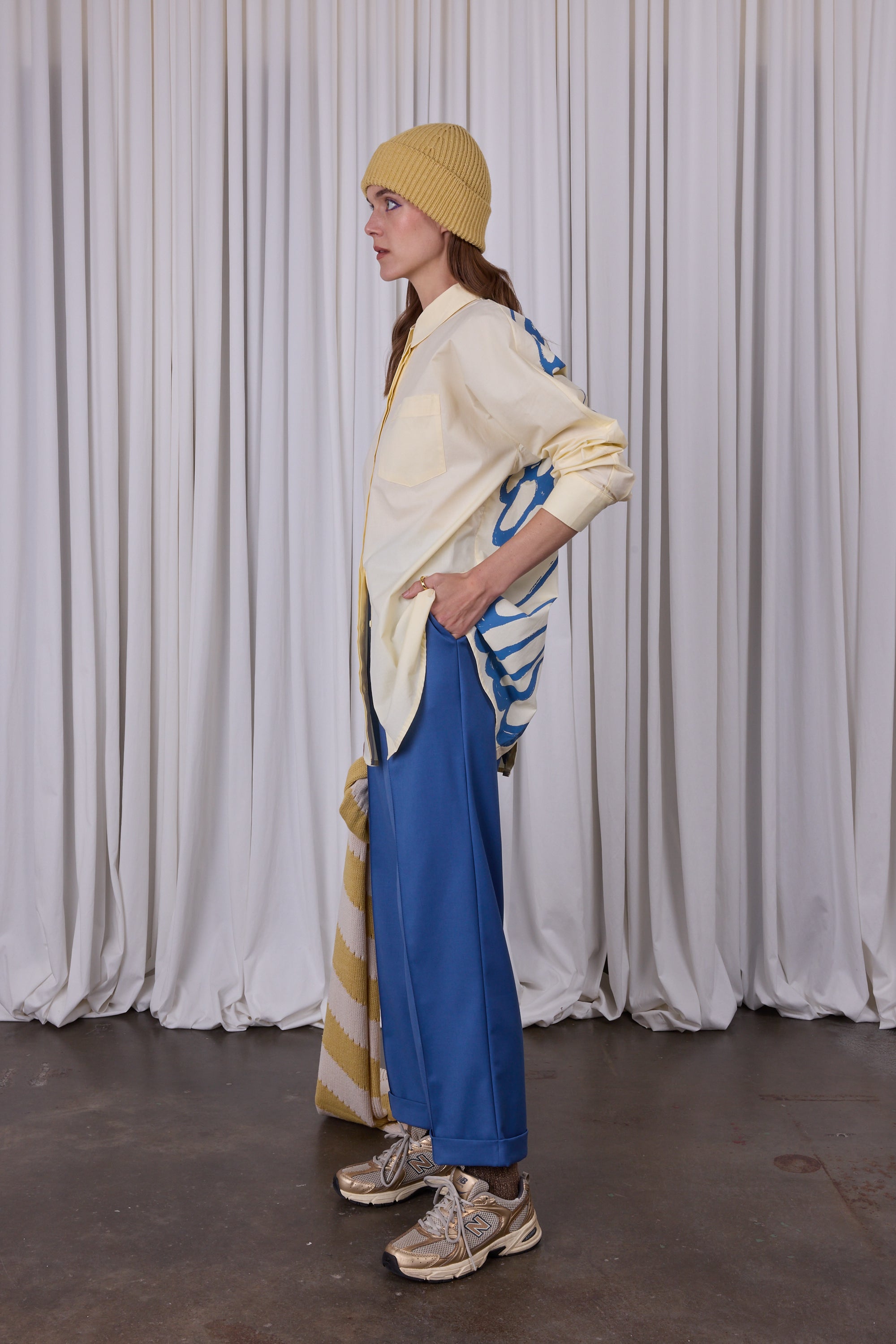 Enzo ist eine Mischung aus weiter und enger Hose. Durch die geraden Beine und die abgesteppten Abnäher wirkt es streckend. Durch die Falte wird die Hose etwas verspielter und lässt sich ideal mit Boots kombinieren.