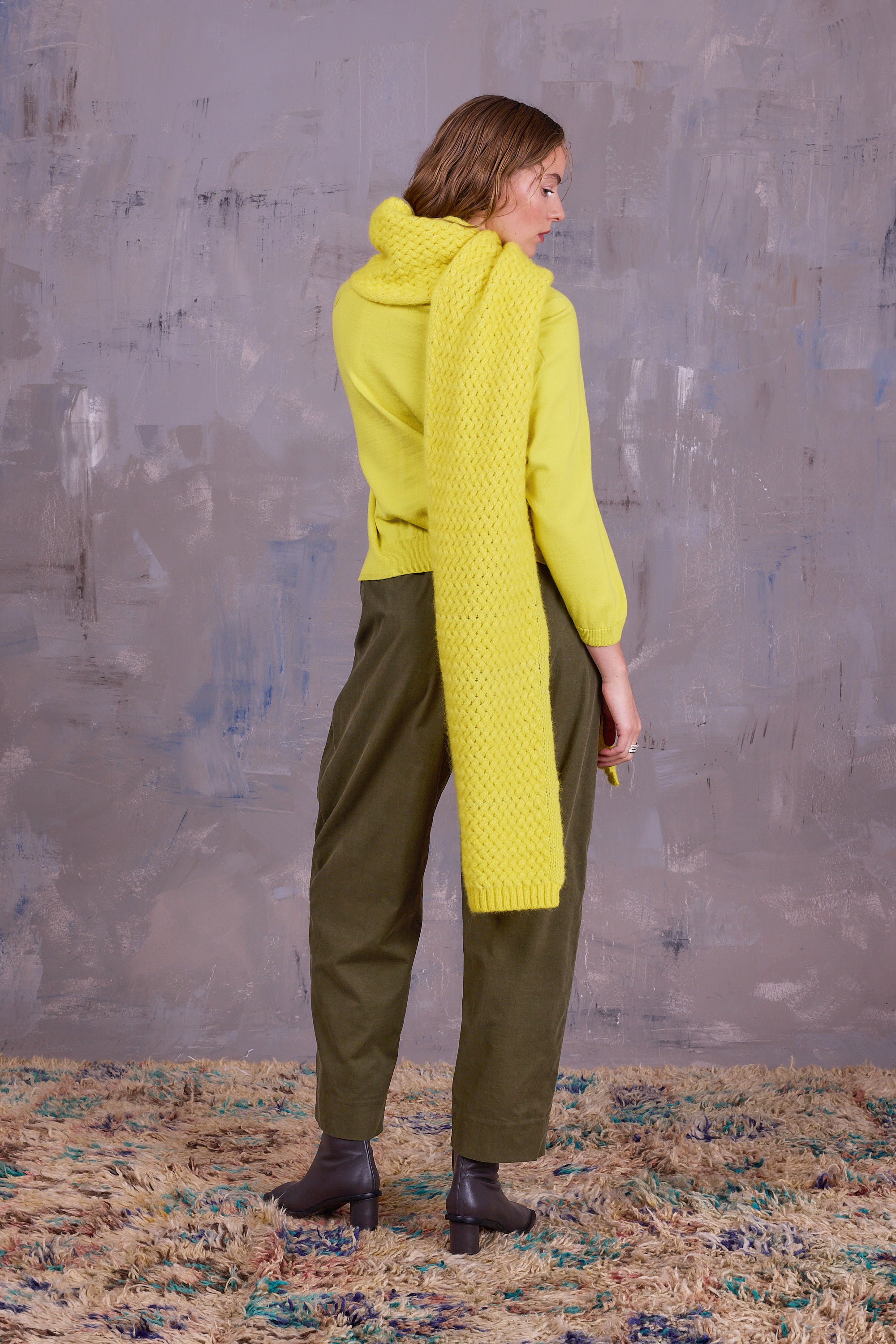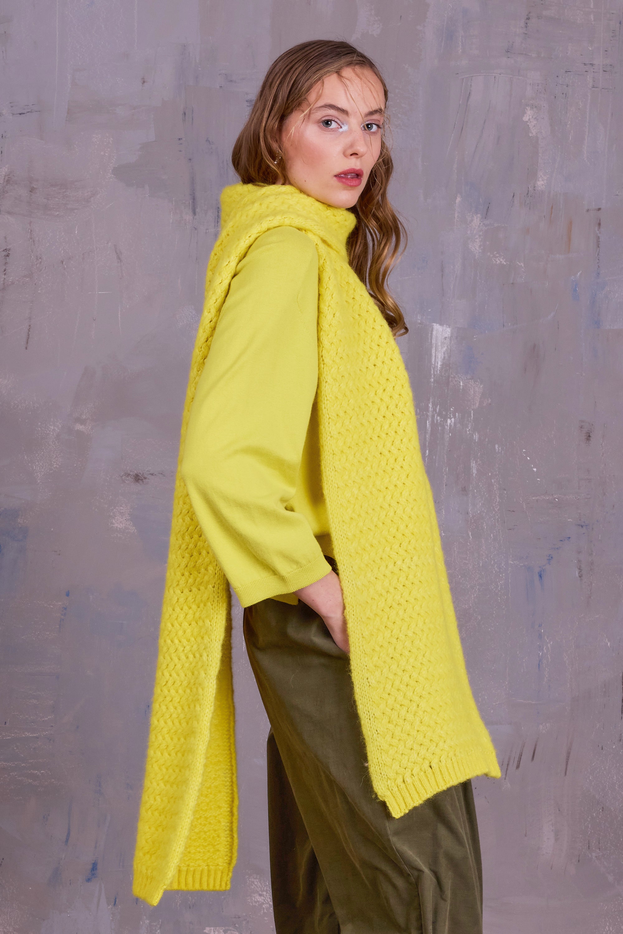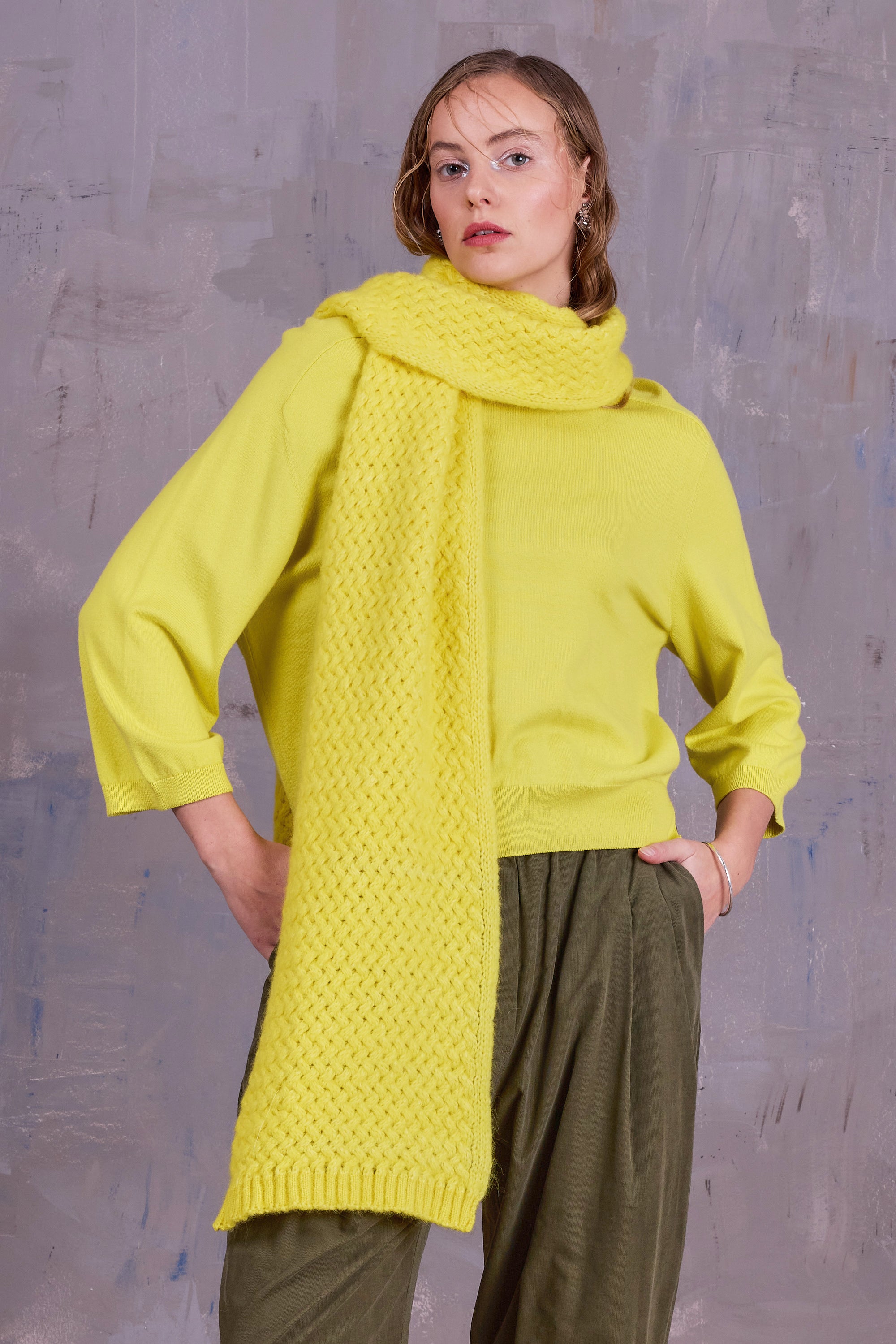 Schal mit gewebtem Muster, gestrickt in Belgien aus einem flauschigen Garn: eine 100% natürliche Mischung aus Baby-Alpaka, Baumwolle und Merinowolle.