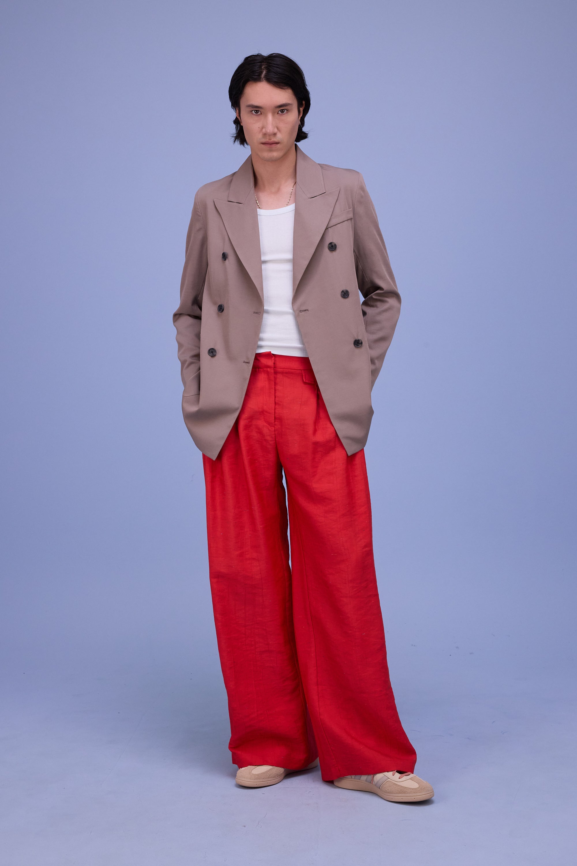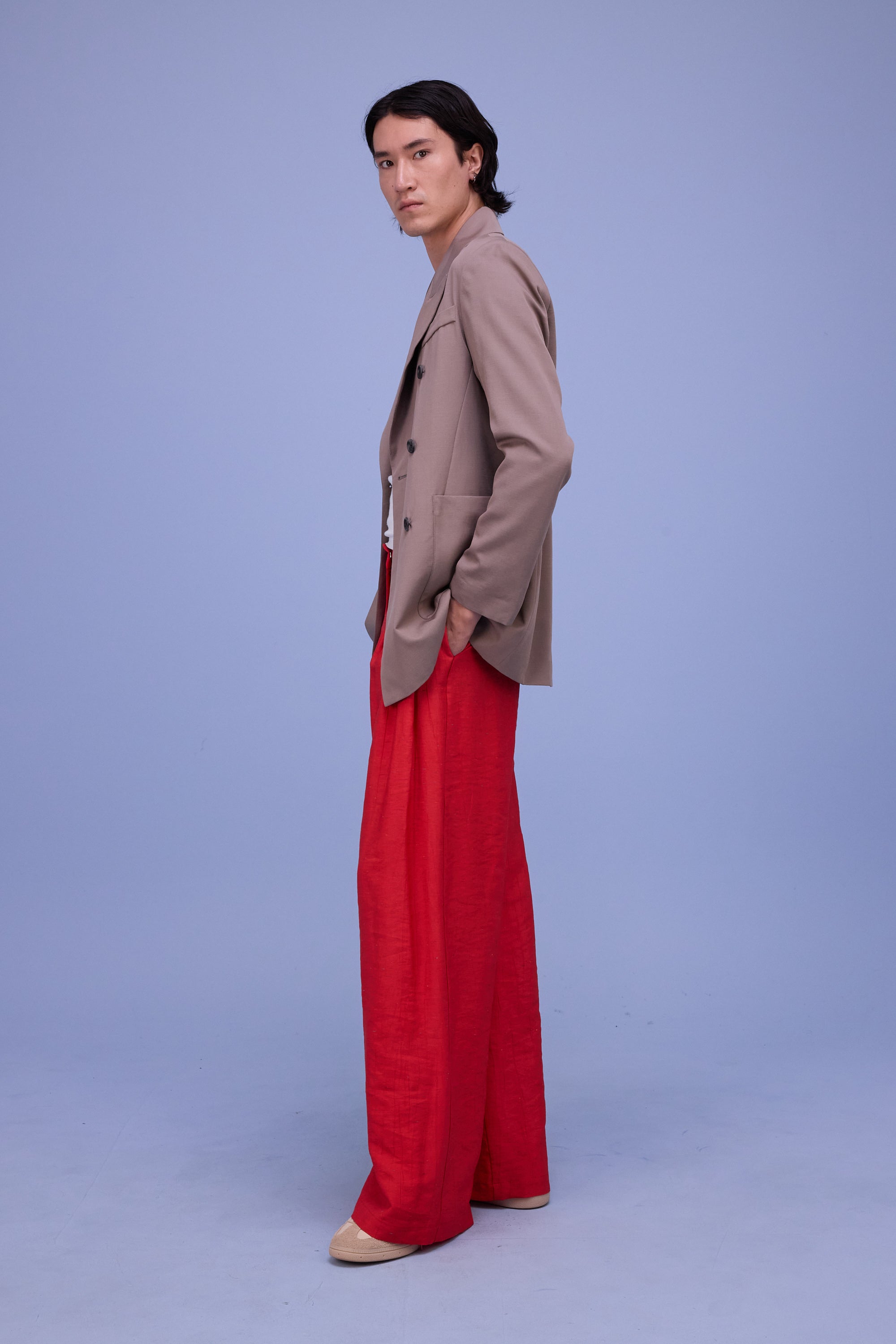 Dieser taillierte, zweireihige Blazer hat eine markante Knopfleiste, breite Revers und ist lang geschnitten. Glenn wurde in der letzten Saison eingeführt und ist diese Saison in einem neuen Stoff zurück: dem glänzenden Denim – festes Baumwollgewebe mit einer glänzenden Beschichtung.