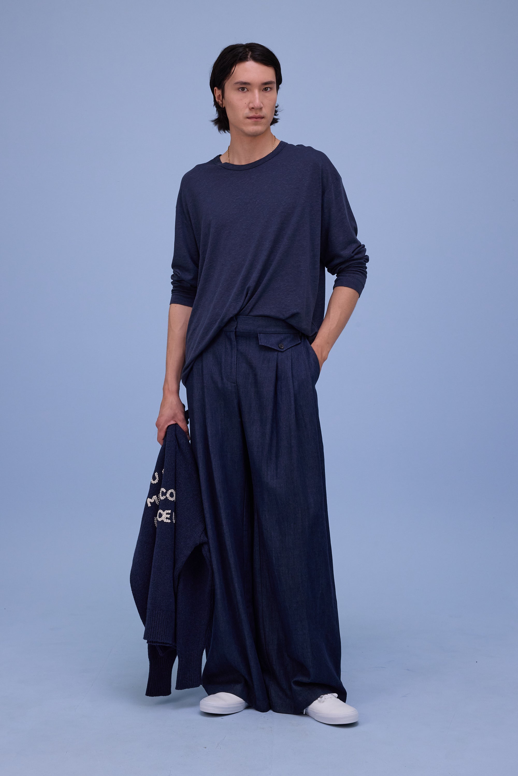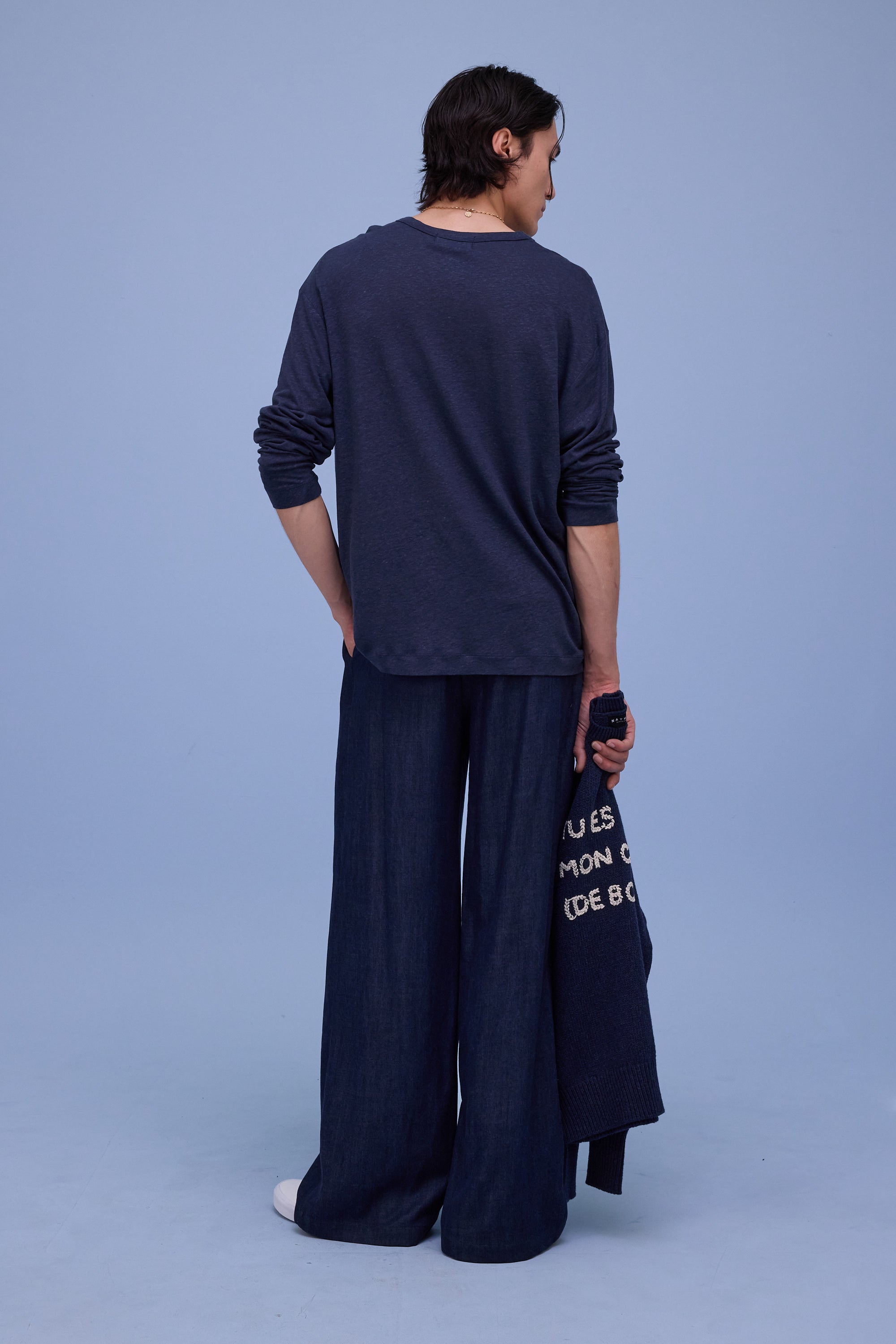 Guy ist die neue Go-to-Palazzohose mit großzügiger Länge und weitem Bein sowie einer eleganten Taille. Die aufgesetzte Klappe suggeriert eine Tasche und macht die Hose sofort erkennbar.