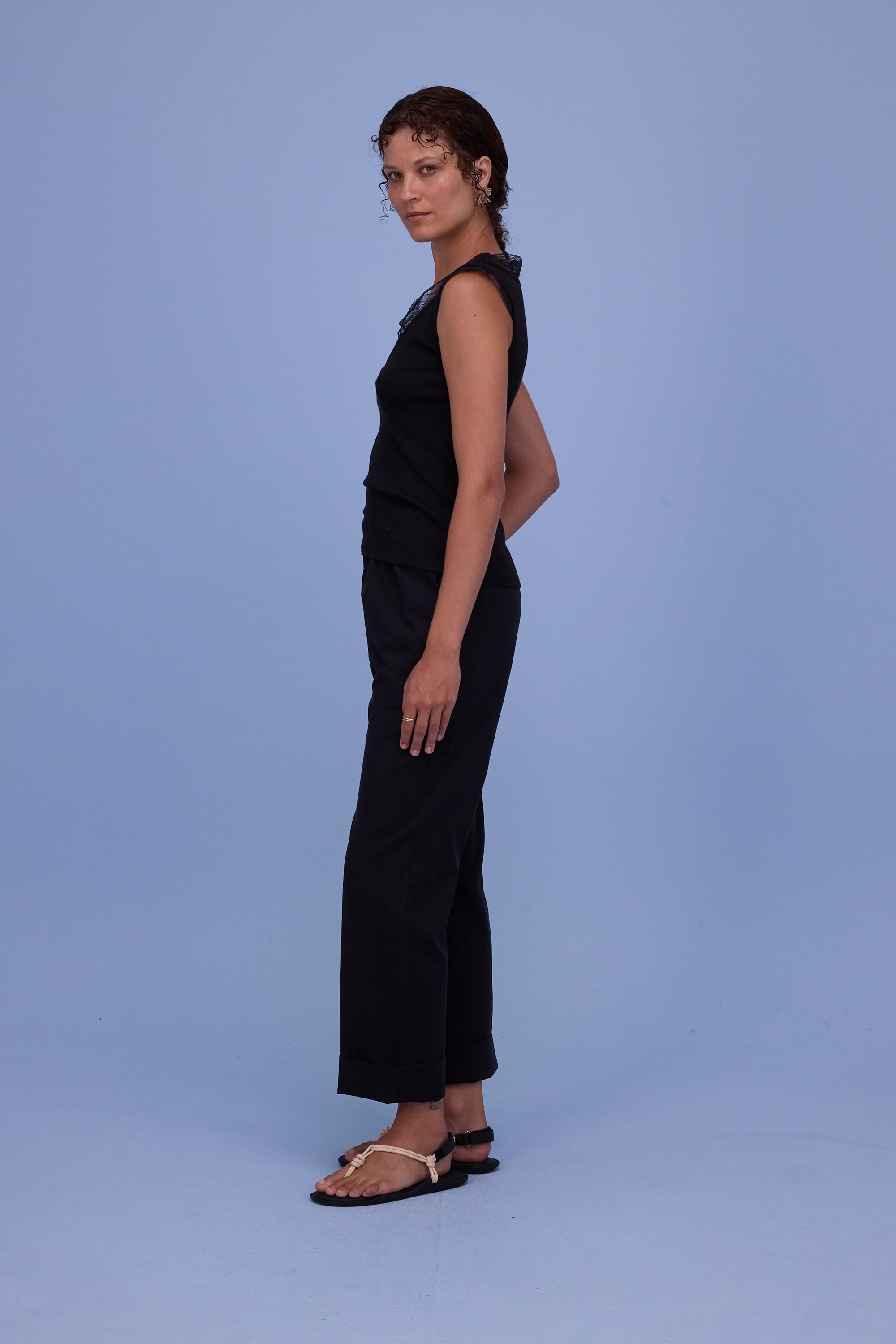 Oberteil aus weichem, dehnbarem Rippen-Baumwoll-Mix, um Hals und Armlöcher mit Spitze abgeschlossen. Ein raffiniertes Finish, das eine ansonsten einfache Oberfläche auf ein ganz neues Level hebt.