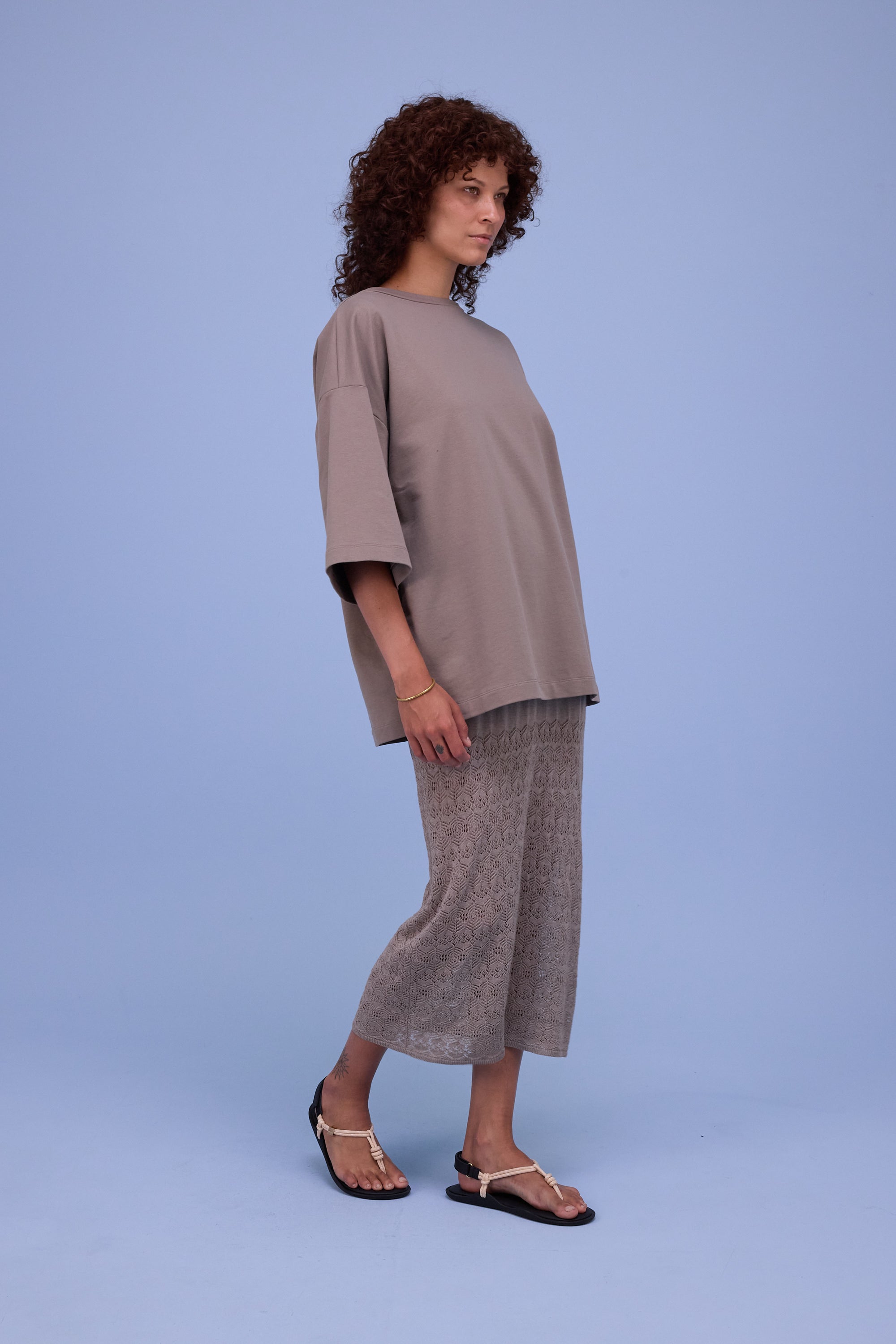 Hyon wird in diesem Look mit dem gestrickten Spitzenkleid Houston kombiniert. Die sichtbare Spitze am Rücken ist kein Bestandteil des Hyon T-Shirts.
