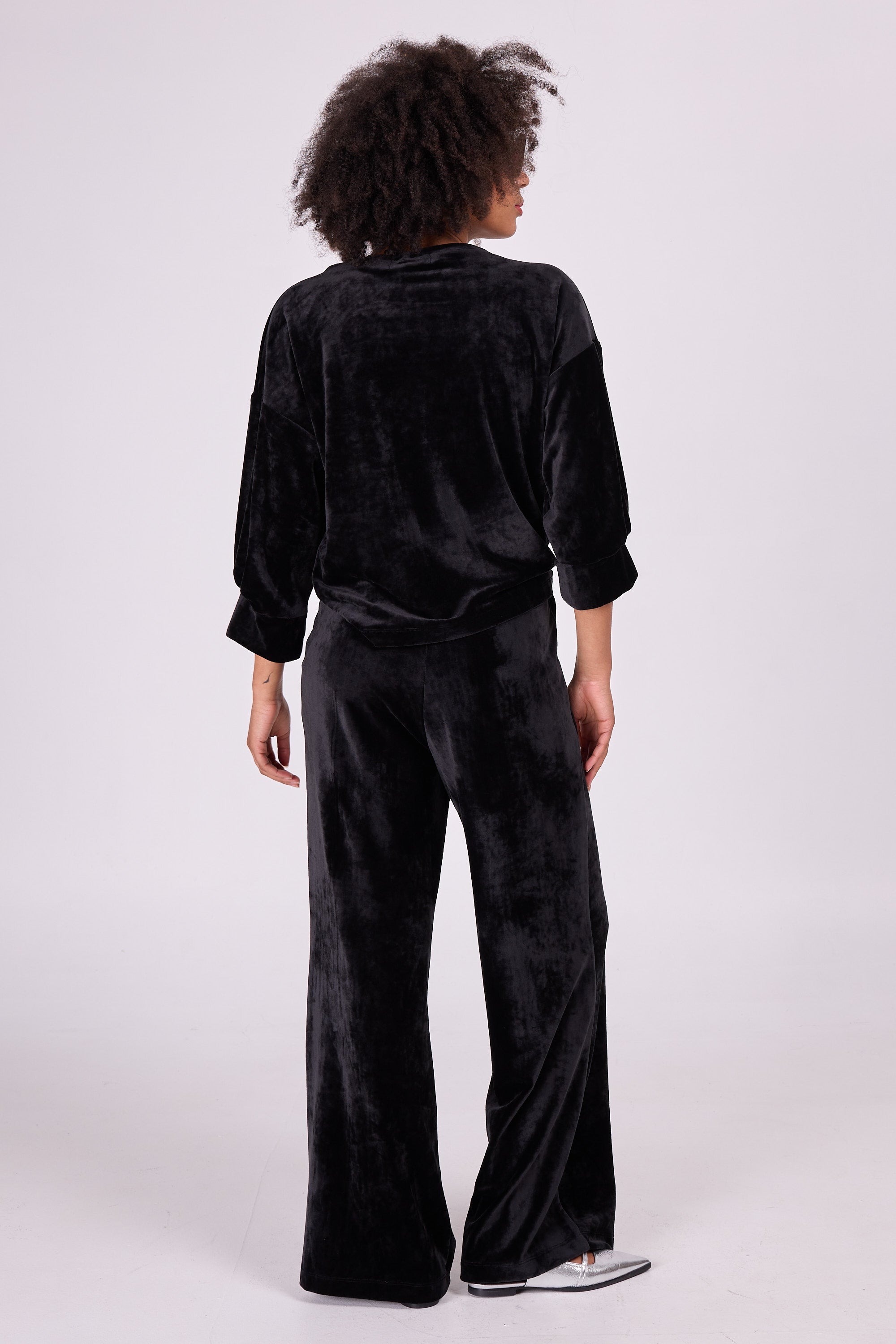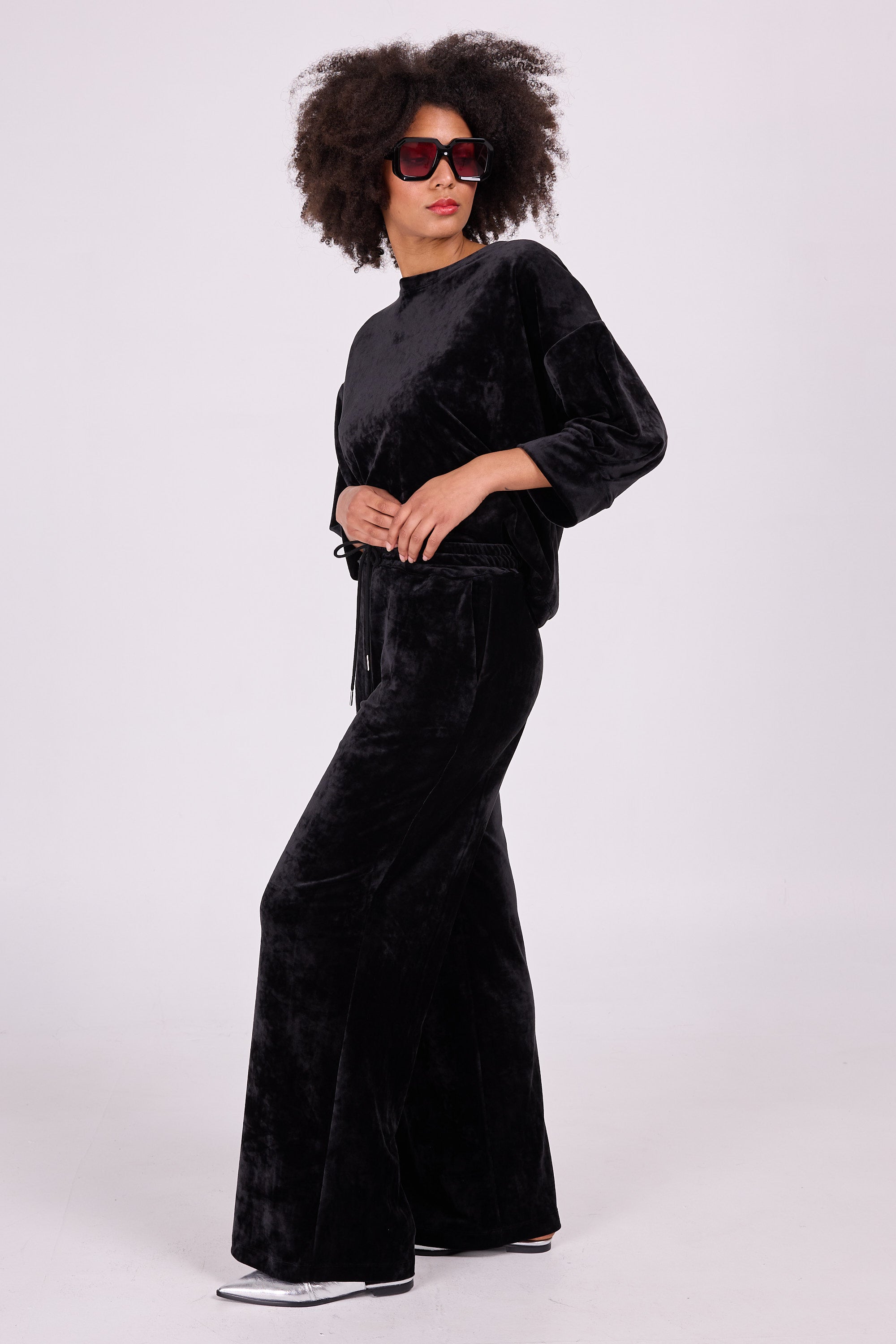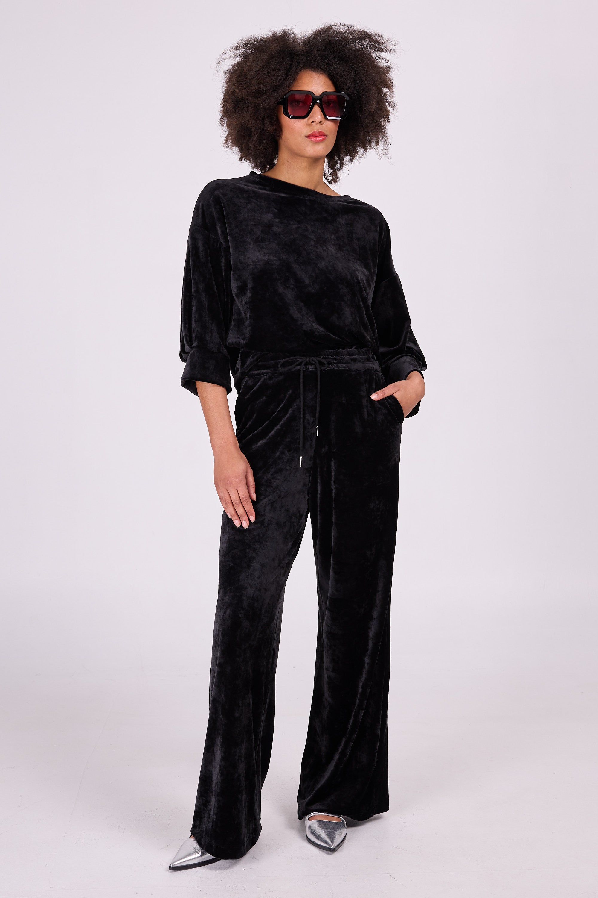 Comfy trousers with wide legs on elastic waistband and waist drawstring. Made in silky soft velvet, so cozy and beautiful that you'll want to keep it on day and night.