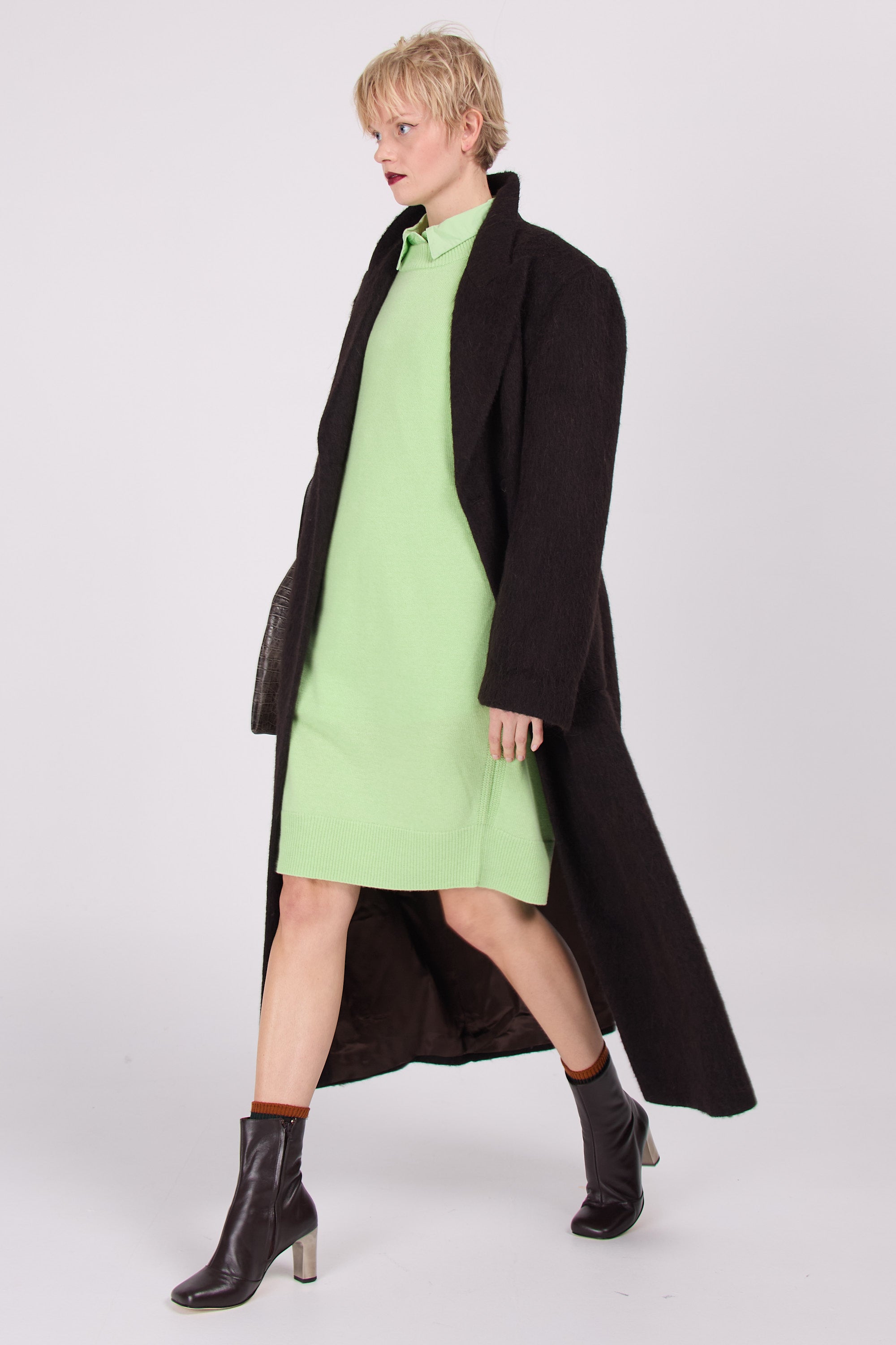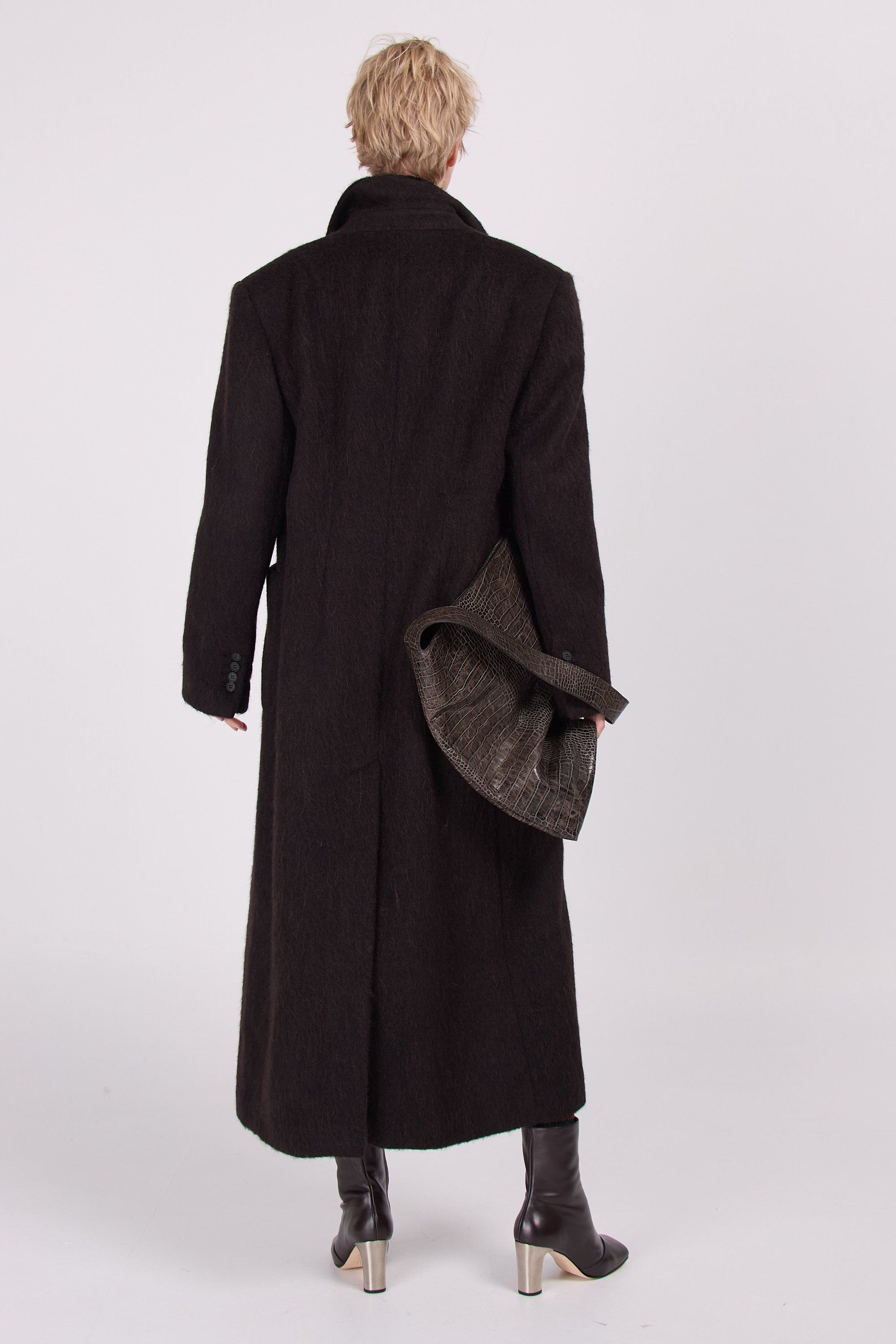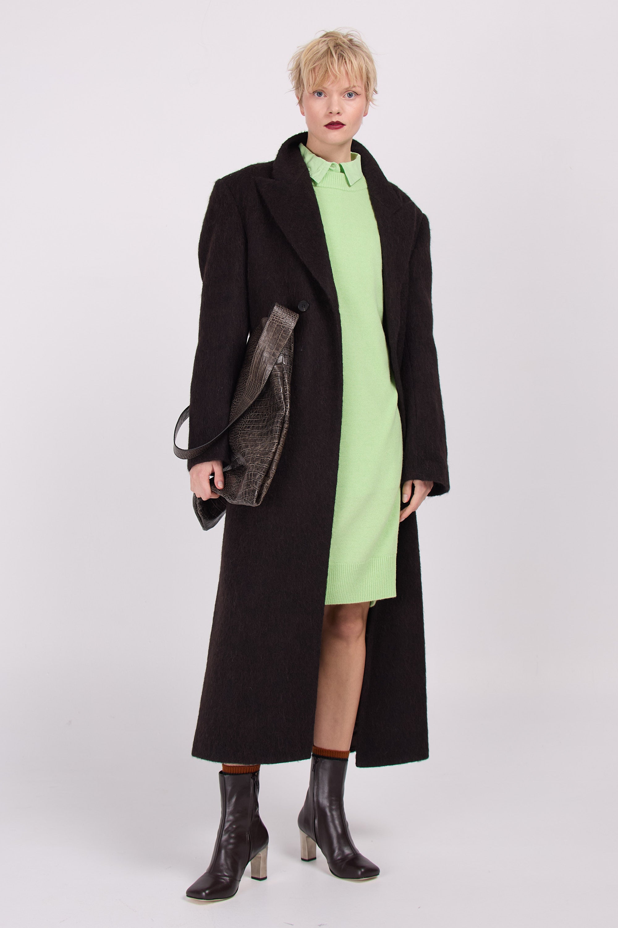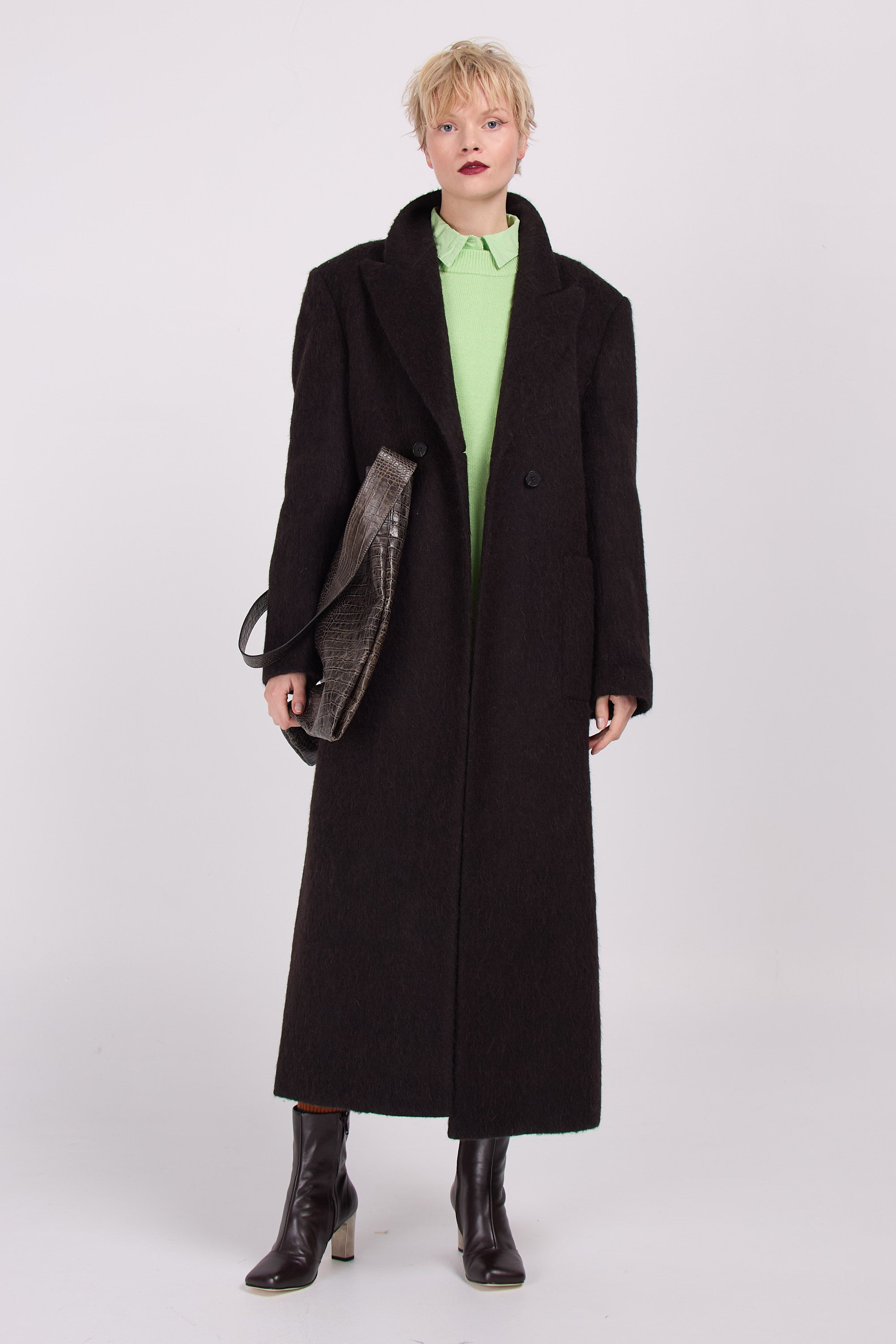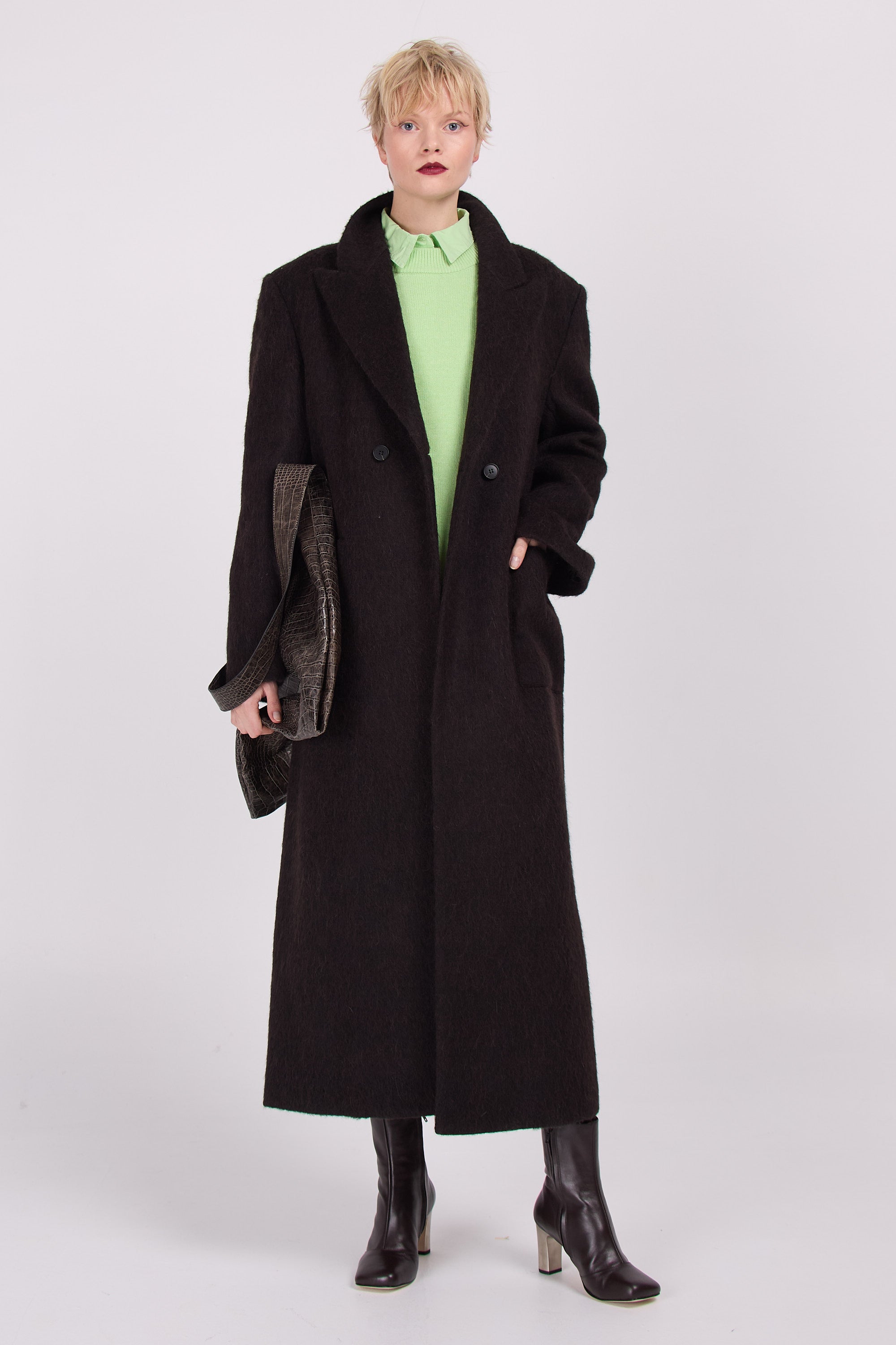 Long coat with 'grandpa chic' vibes. Angular shoulders, a wide collar and a generous length determine the style, the deep brown wool blend makes it timeless and an easy match with the rest of your wardrobe.