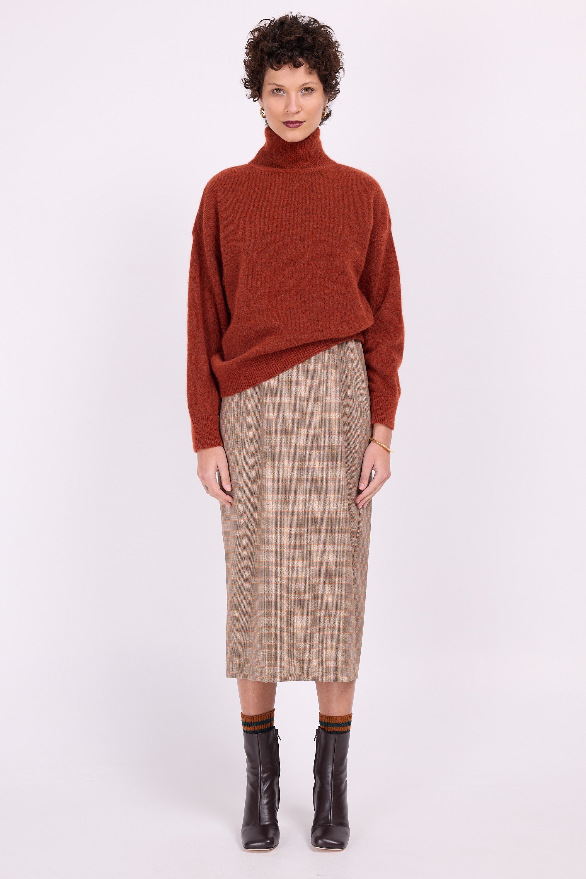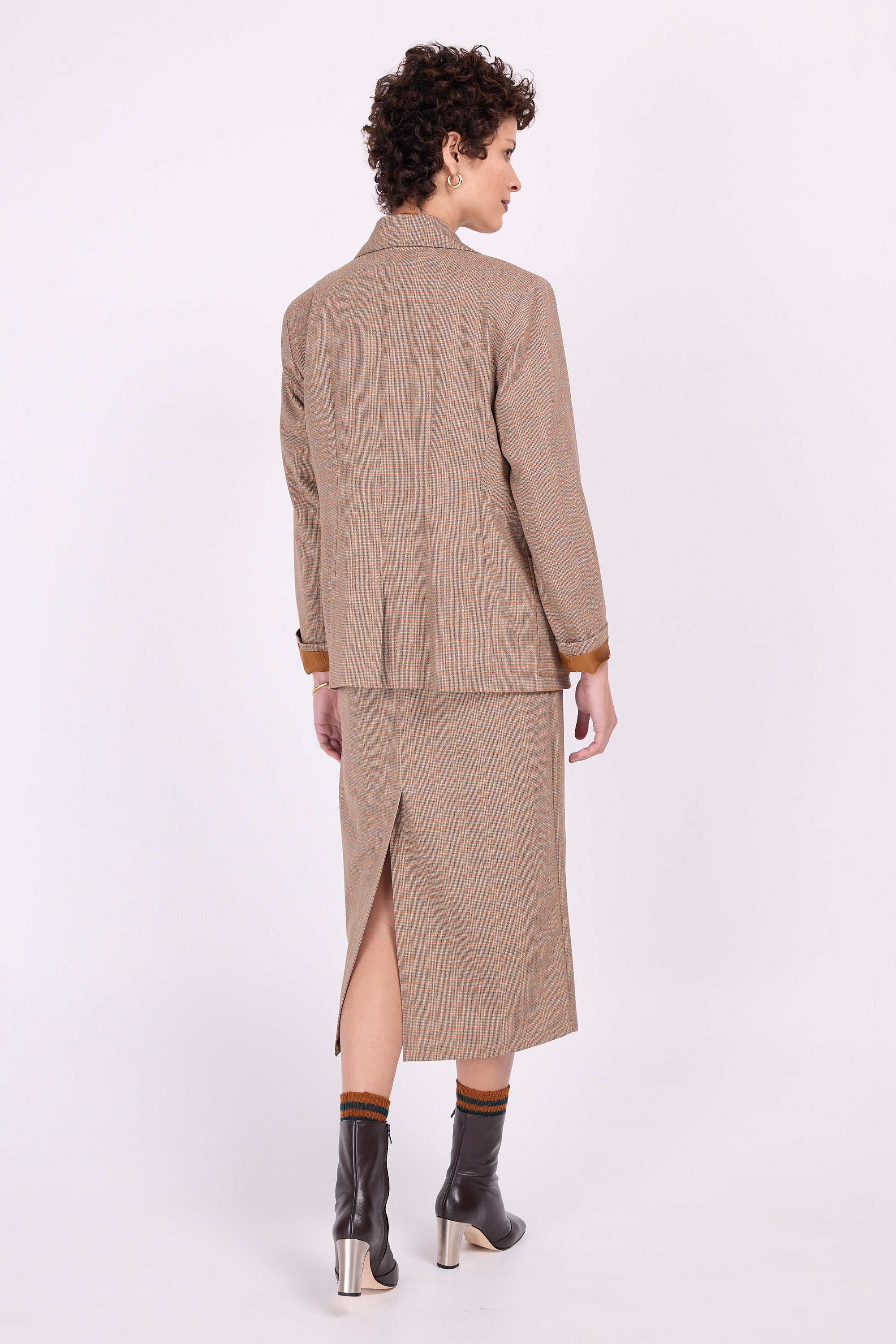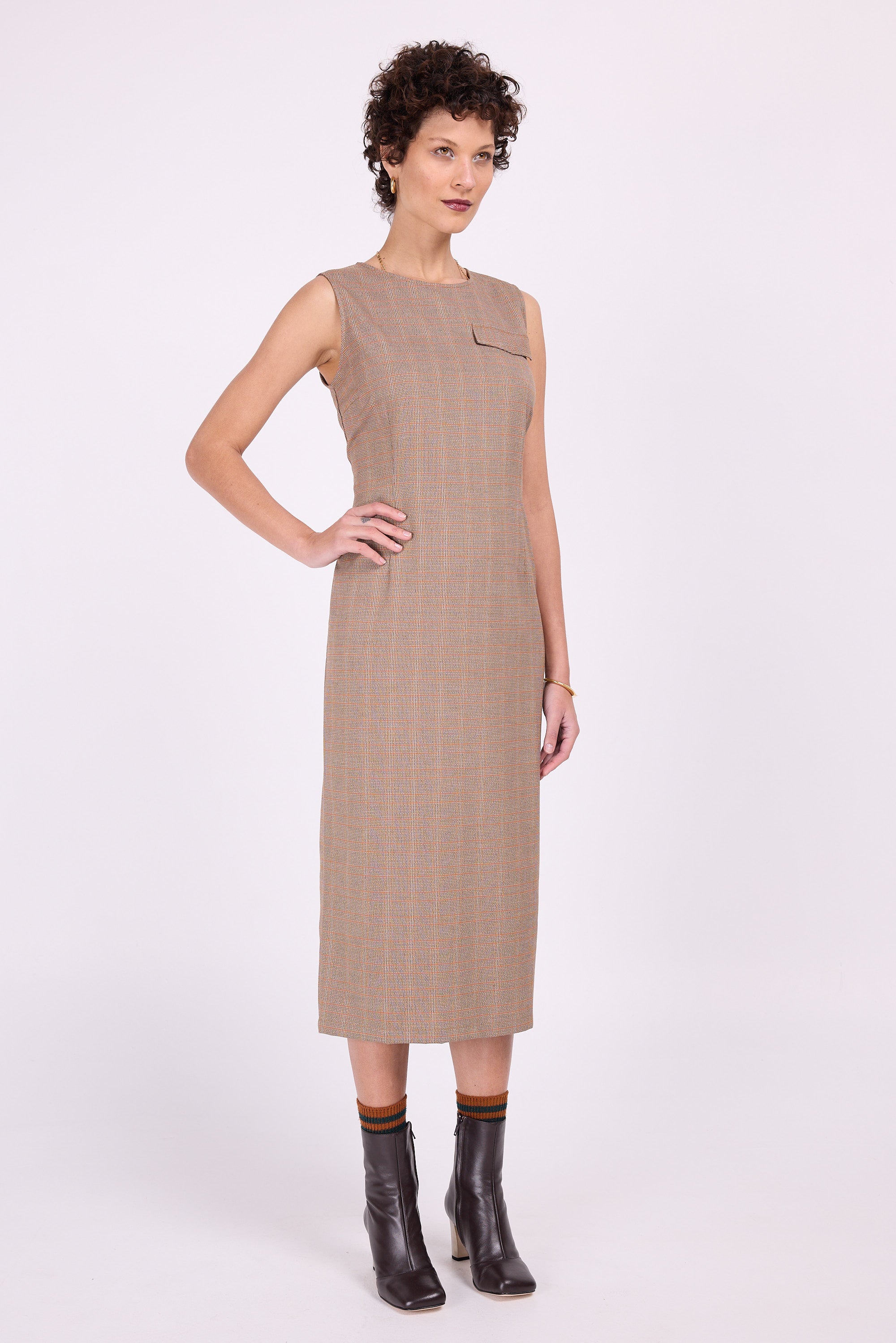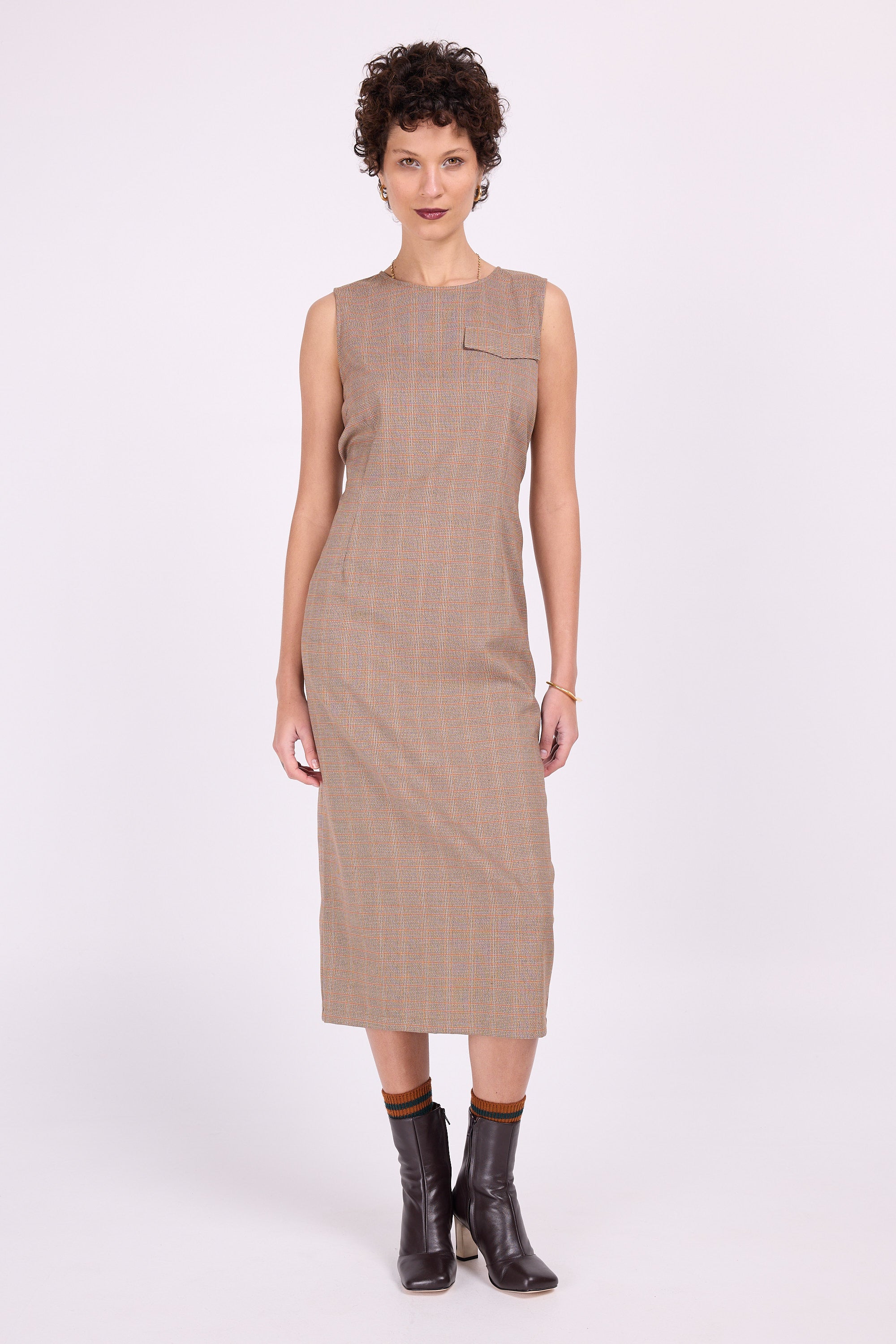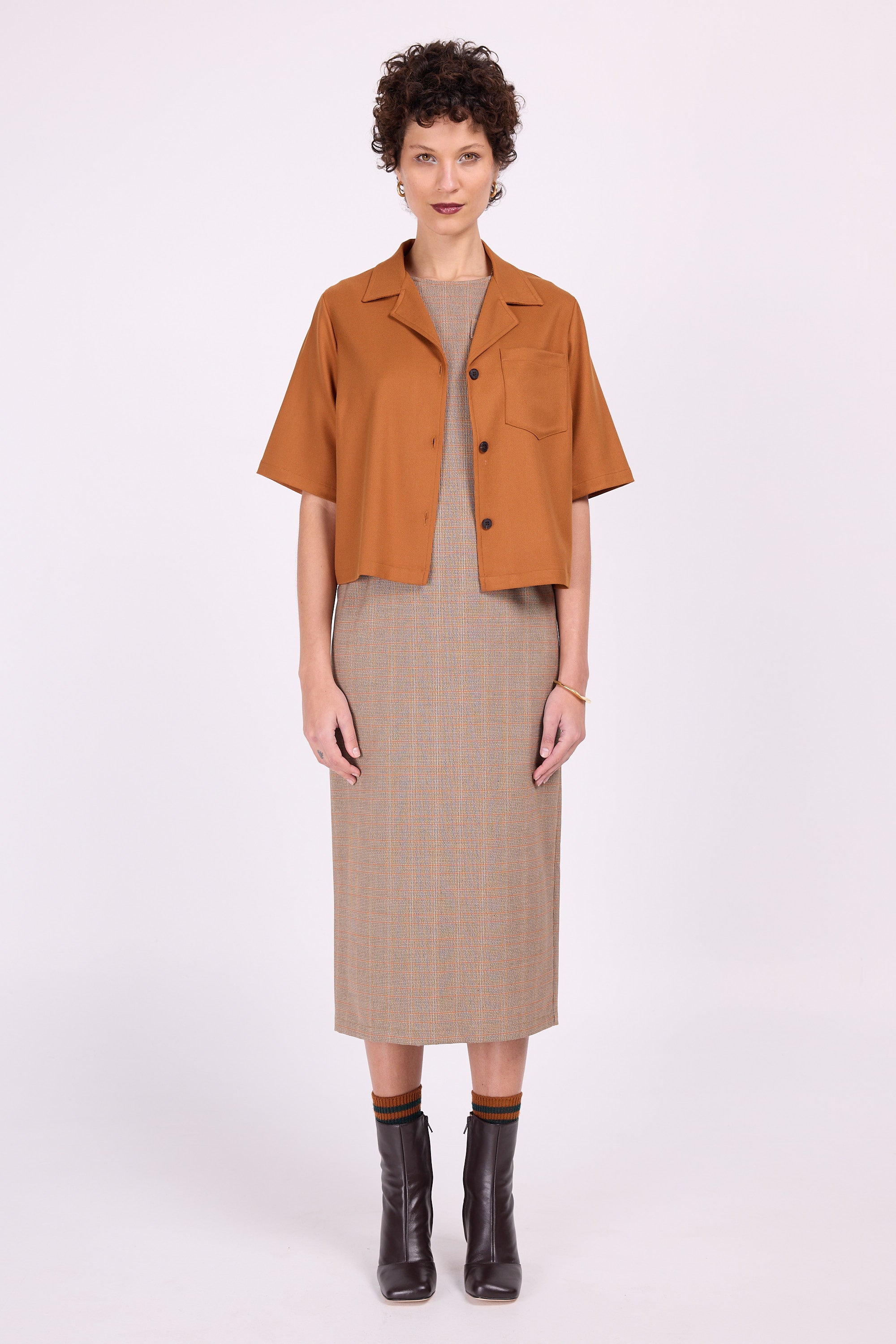 Emelia is a dress in the 'office dress' tradition, but with a Nathalie Vleeschouwer twist due to the original colours: with an orange check, cassis or pine green. In colder weather, combine the dress with a cozy sweater.