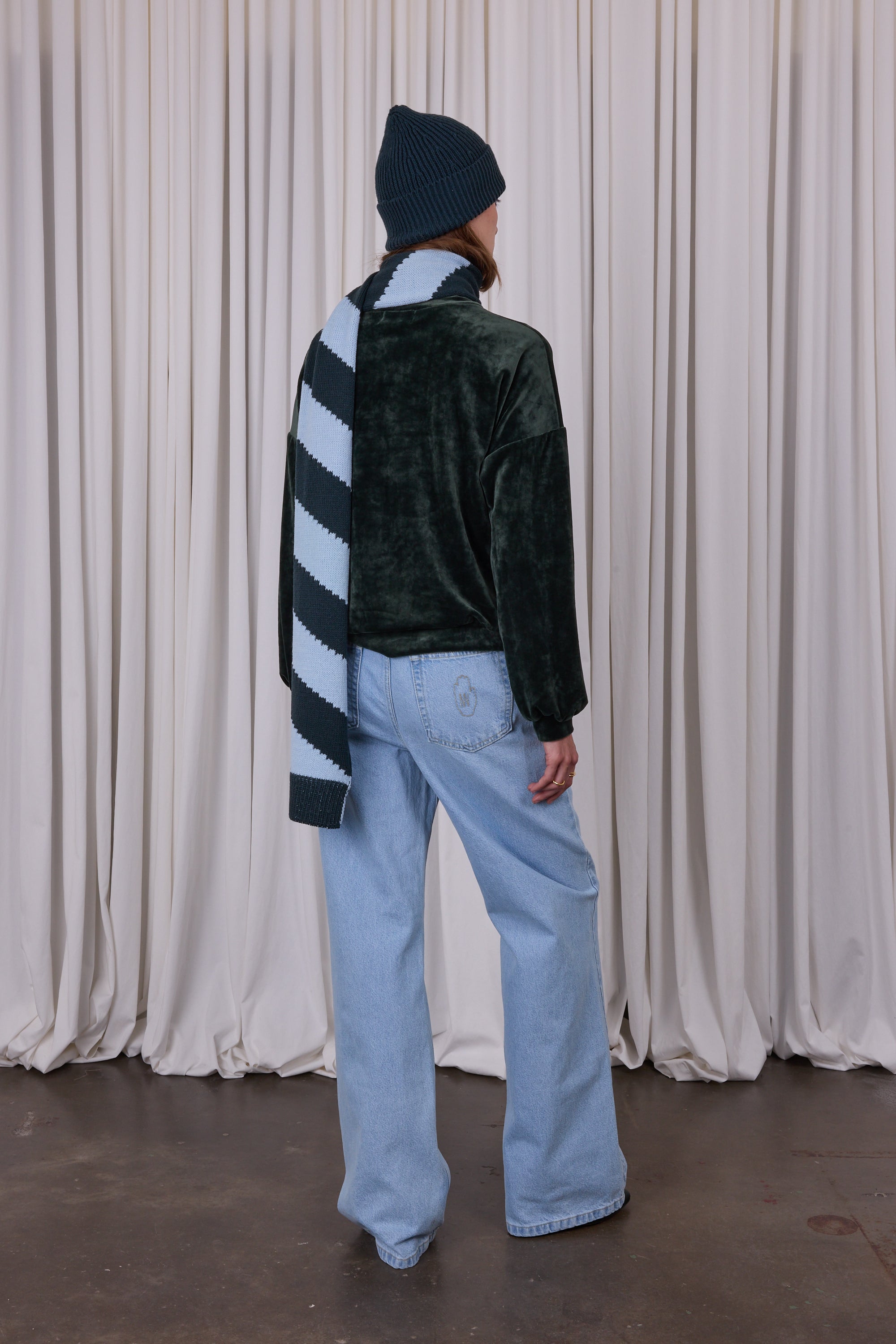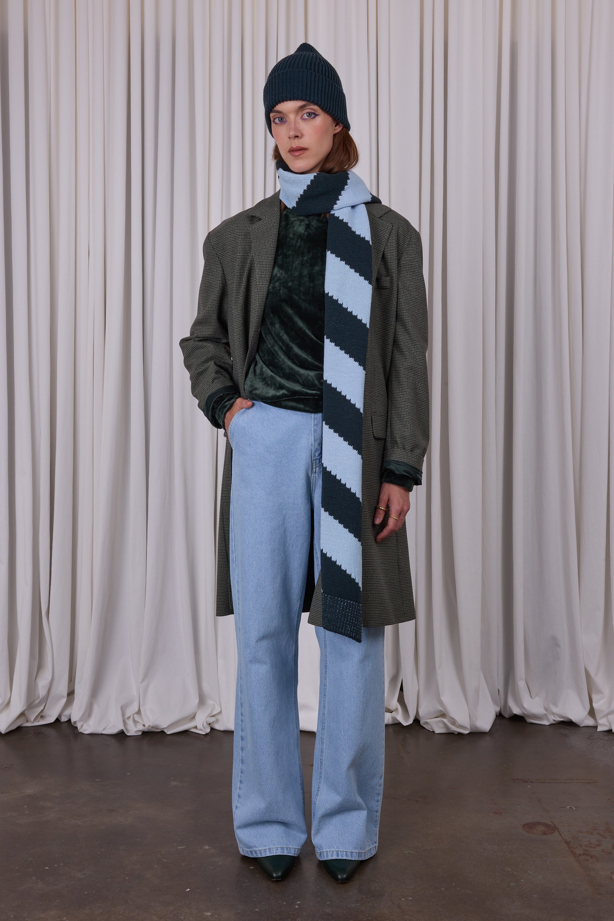 Not vertically, not horizontally, but playfully transversely run the stripes on the Wales scarf. Knitted in Belgium in a merino wool blend and available in four different colour blends. Complete the set with matching hat Wons and leg warmers Warren. Or are you going for a complete look with one of the many sweaters and cardigans in these colours?