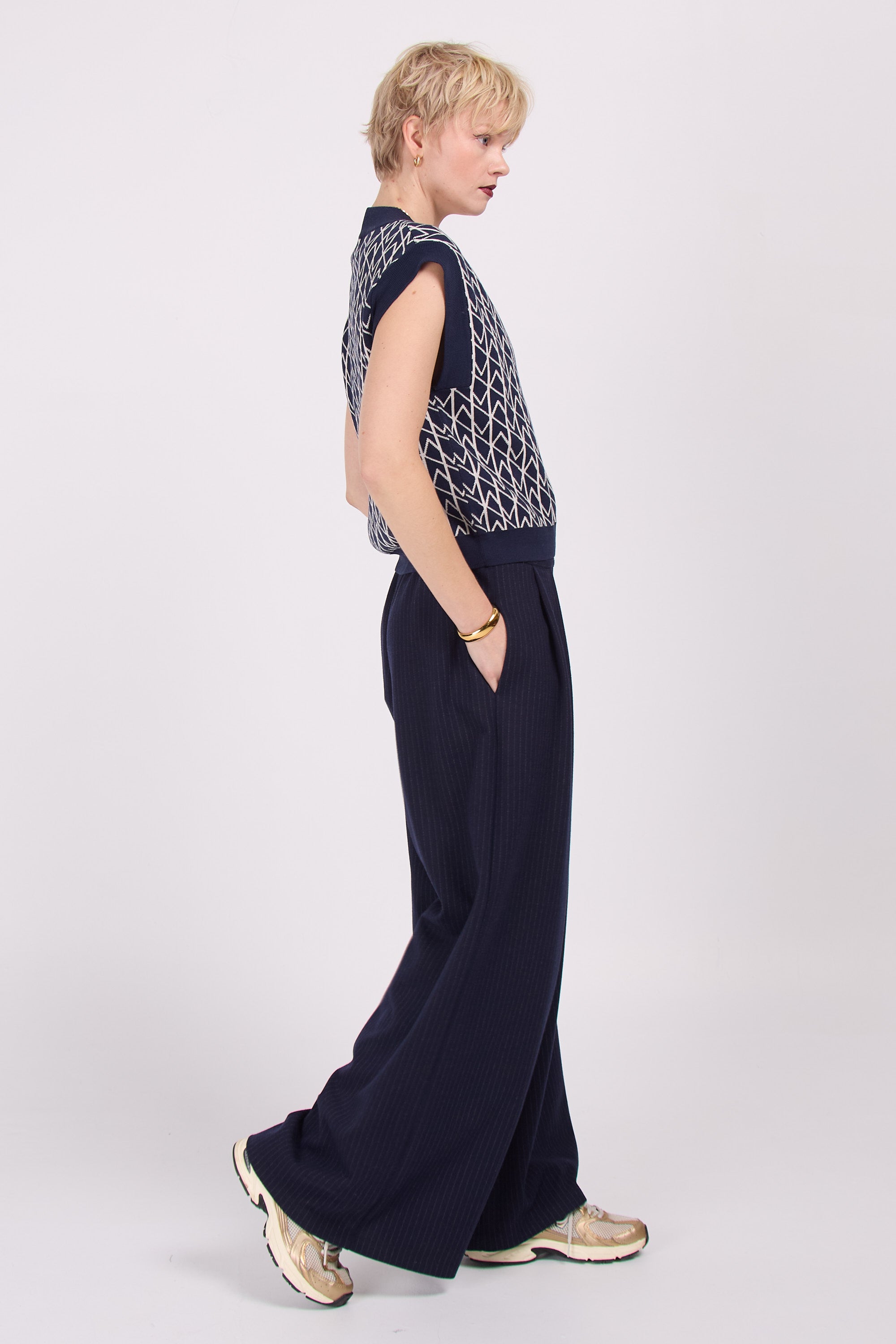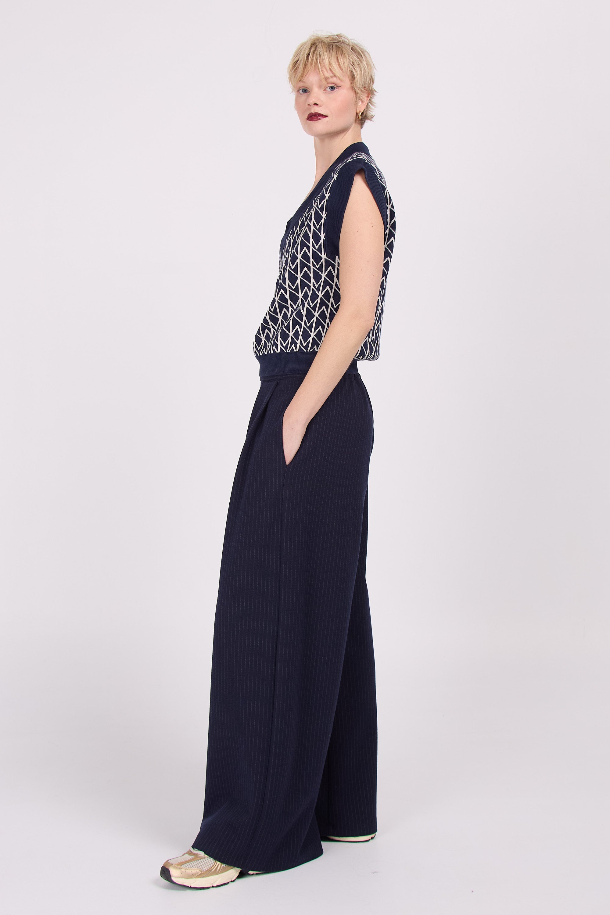 Voluminous trousers in supple fabric, which almost makes them look like a trouser skirt, sister to the Clinton trousers, but for the first time in a stretch fabric. The subtle pinstripes define the comfy-chic look.