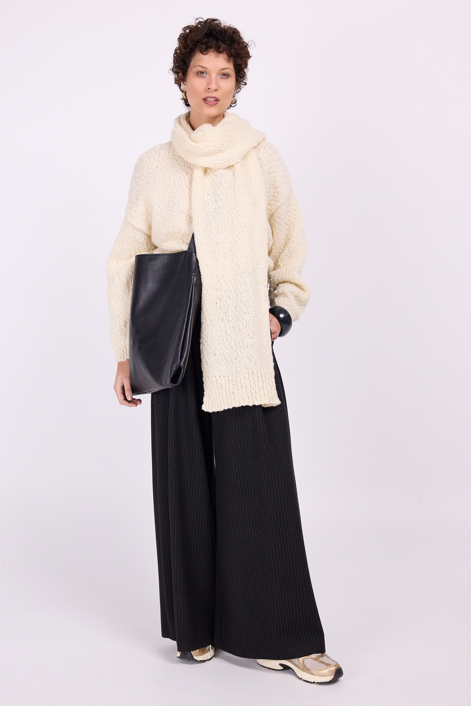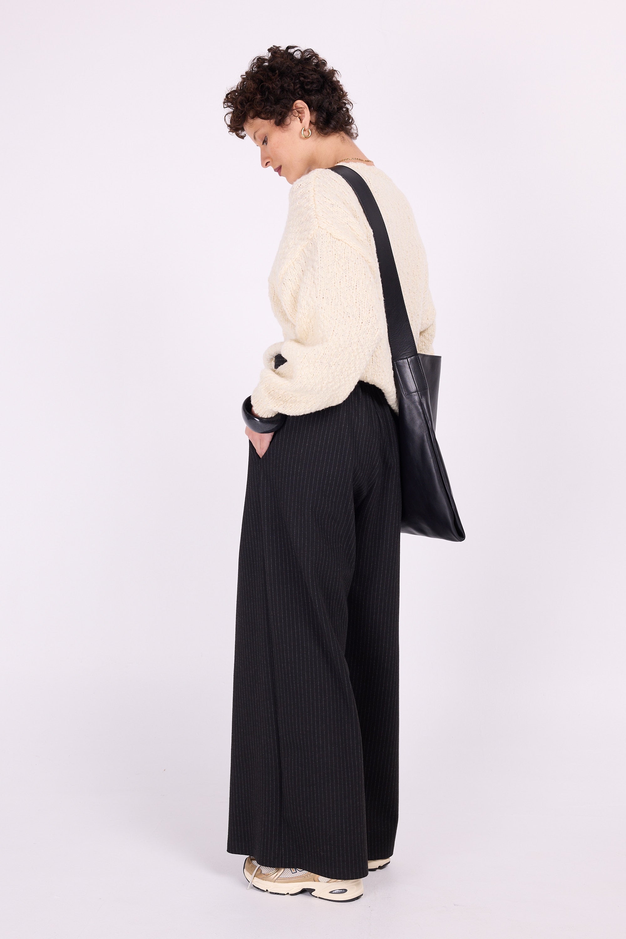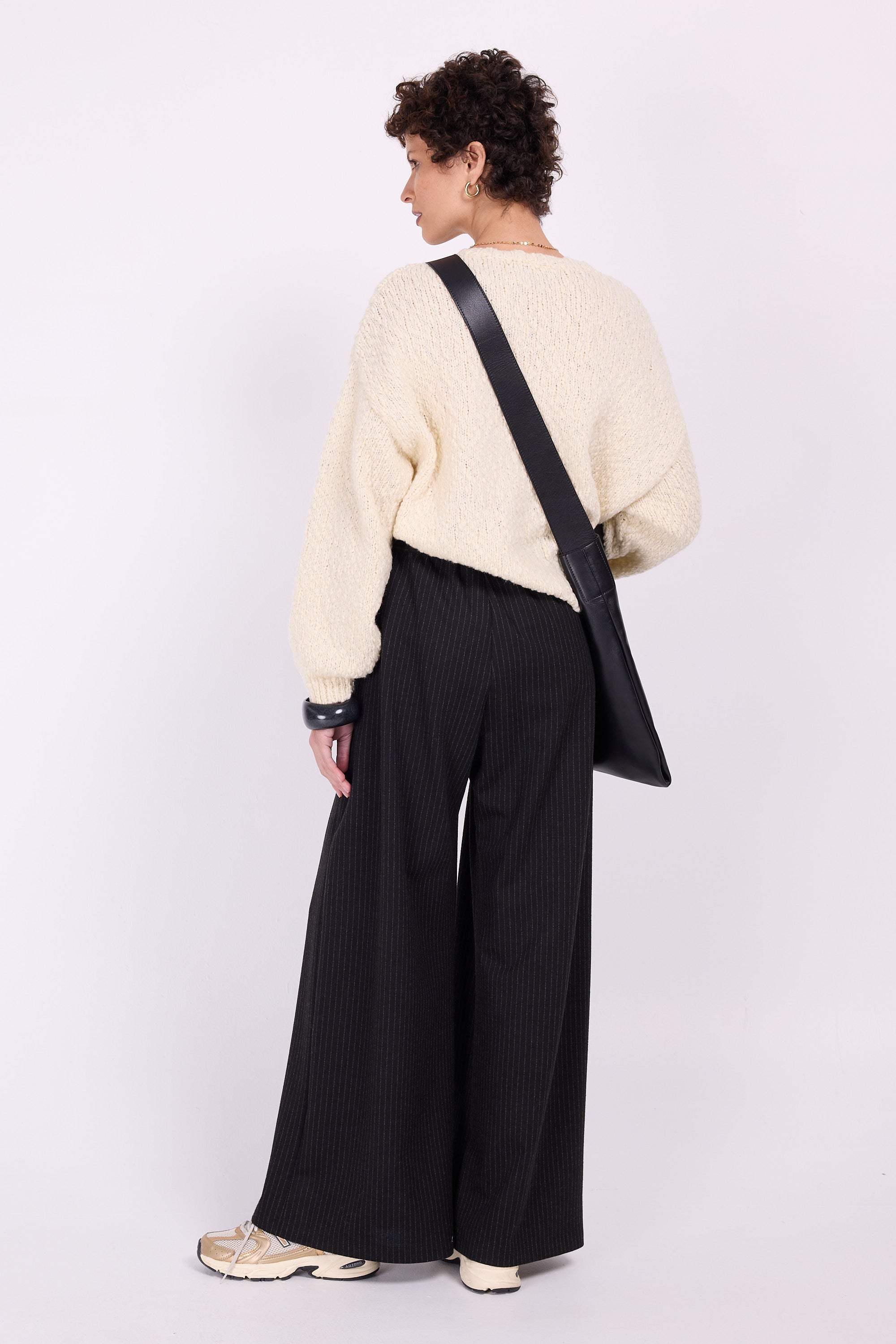 Voluminous trousers in supple fabric, which almost makes them look like a trouser skirt, sister to the Clinton trousers, but for the first time in a stretch fabric. The subtle pinstripes define the comfy-chic look.