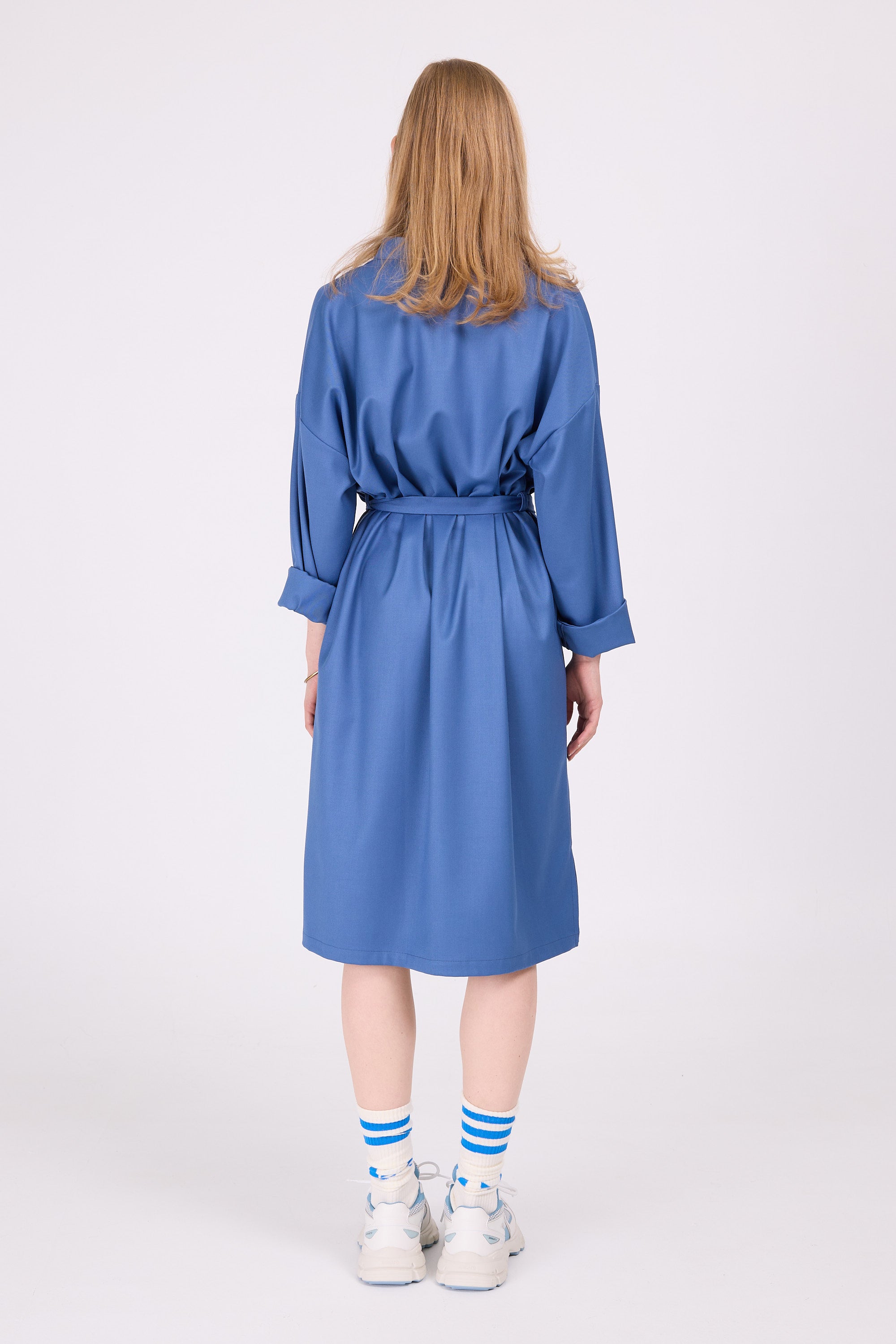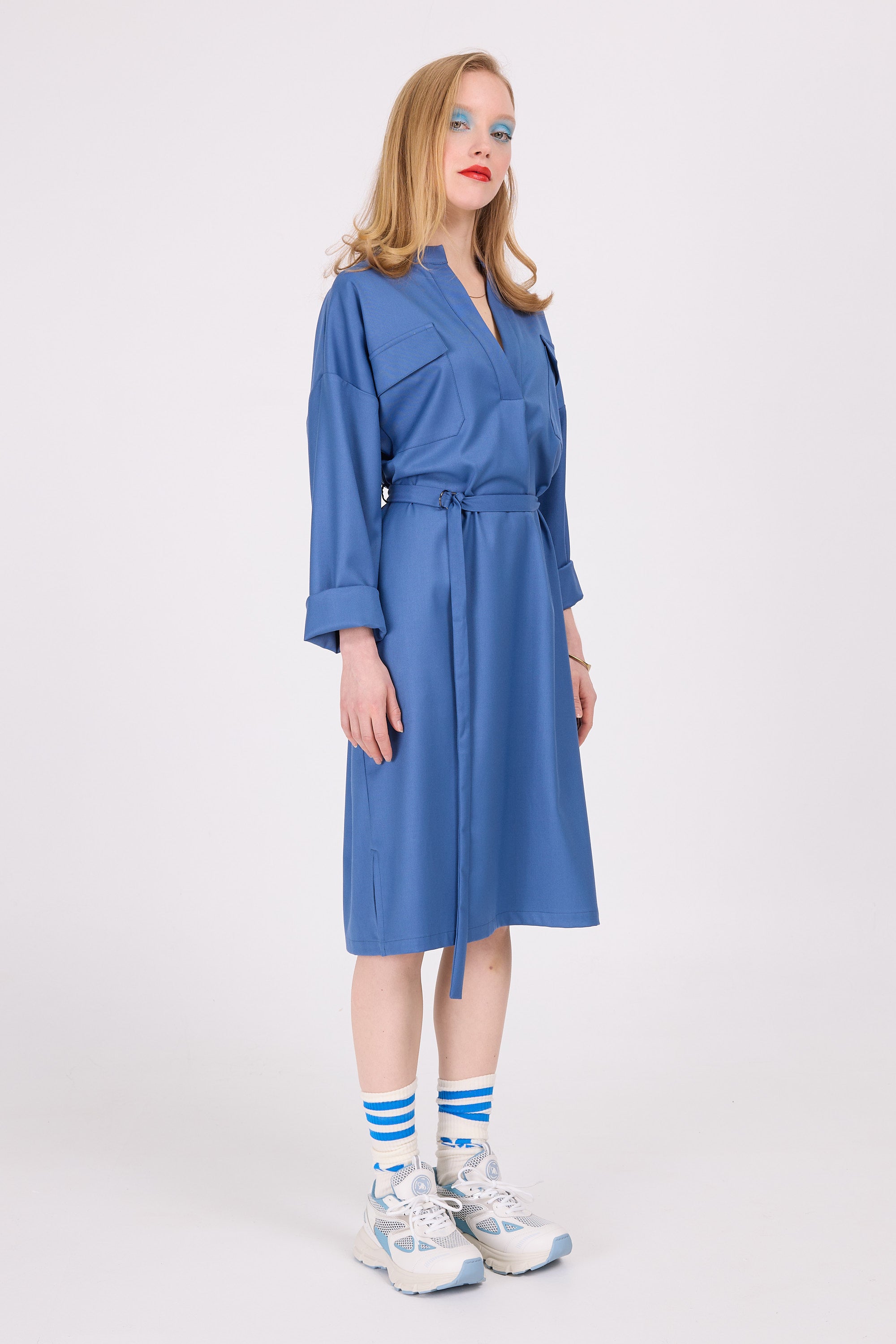 Knee-length dress with flat officer collar and patch pockets. With the loose belt you decide how centered you want the dress and how much you want it to loosen up a bit, so you have control over the length.