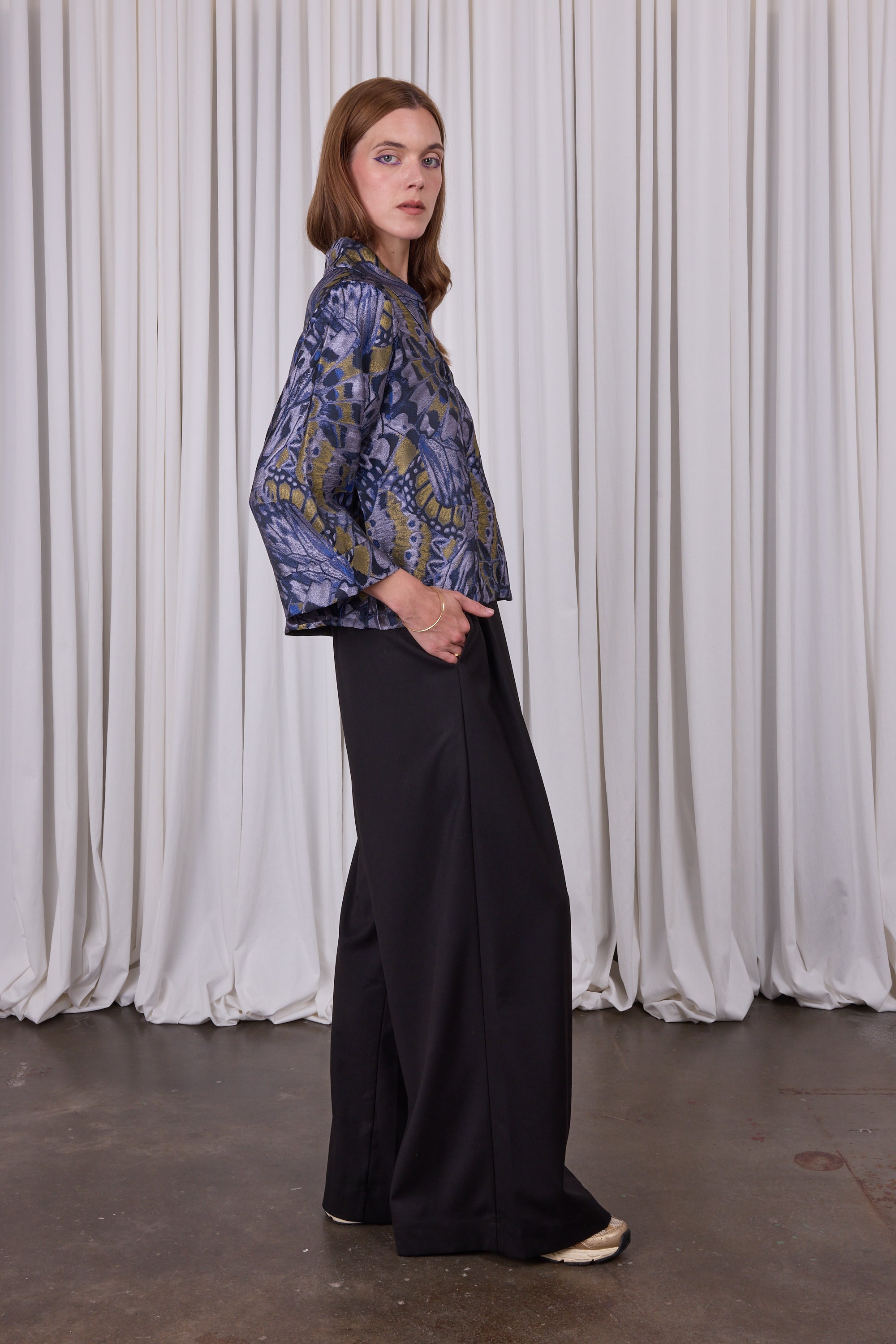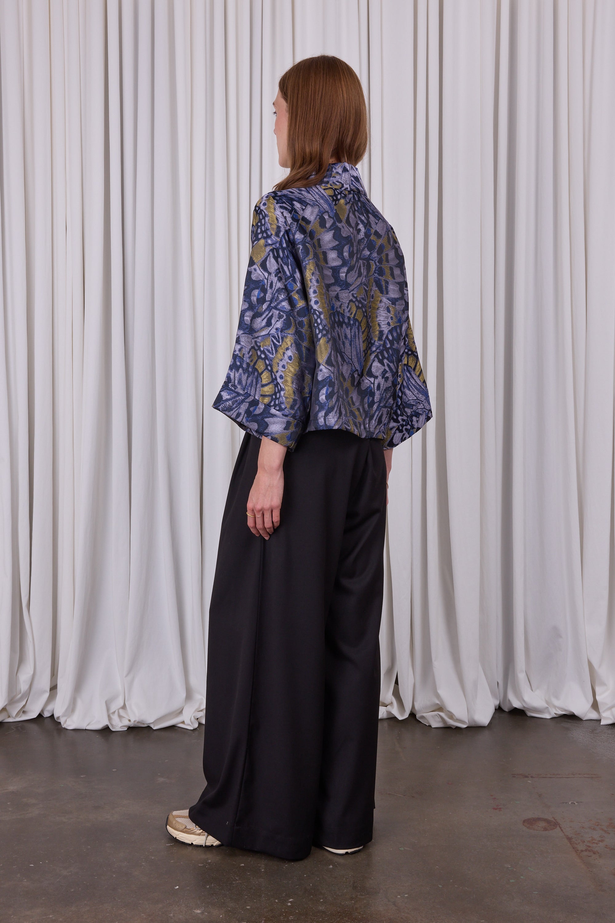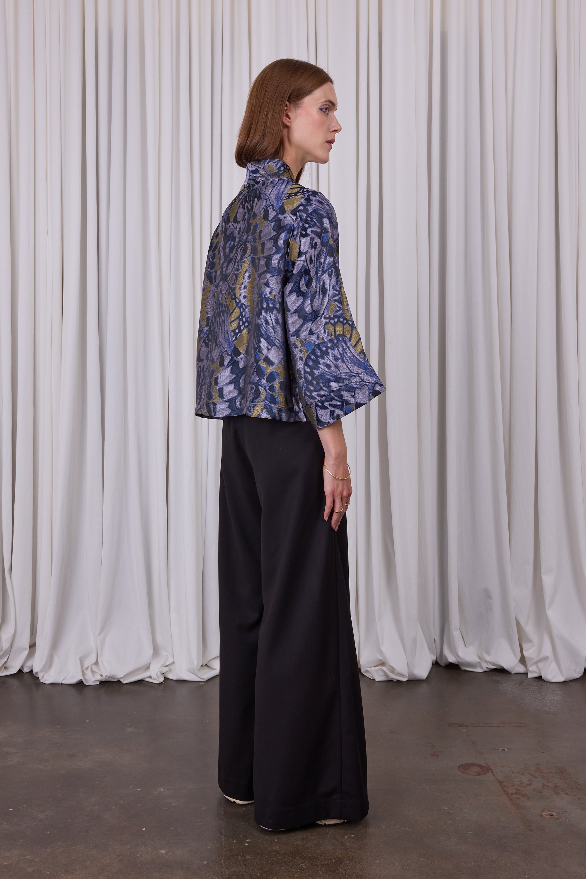 Blouse with a wide, kimono-like stand-up collar. This version in supple jacquard with woven butterfly print has beautiful colour shades that range from gold and lilac to cobalt blue and deep purple.