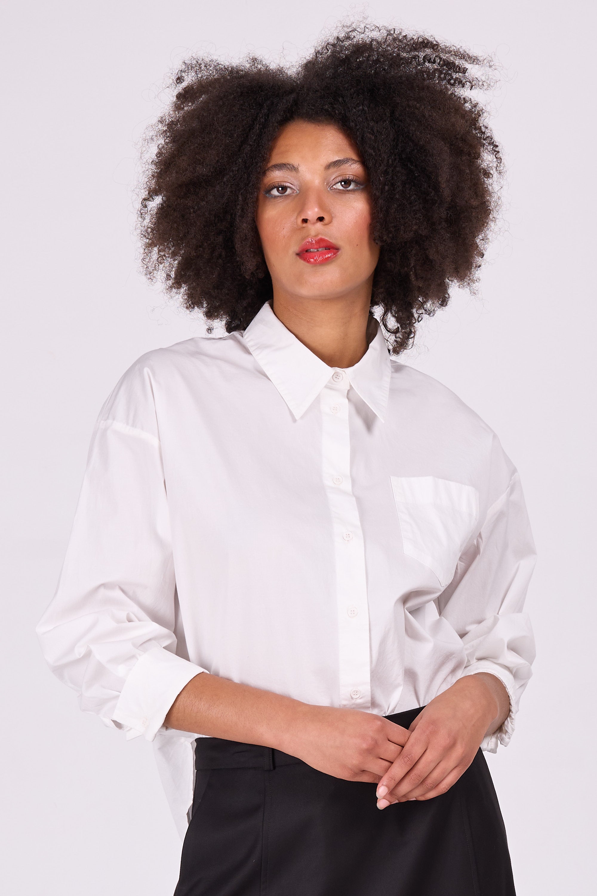 Wide-fitting shirt with dropped shoulders, puffed sleeves and gathering on the back. Made of airy stretch cotton poplin.