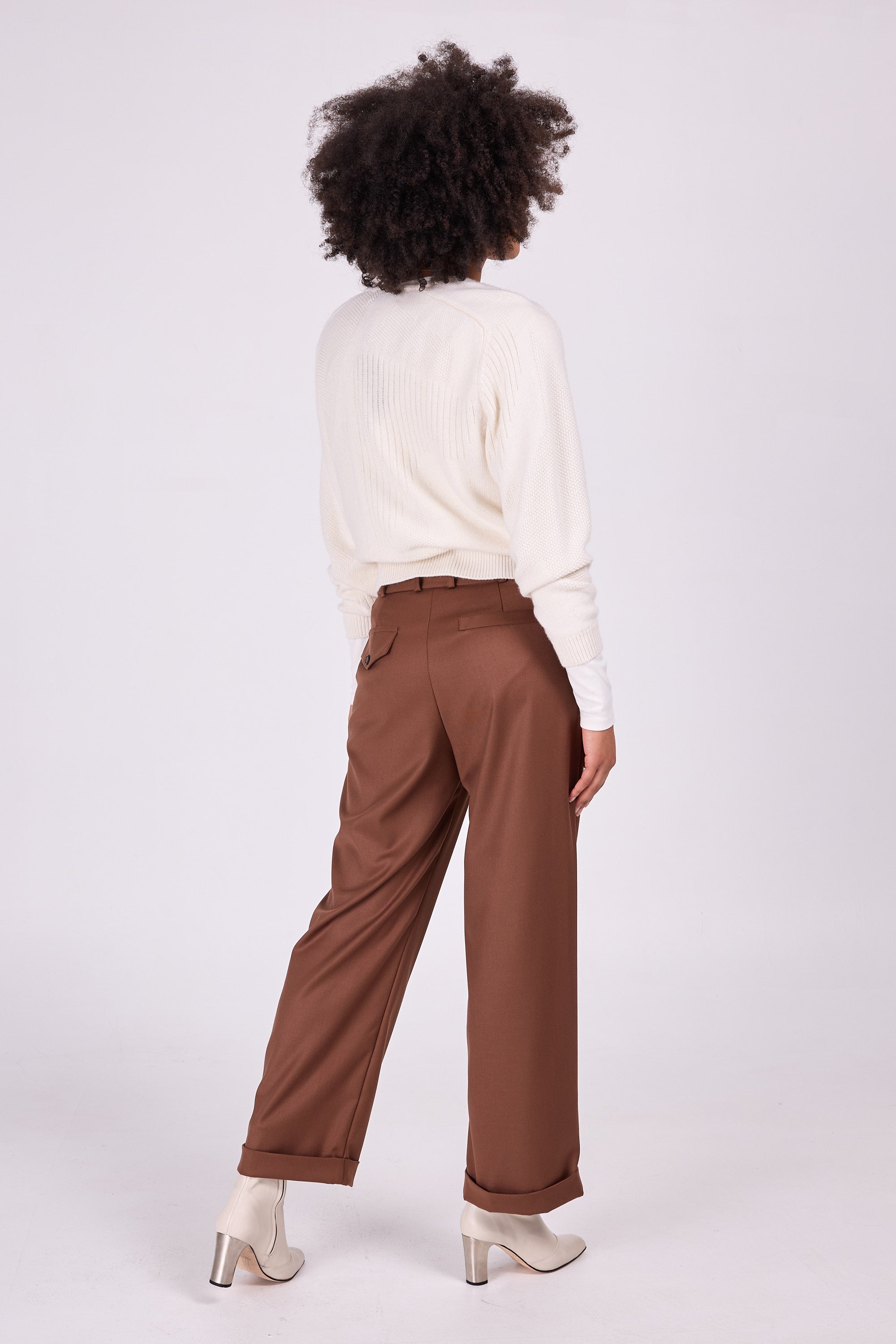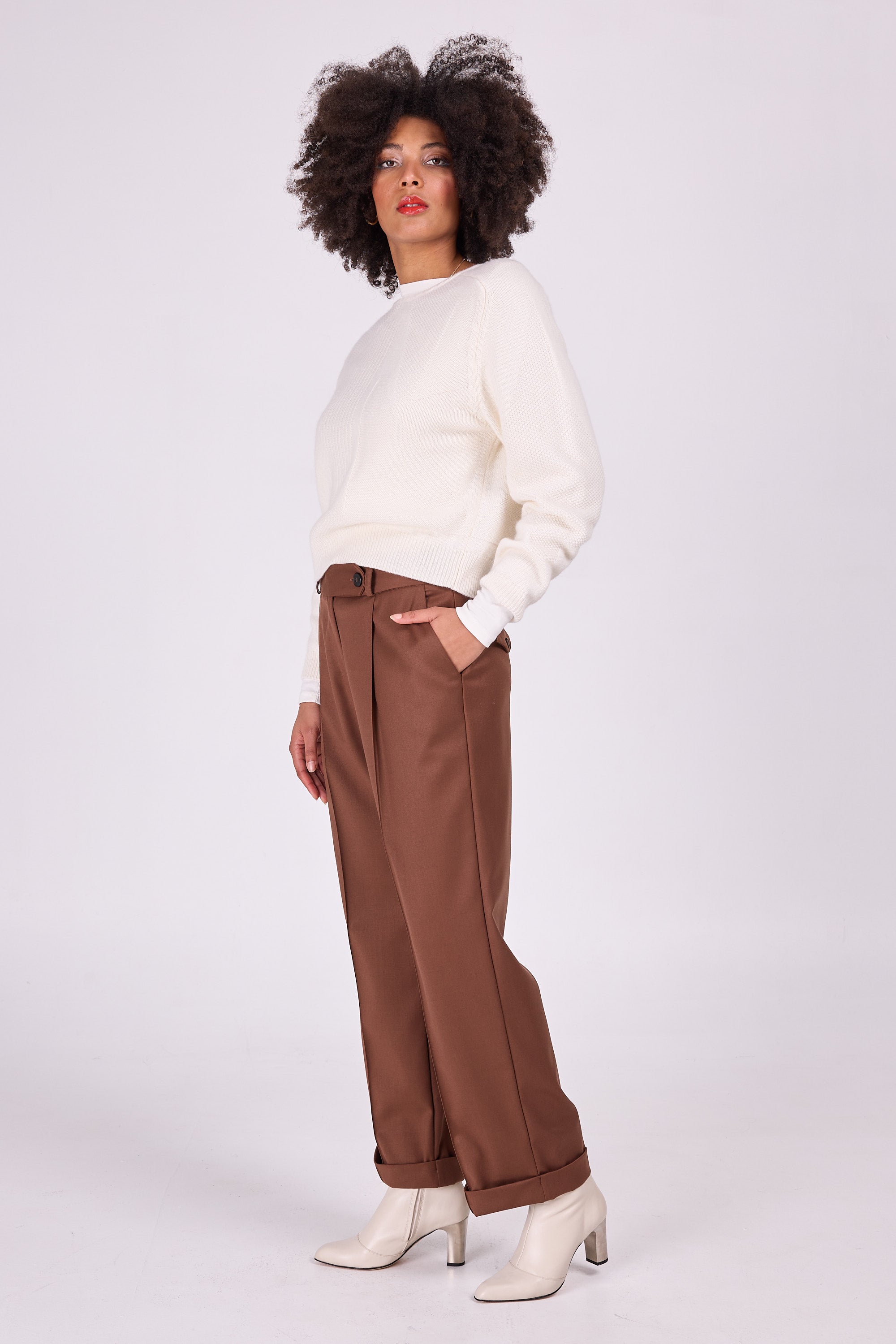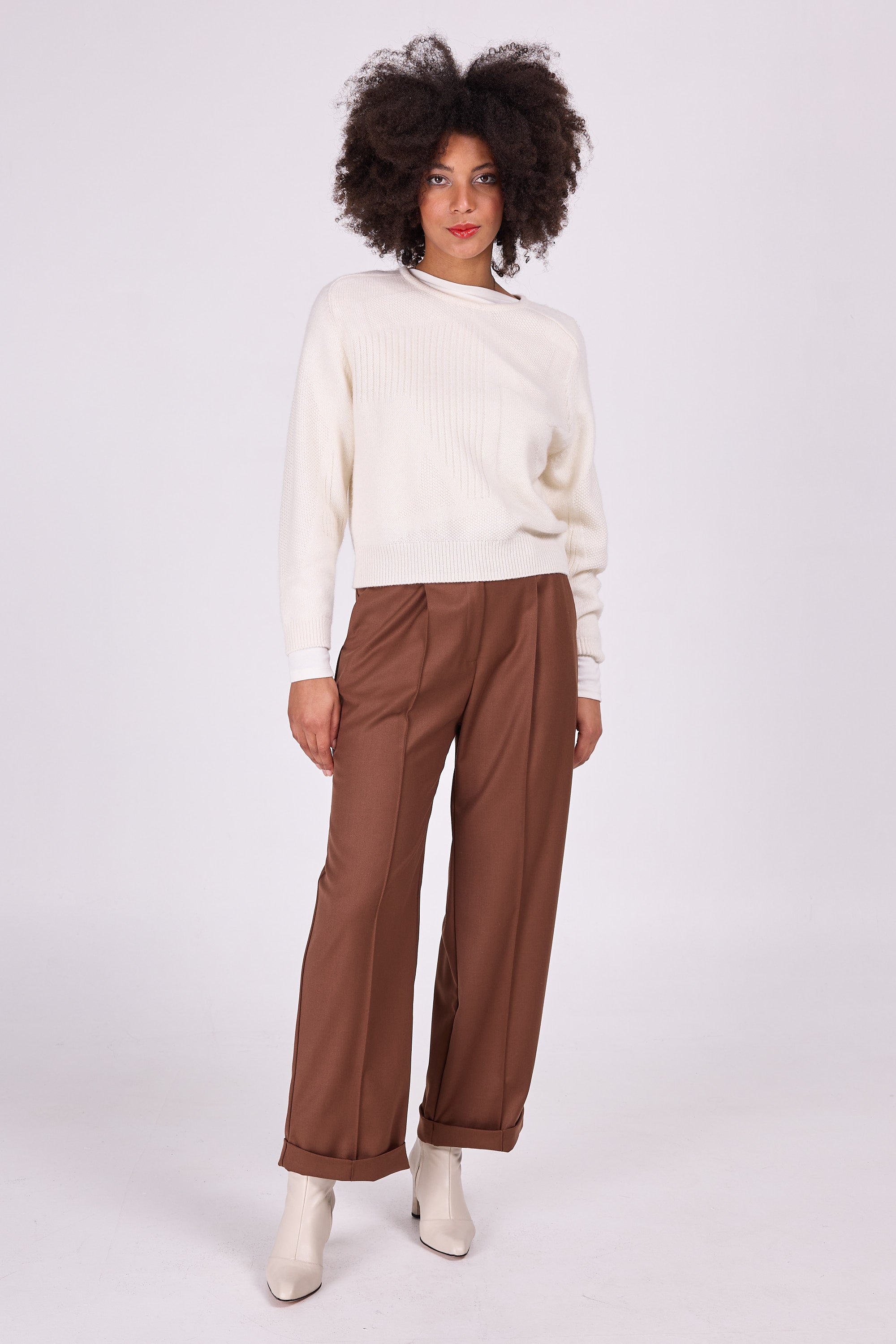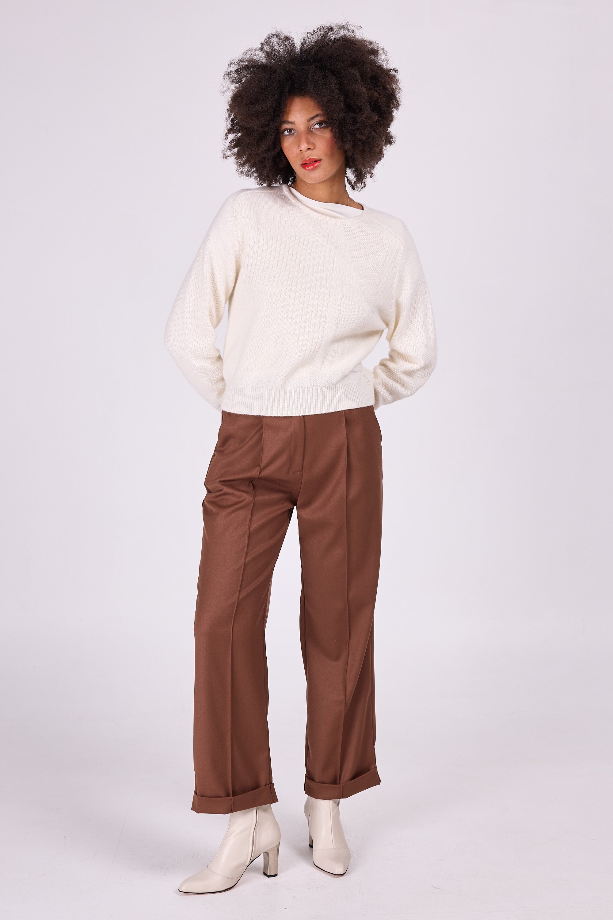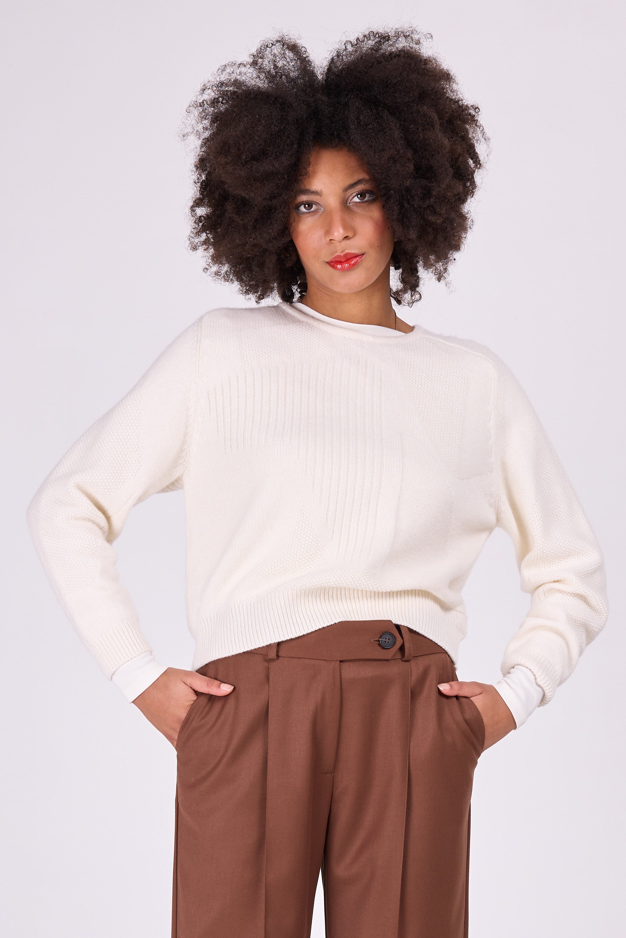 Maputo is one of a kind: the graphic drawing in different openwork stitches makes it original, yet versatile wearable because only one colour of yarn was used. The sweater is knitted in a merino wool and cashmere blend, wonderfully soft on the skin.