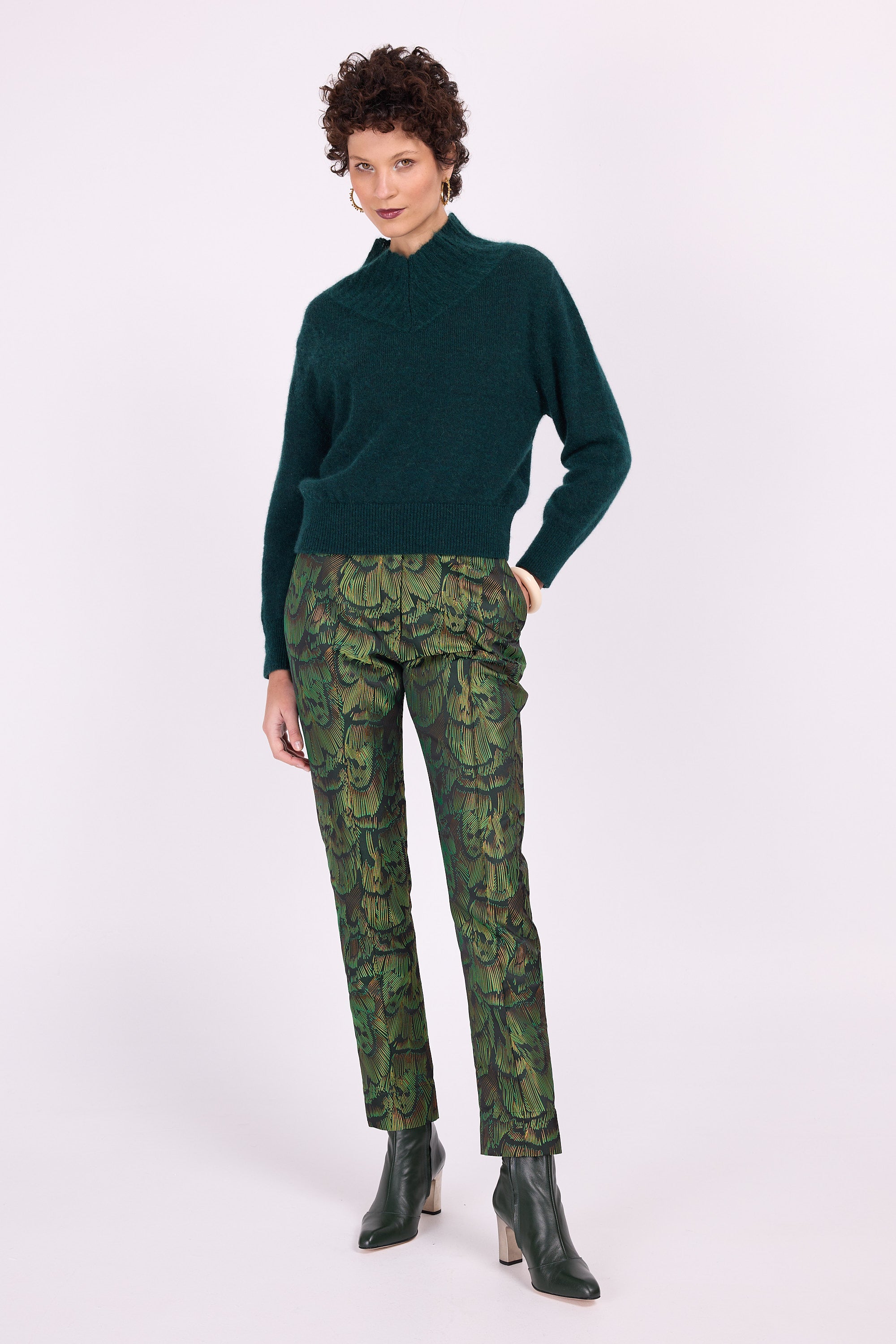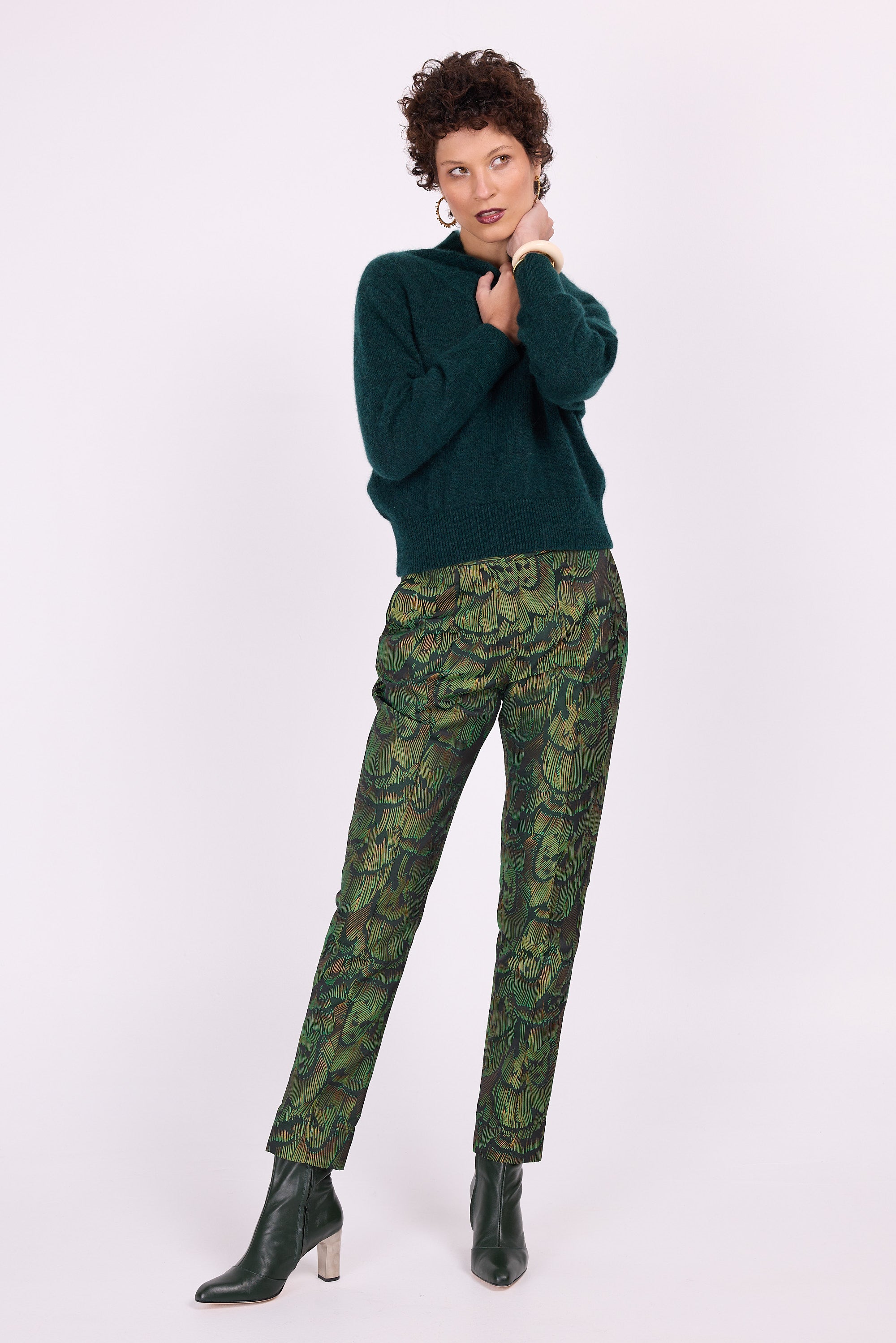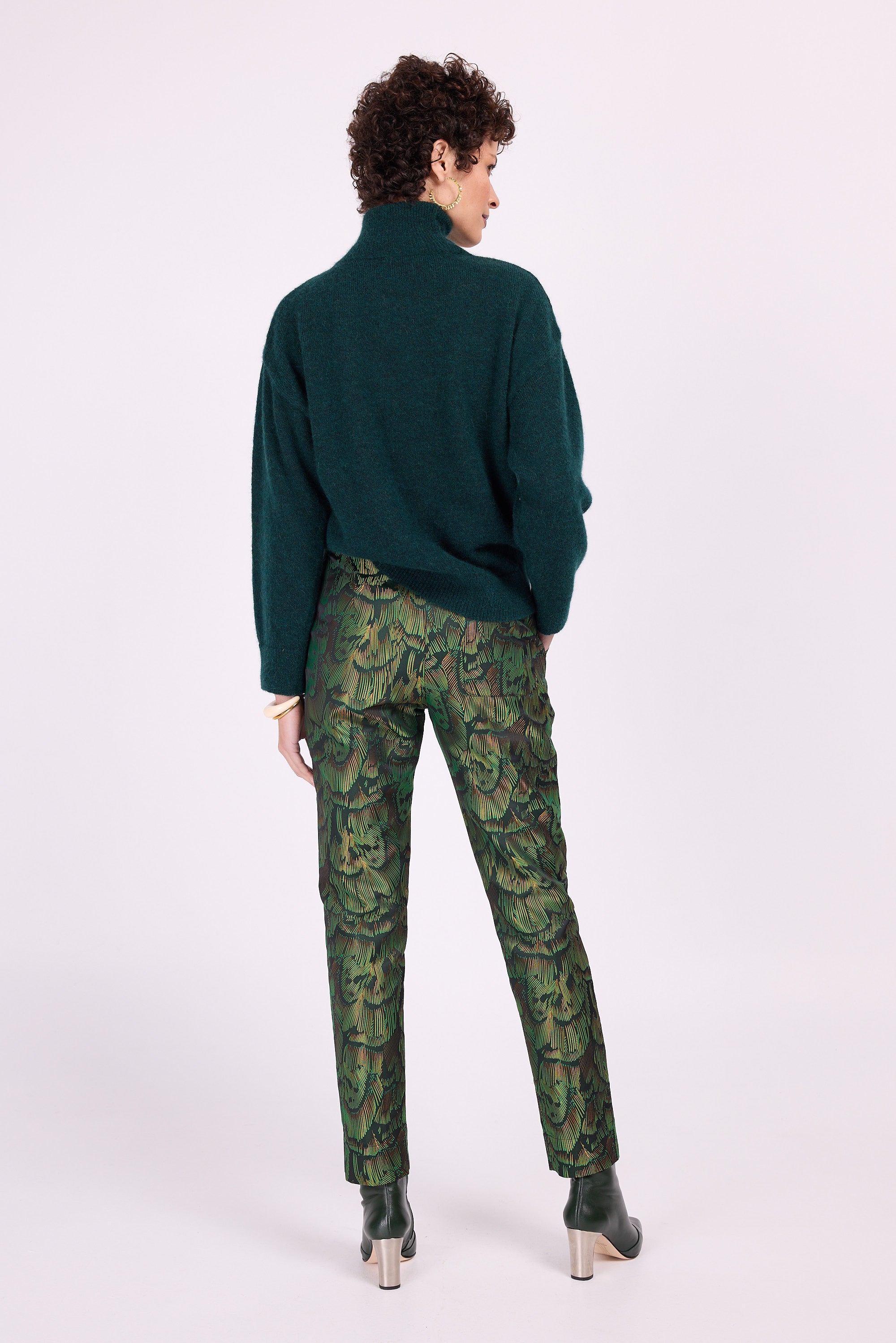 In addition to all the beautiful wide leg trousers, Emiel comes with slim legs that put your legs in the spotlight. Classic cut trousers with stitched tucks. Version in dragonfly jacquard fabric with a shiny gold metallic effect.