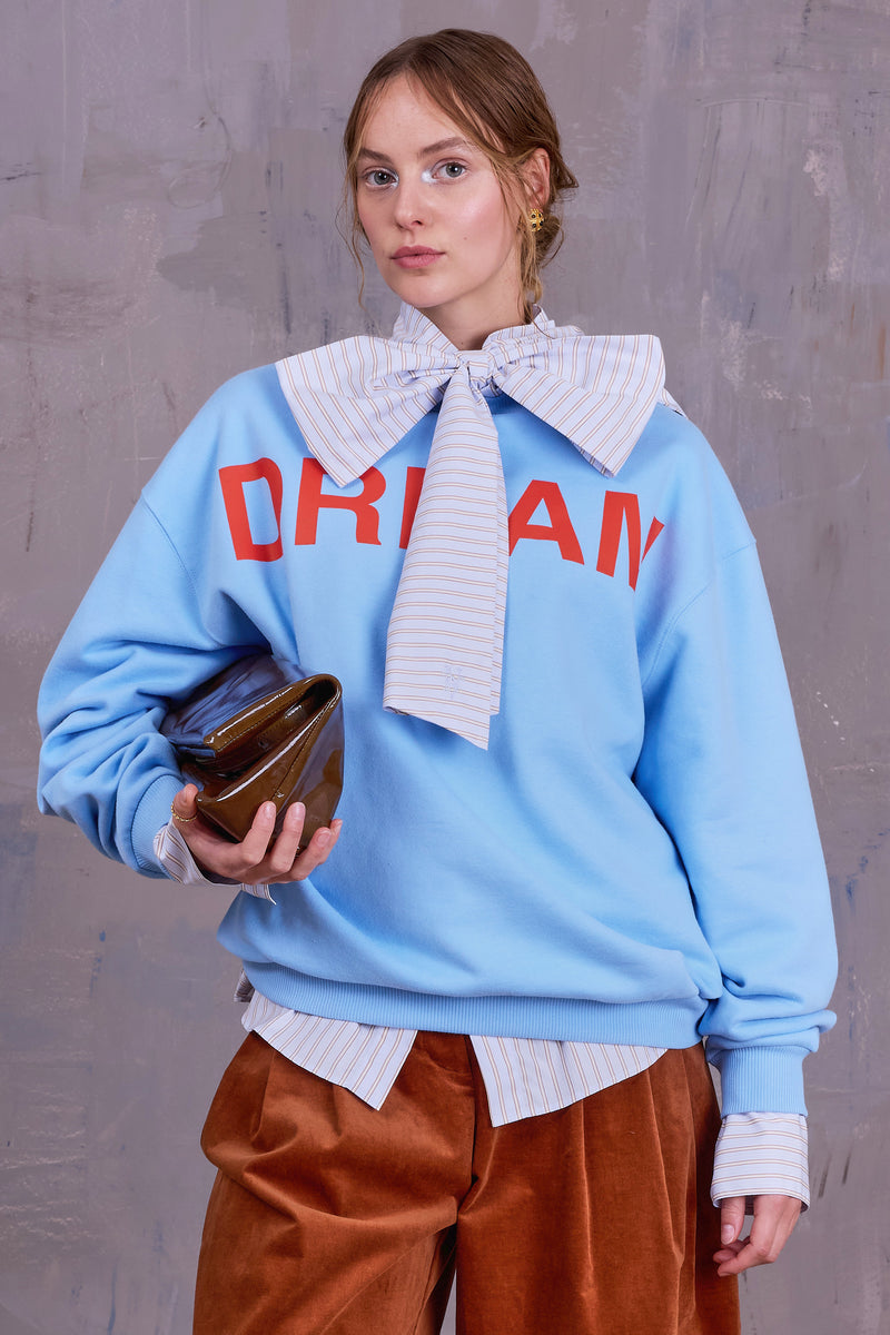 Not every shirt makes a statement, but Gilou certainly does. Not an everyday collar, but a long attached scarf to make a bombastic bow. More is more.