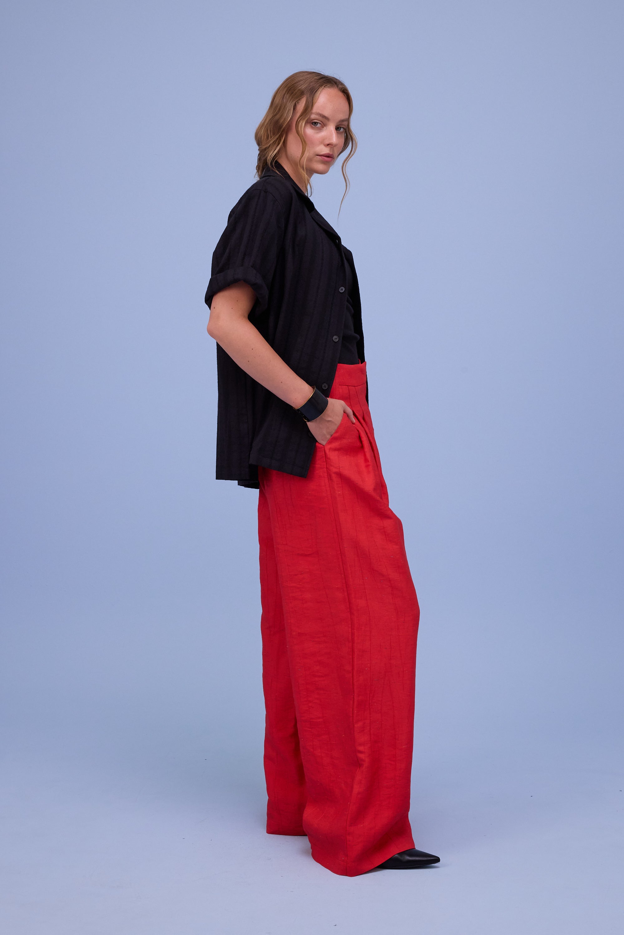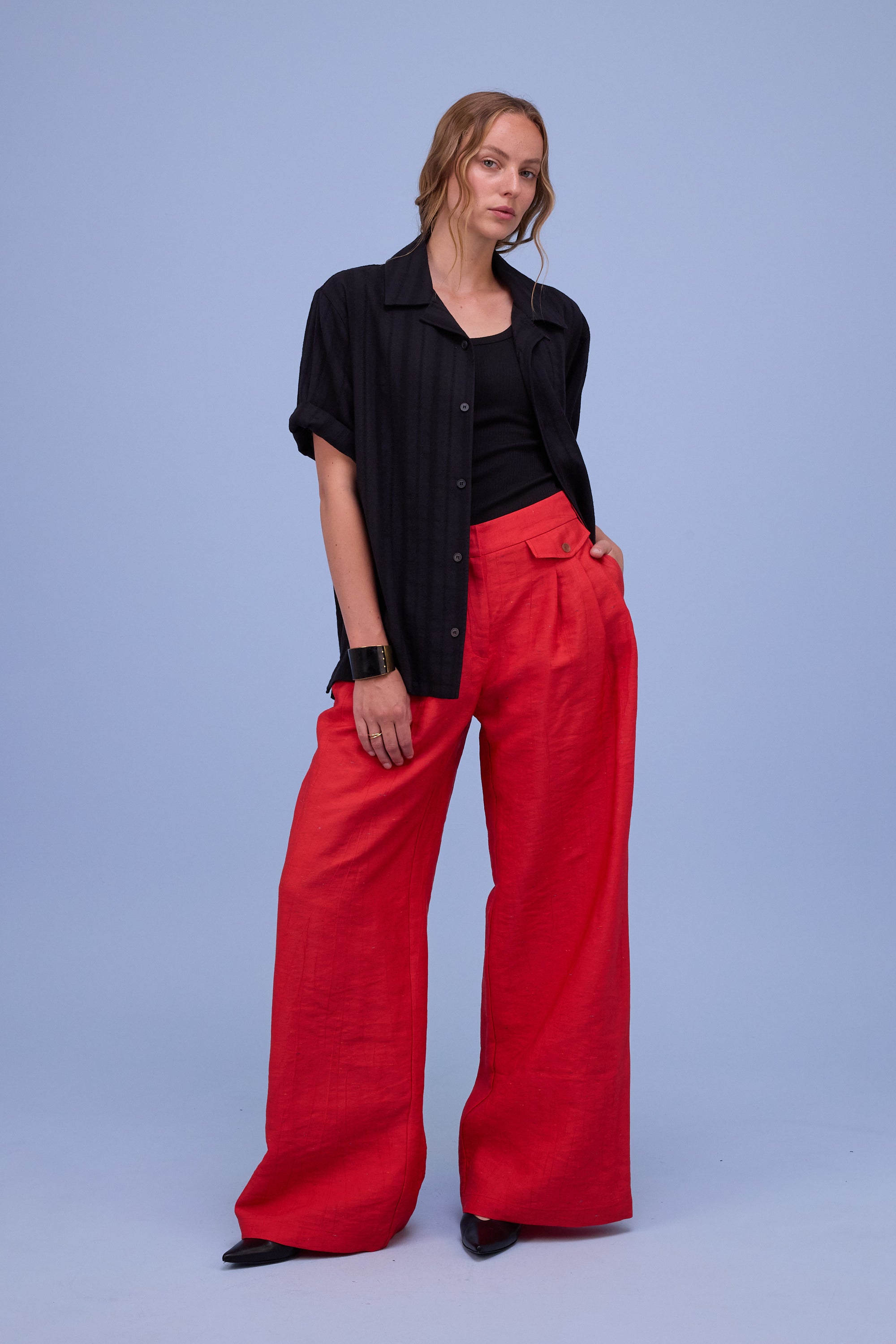Straight-cut short-sleeved shirt made from French cotton: a fabric characterised by vertical rows of embroidery that add texture.