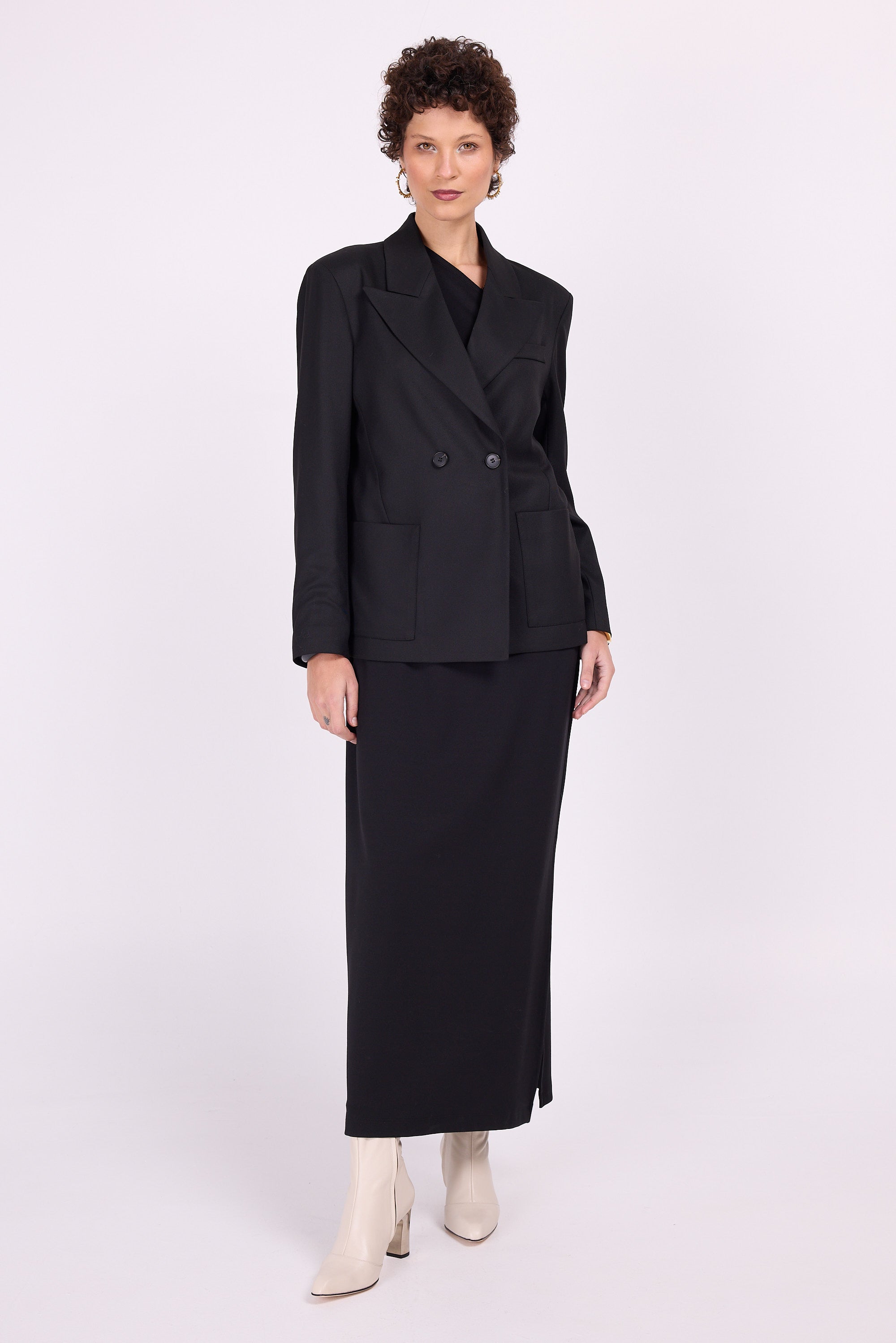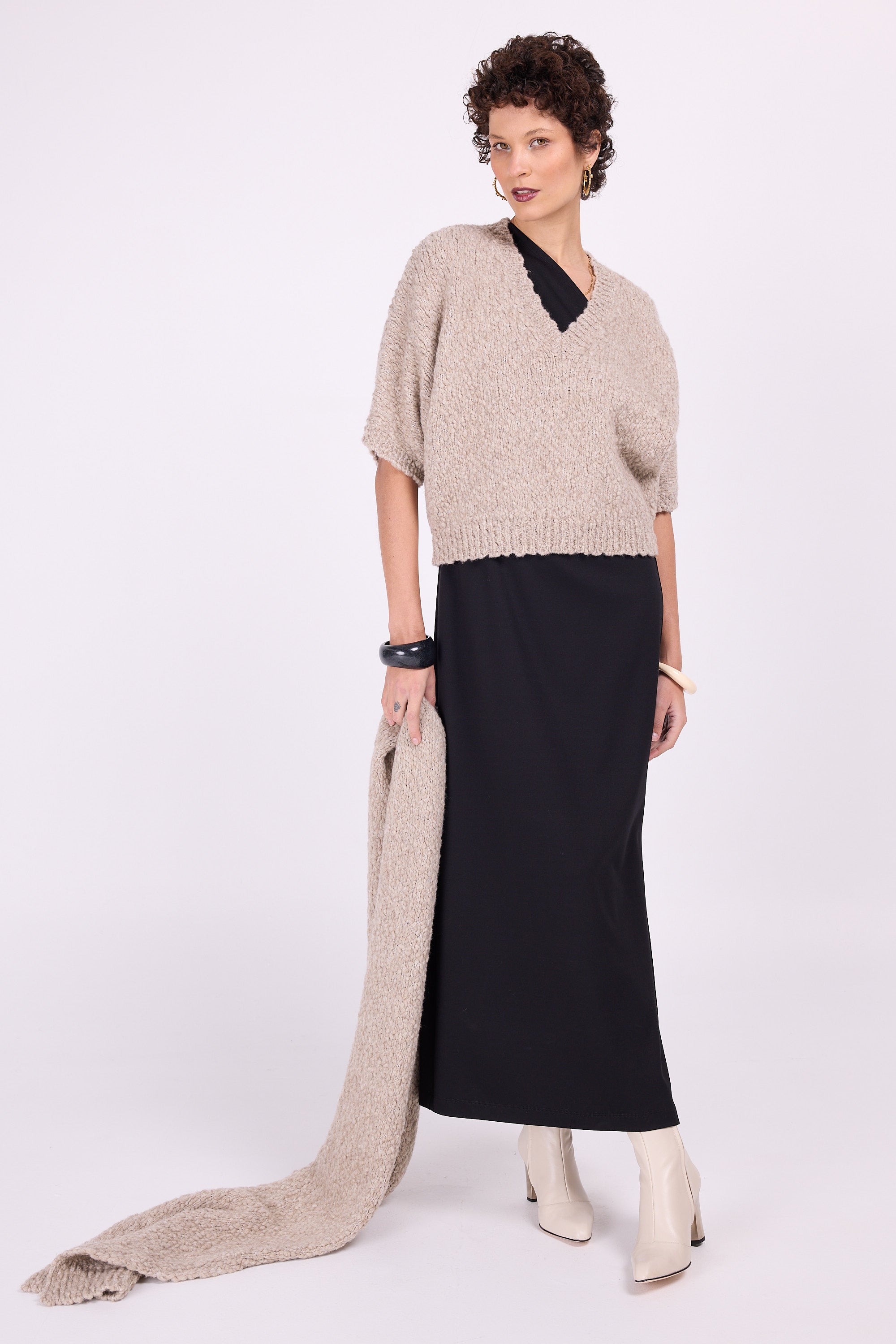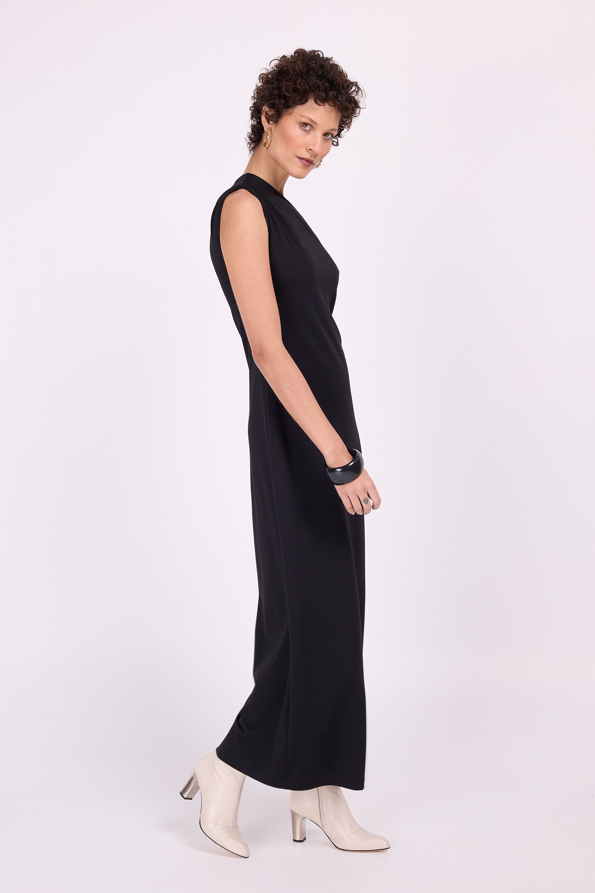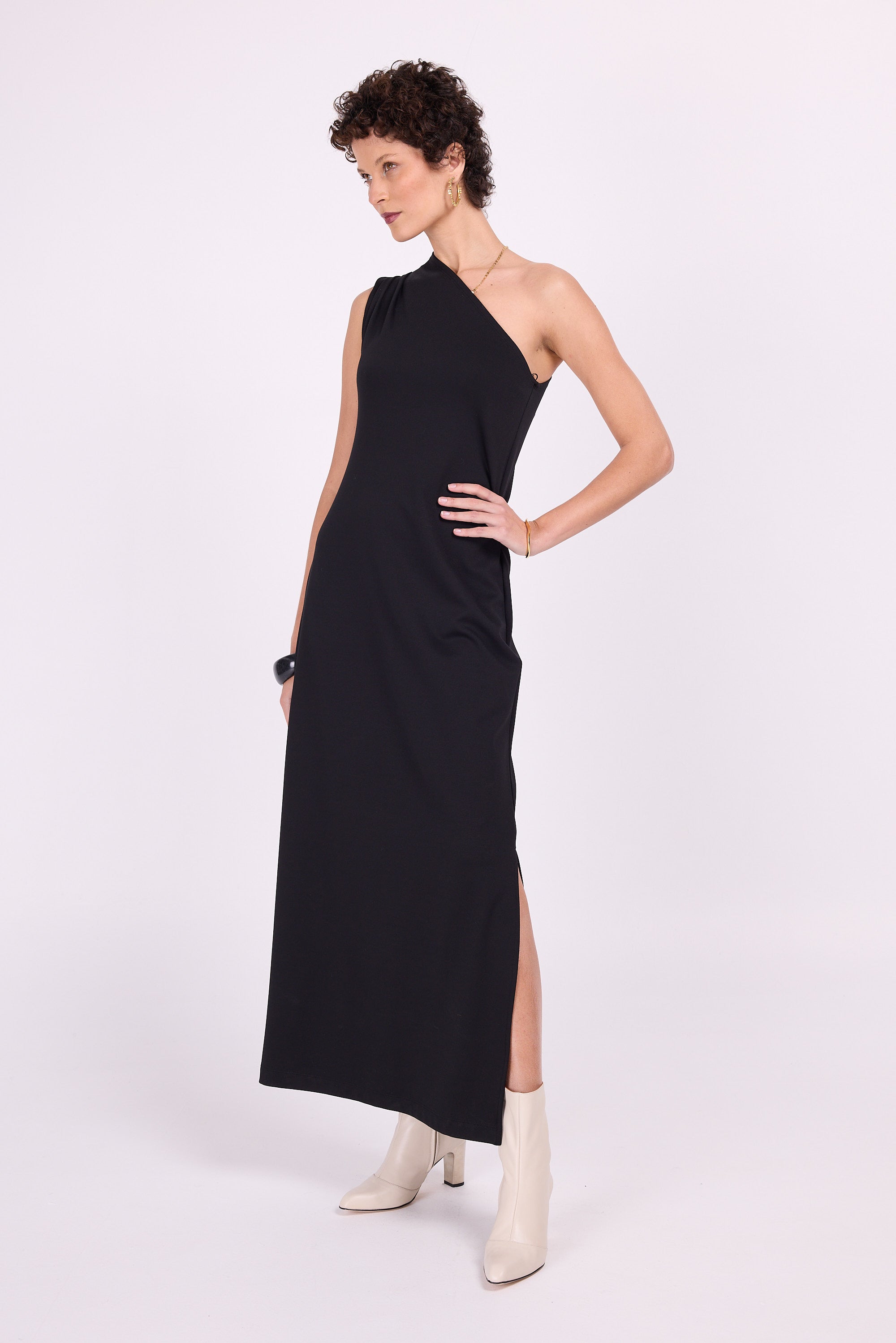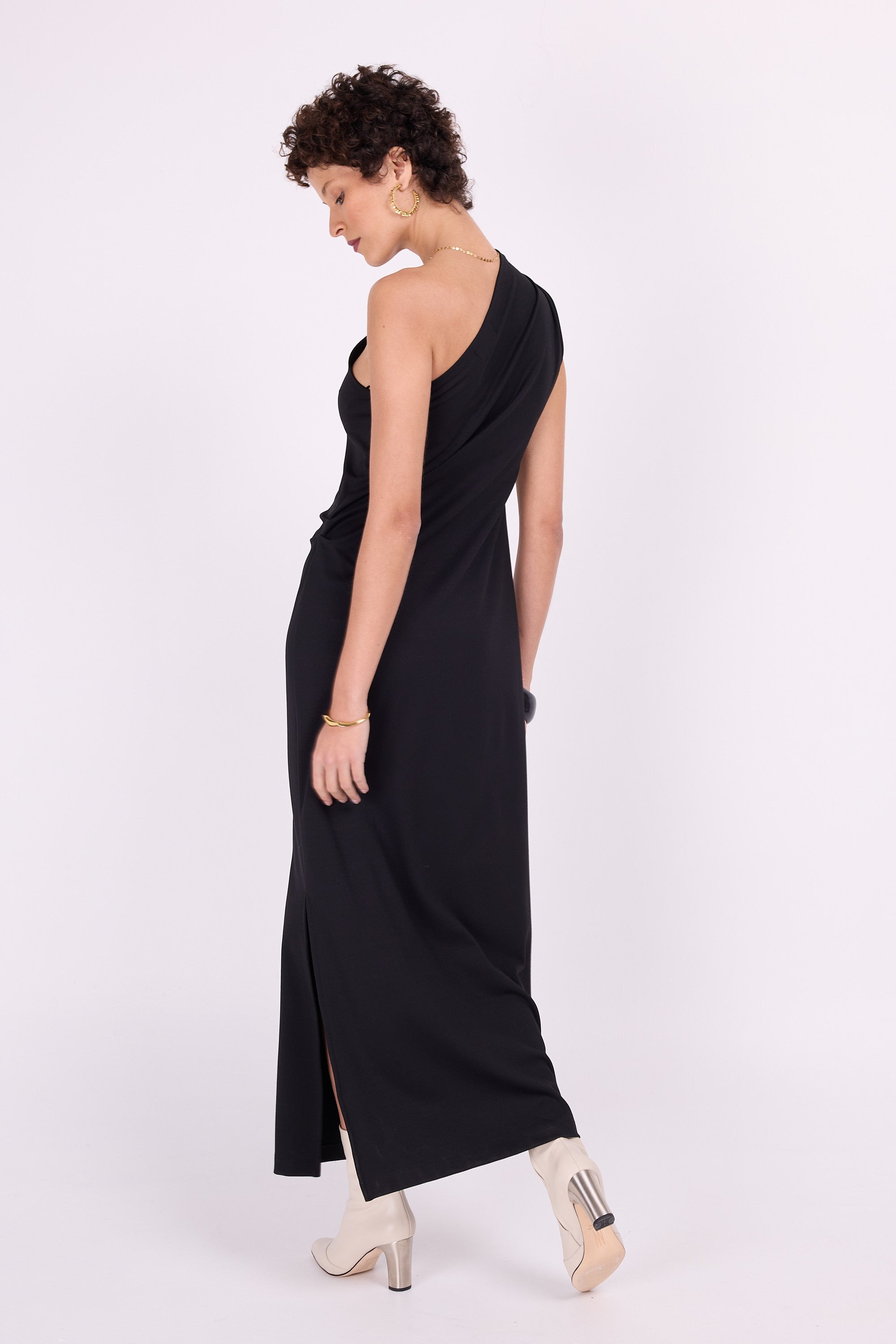 The perfect black dress for special moments that you can easily dress down with a sweater or dress up in combination with a nice jacket. This fitted dress in sturdy stretch fabric leaves one shoulder exposed, the other side closes high to the neck and has a cap sleeve, so you can drape it and make it wider or narrower to your own taste.