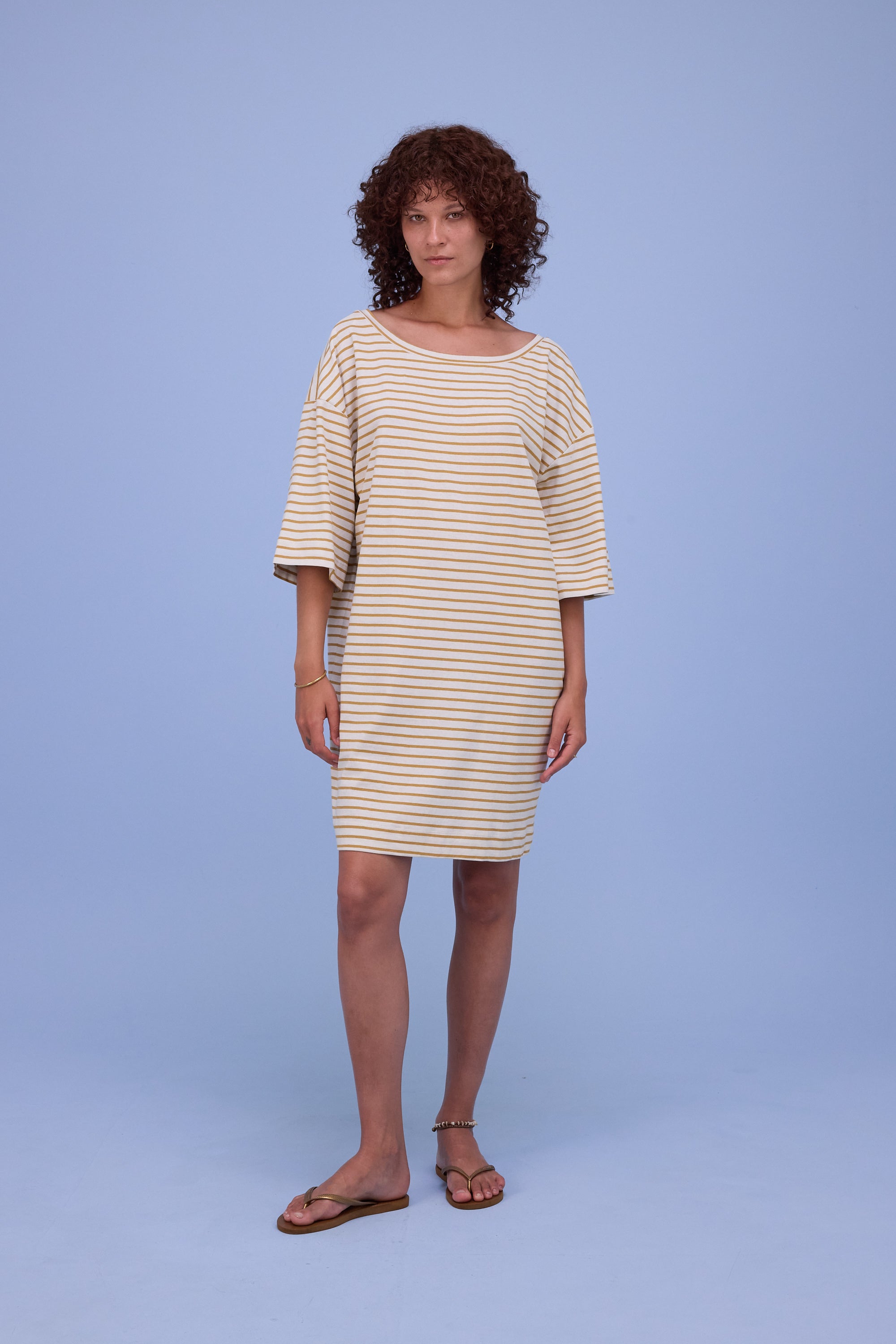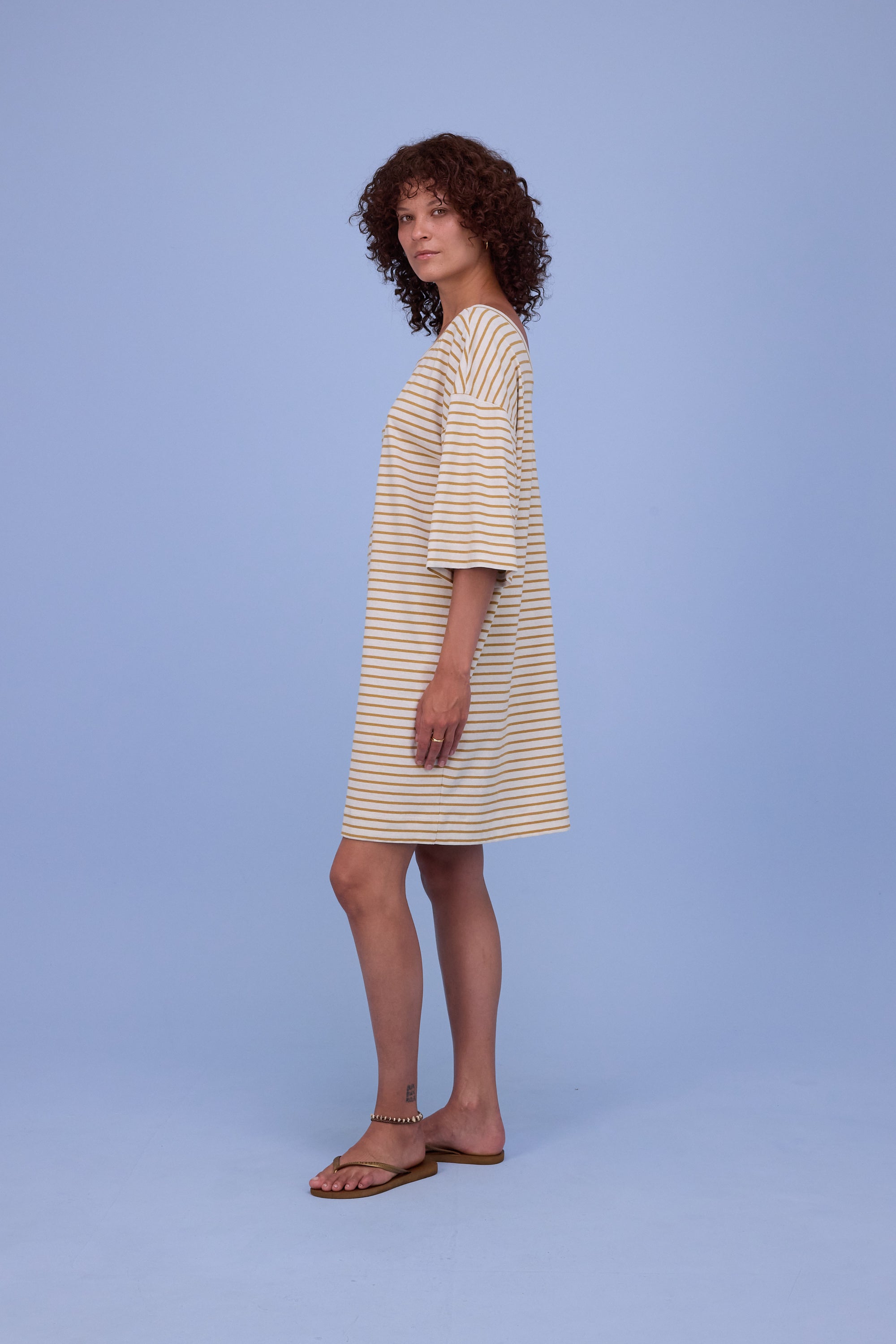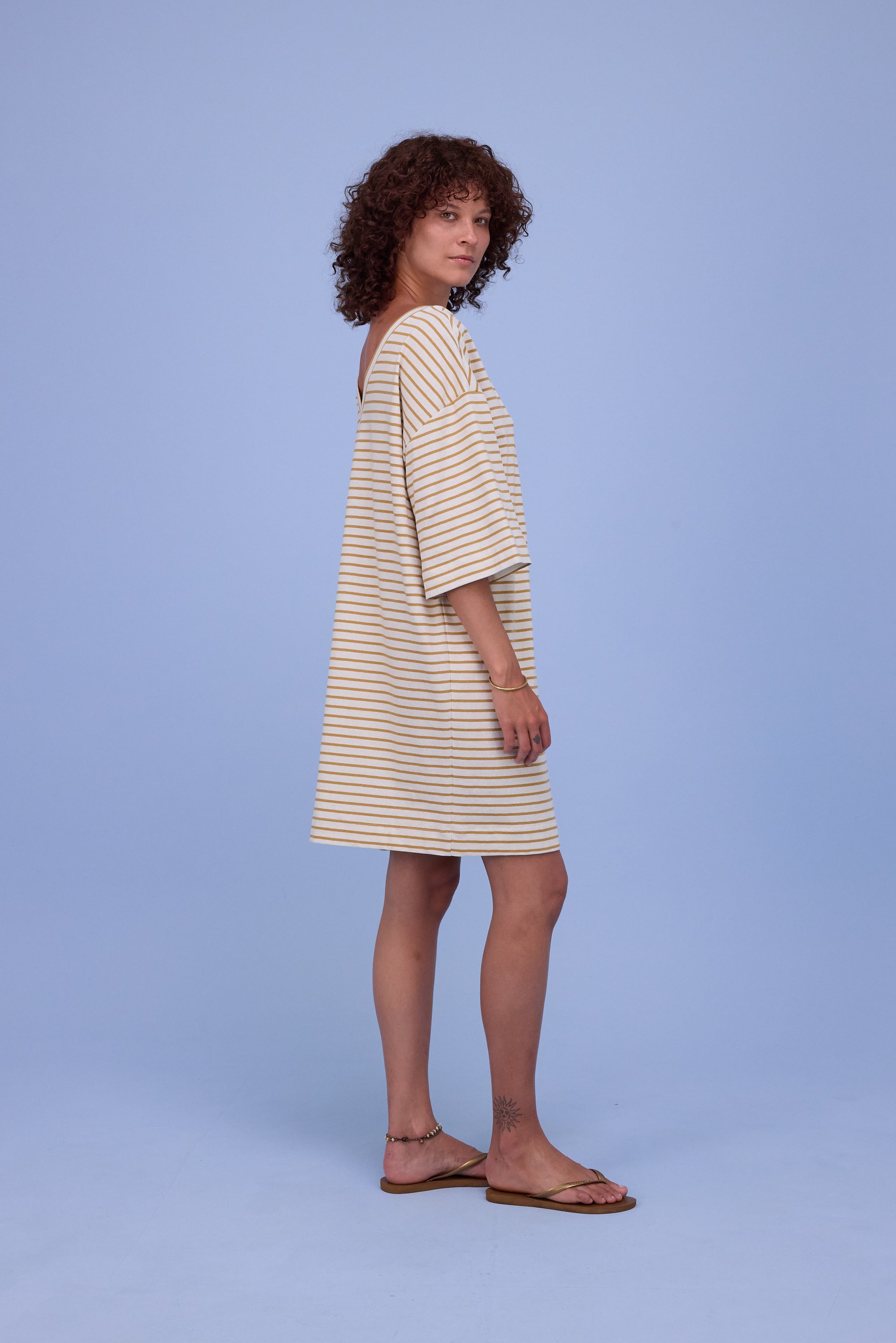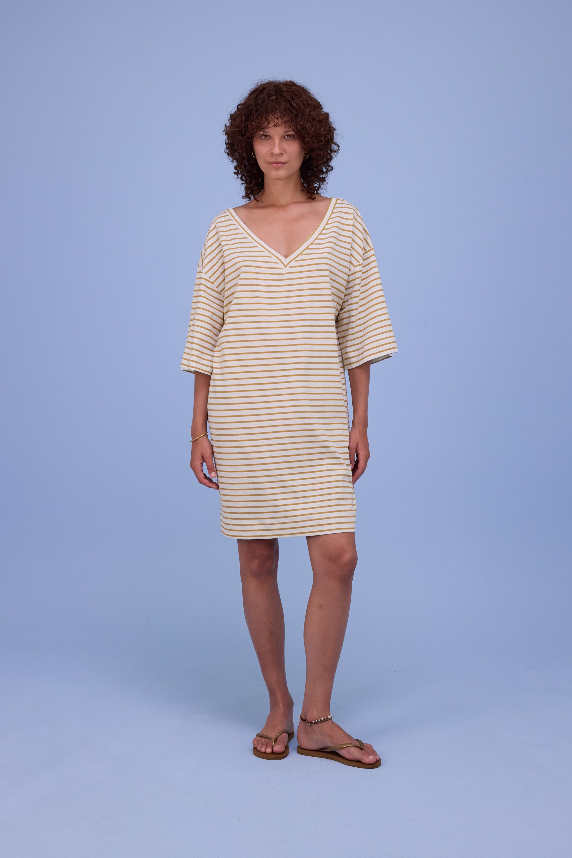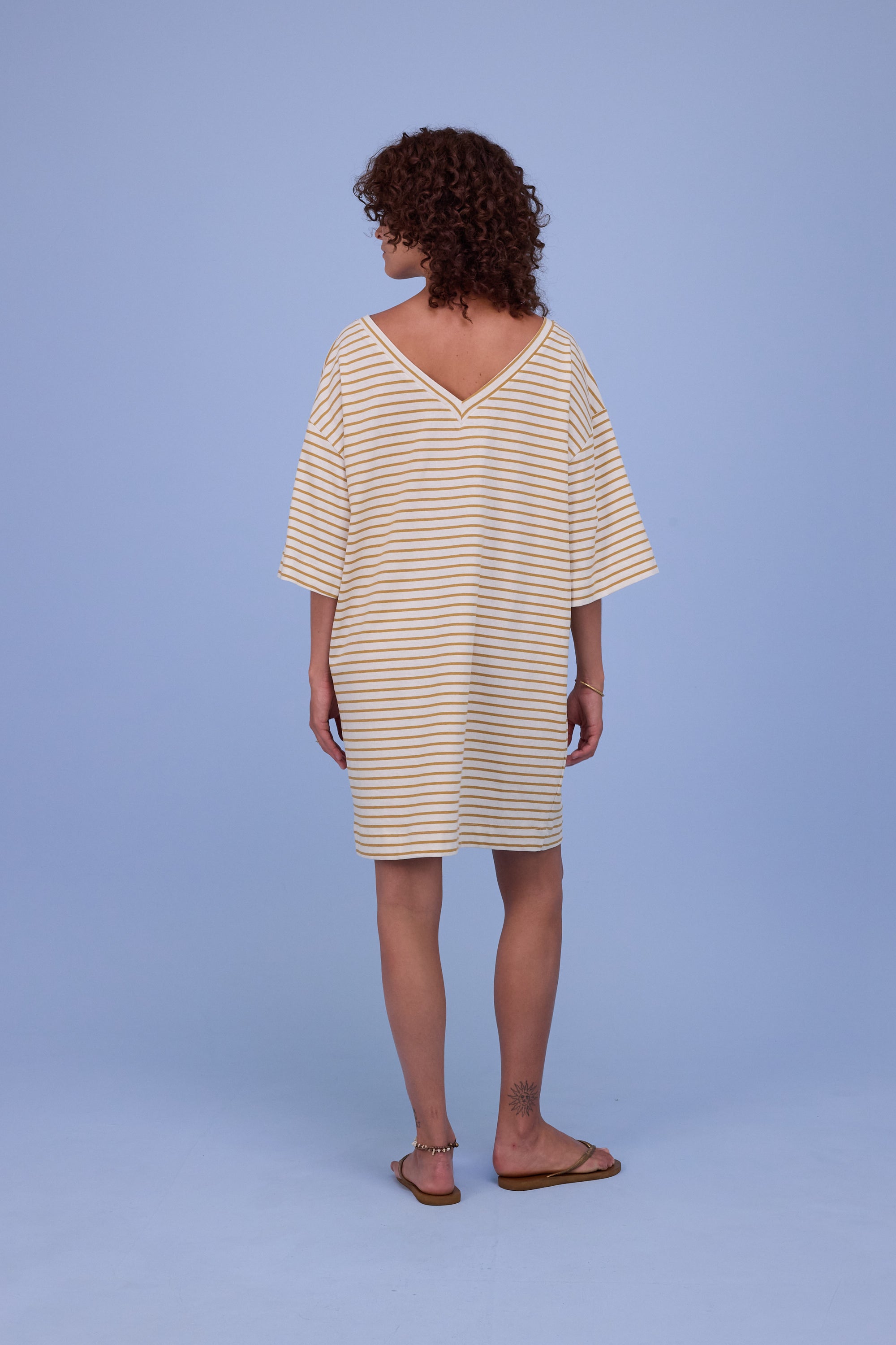Loose-fitting T-shirt dress in linen-bamboo jersey with a mottled effect: natural, breathable and airy for the warmer months. A playful V-neck at the back and dropped shoulders define the look.