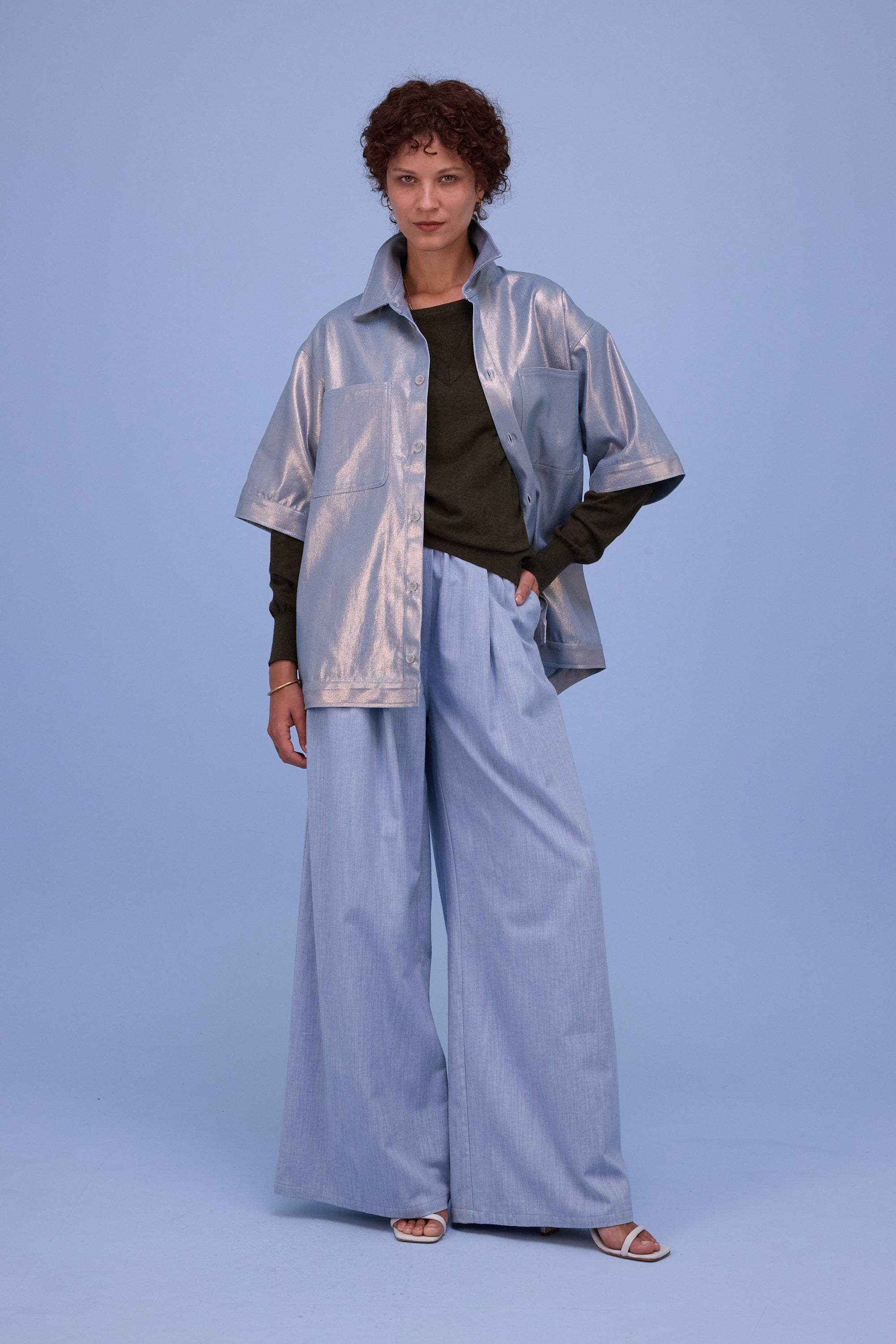 Already available in denim last season, this season it returns in a new variant, the glossy denim: sturdy cotton with a shiny coating.