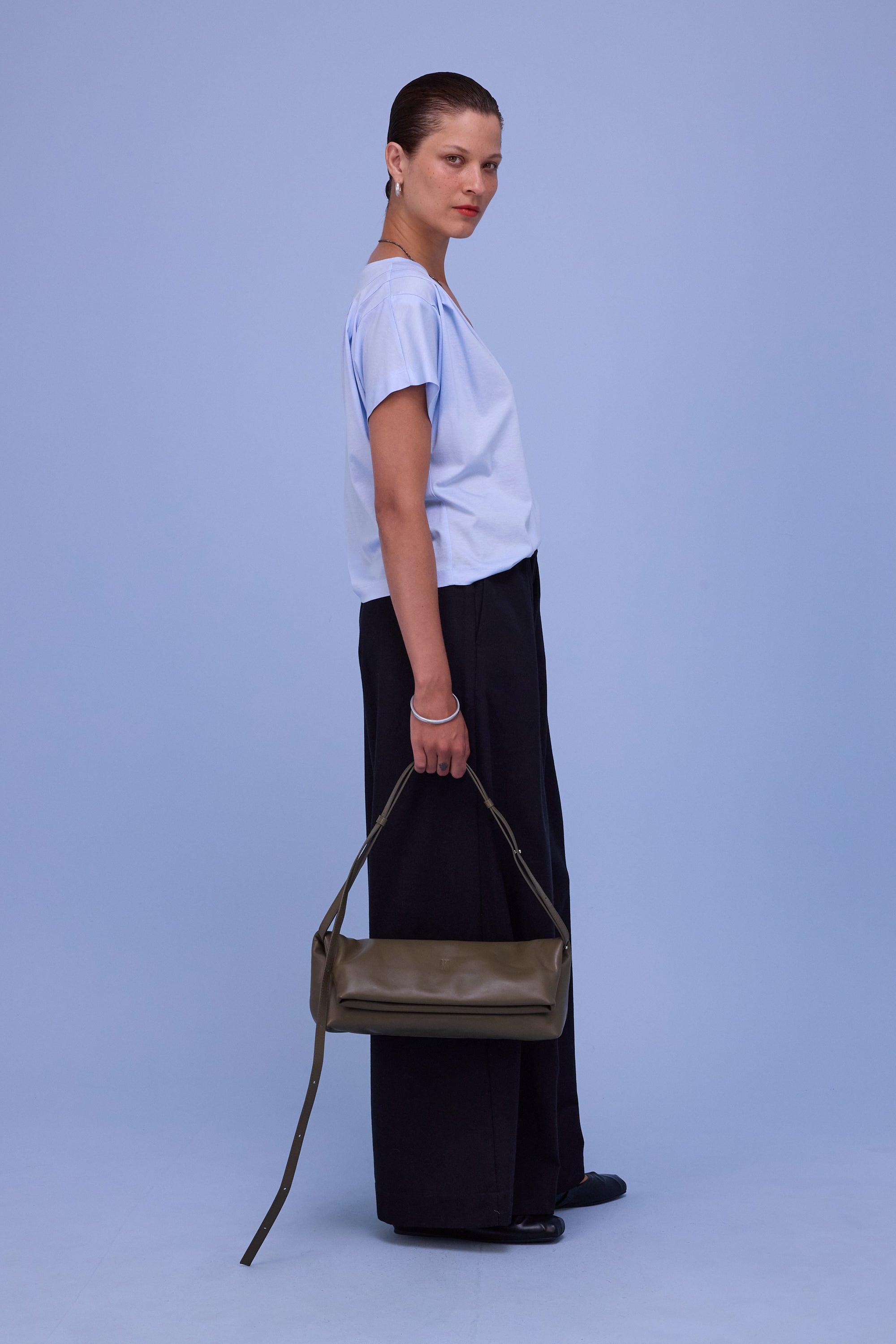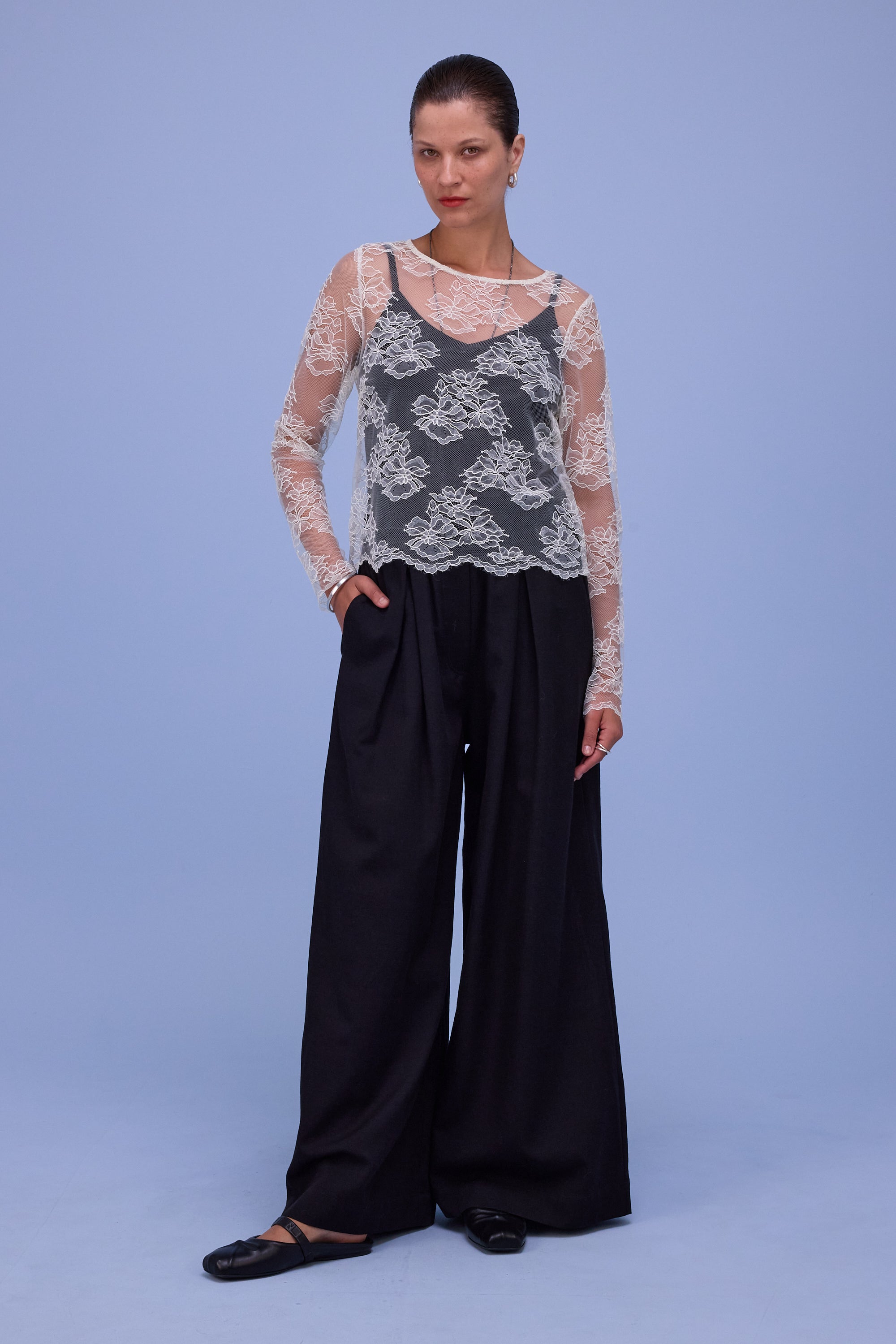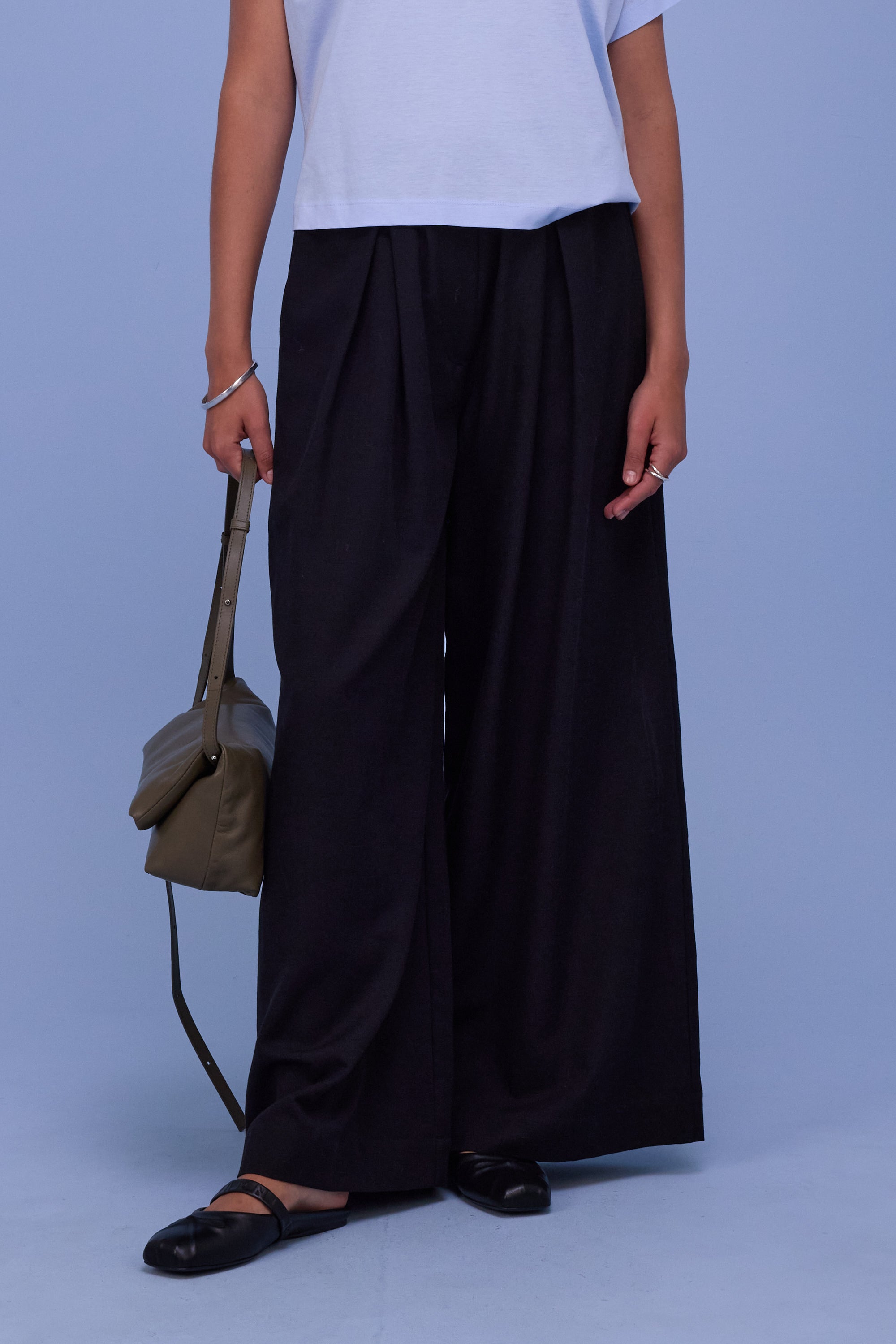 Voluminous trousers with pleats and a wide elastic waistband. Made from a lyocell-cotton blend, a natural fabric with a matte look. A bestseller model in the collection since last summer.