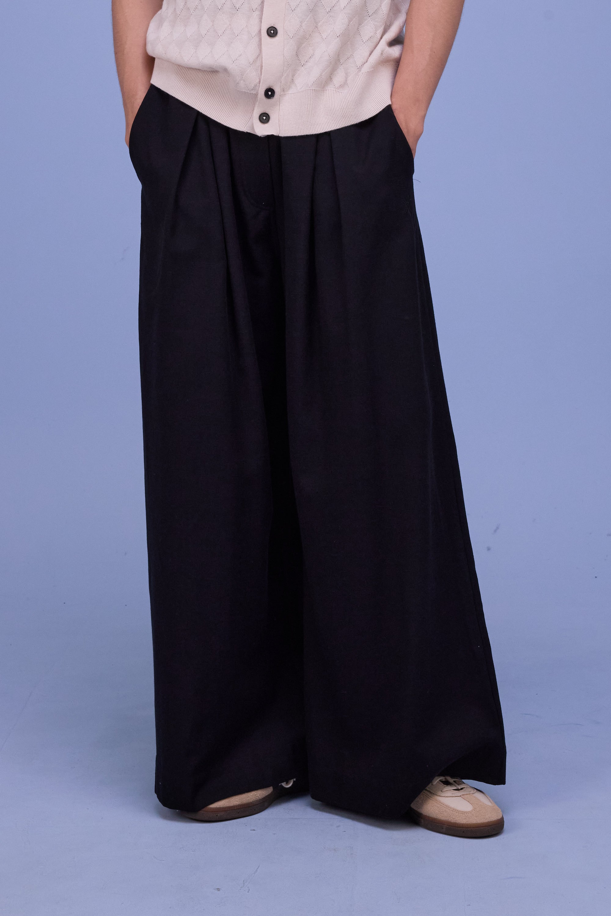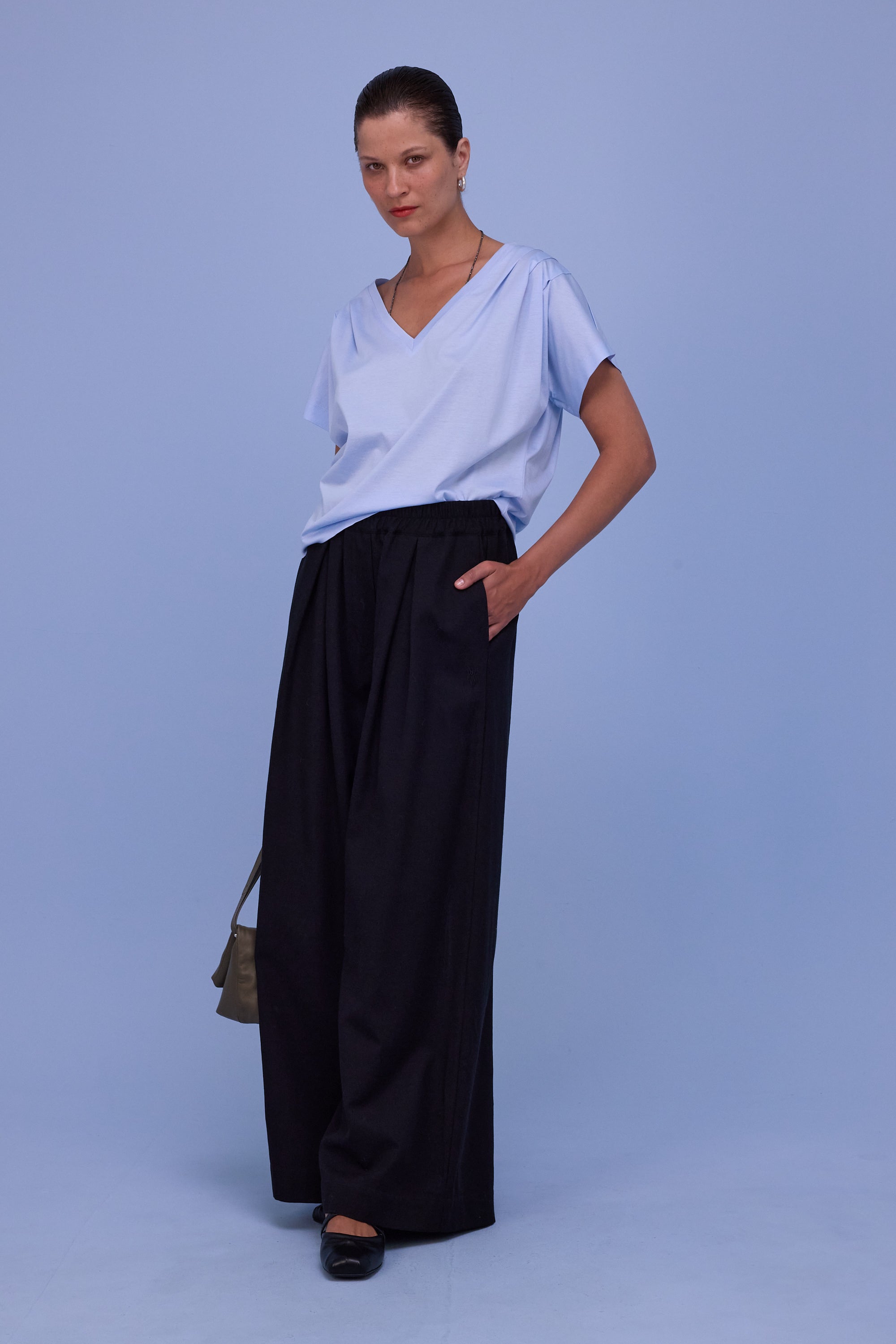 Narrow waist with elastic band featuring gathering and pleats, side pockets, wide volume in the legs.