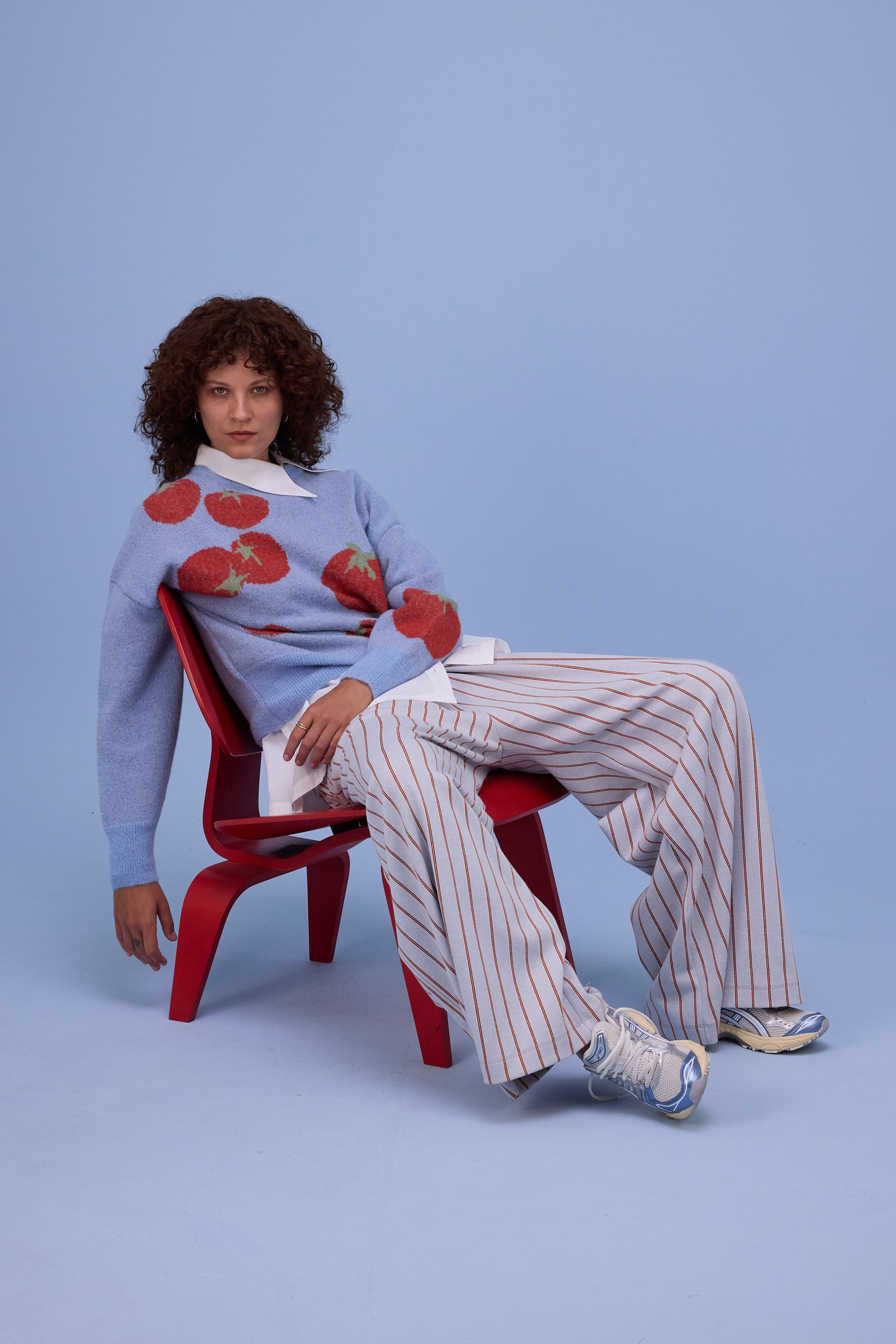 Honjo is already an iconic jumper in the collection. The light blue clashes with the tomato red and enhances the playful tomato design, symbol of the 'Tu es mon coeur de boeuf' collection. Knitted in Belgium in an alpaca merino blend, woolly and soft.