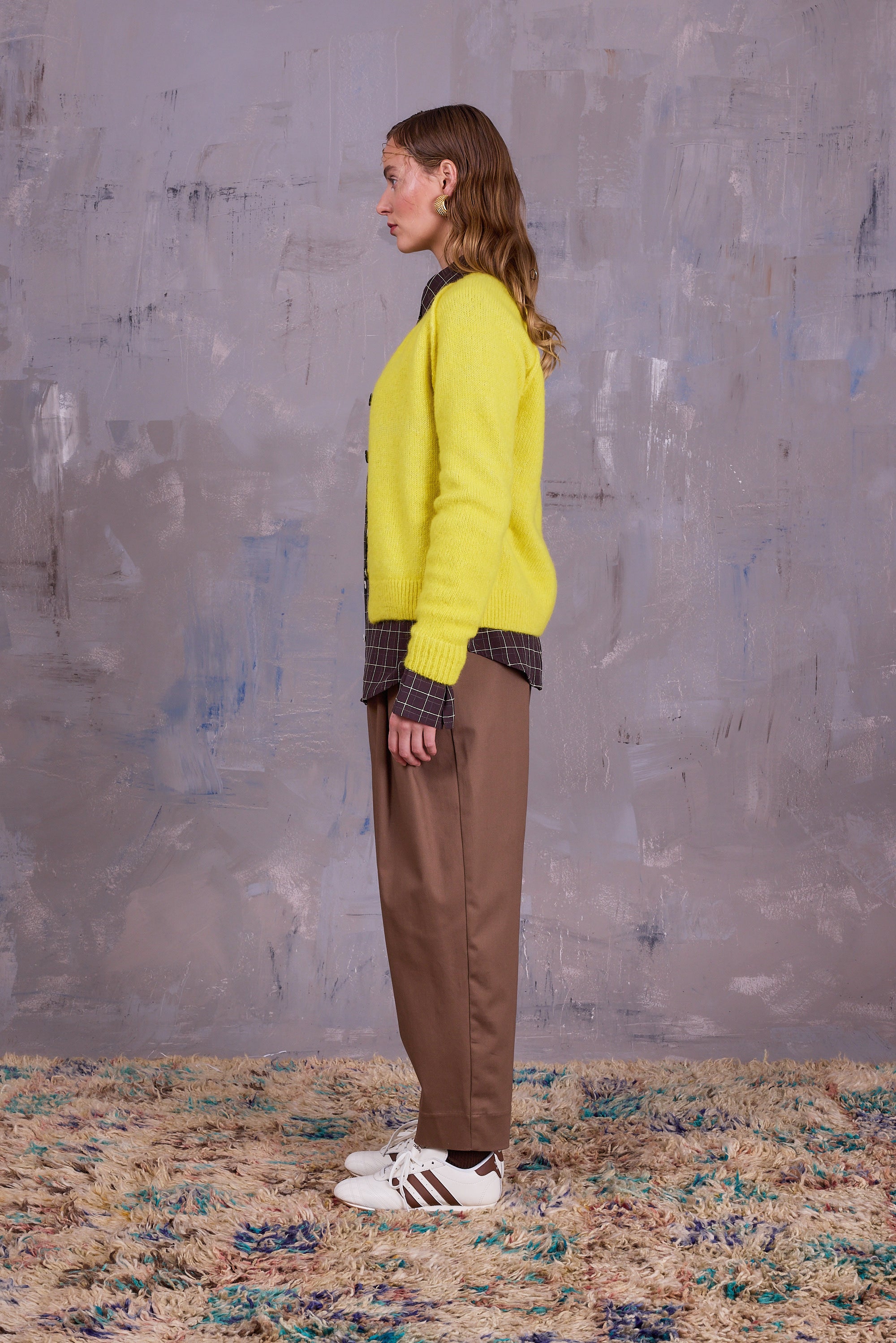Cardigan tricoté en Belgique dans un fil moelleux : un mélange 100 % naturel de baby alpaga, de coton et de laine mérinos.