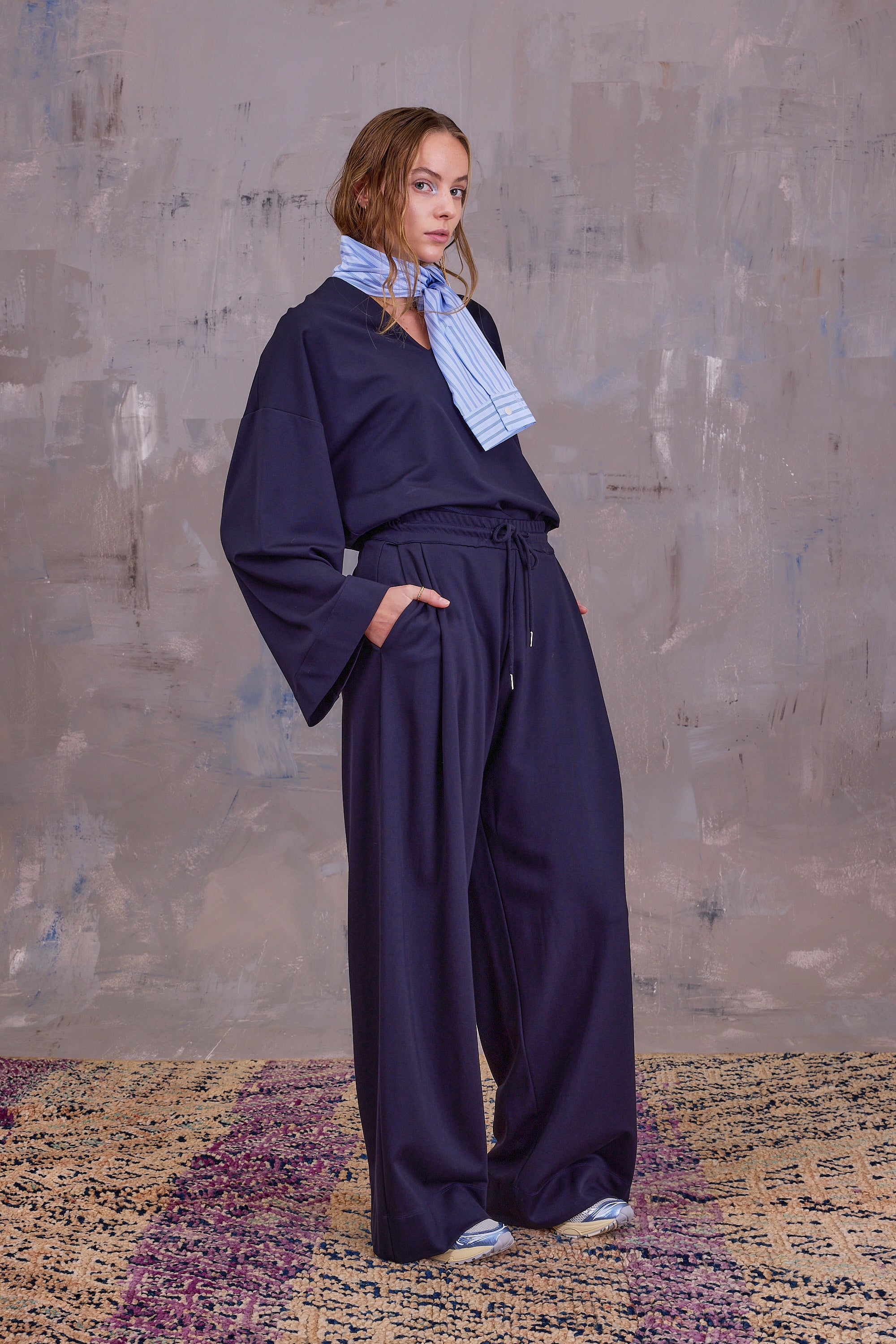 Pantalon large en jersey épais avec large ceinture élastique, cordon de serrage et un pli subtil. Optez pour un look complet en combinaison avec le sweat Georgina ou Gertruda.