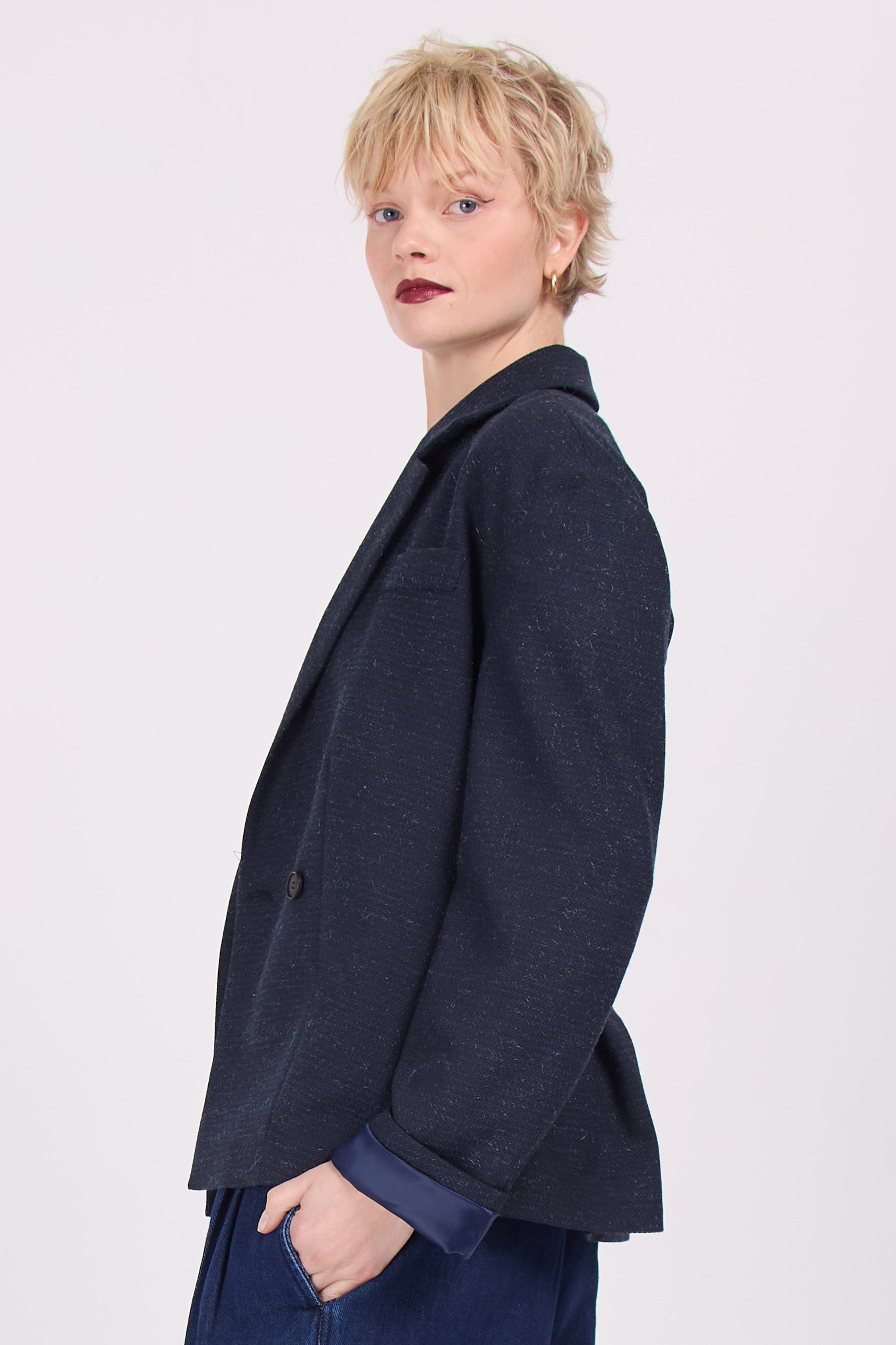 Diego est un blazer qui se situe entre décontracté et habillé, avec des épaules tombantes et une taille marquée par les plis dans le dos. Réalisation en tissu bleu-noir mélangé avec un fin dessin de fils de laine grise.