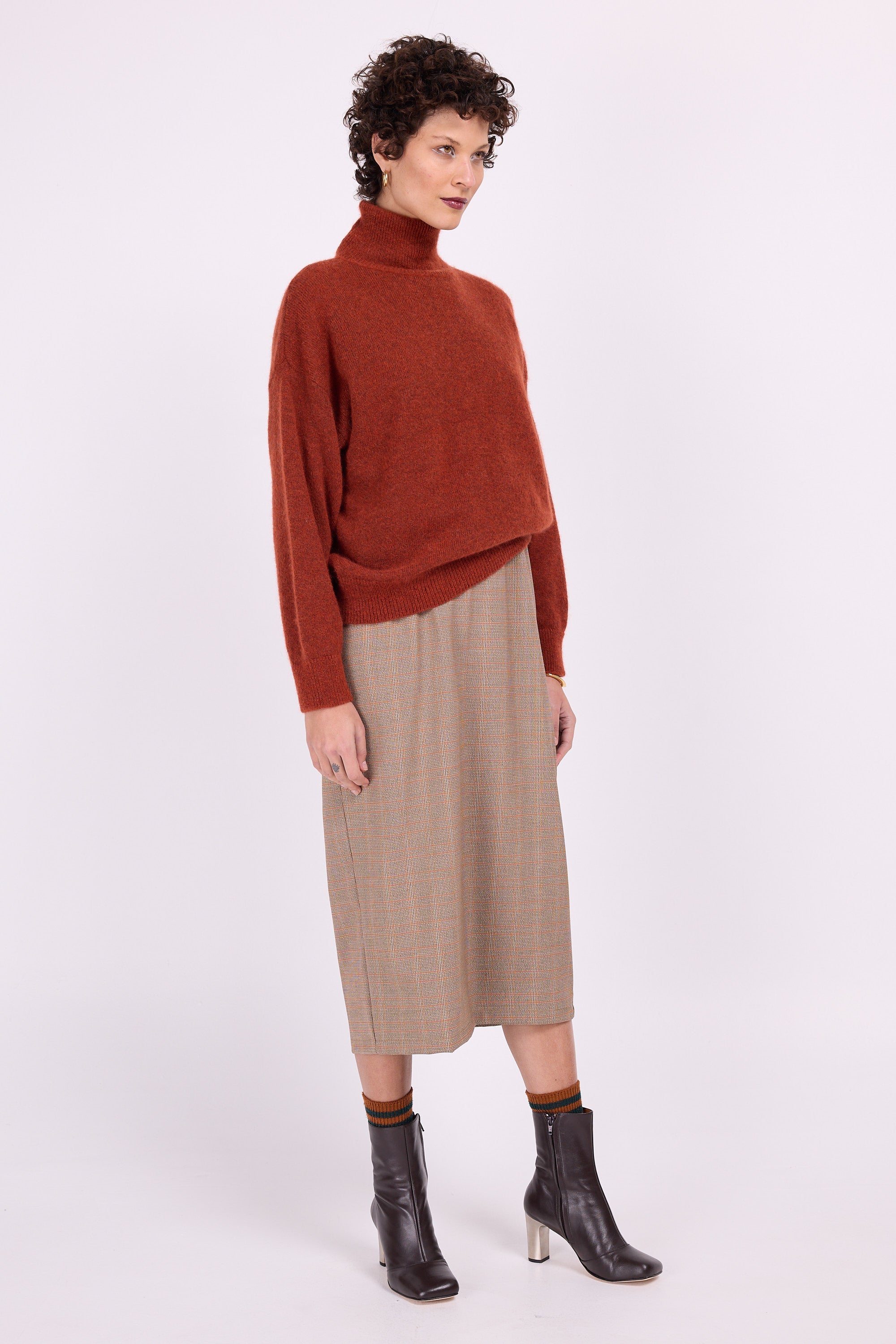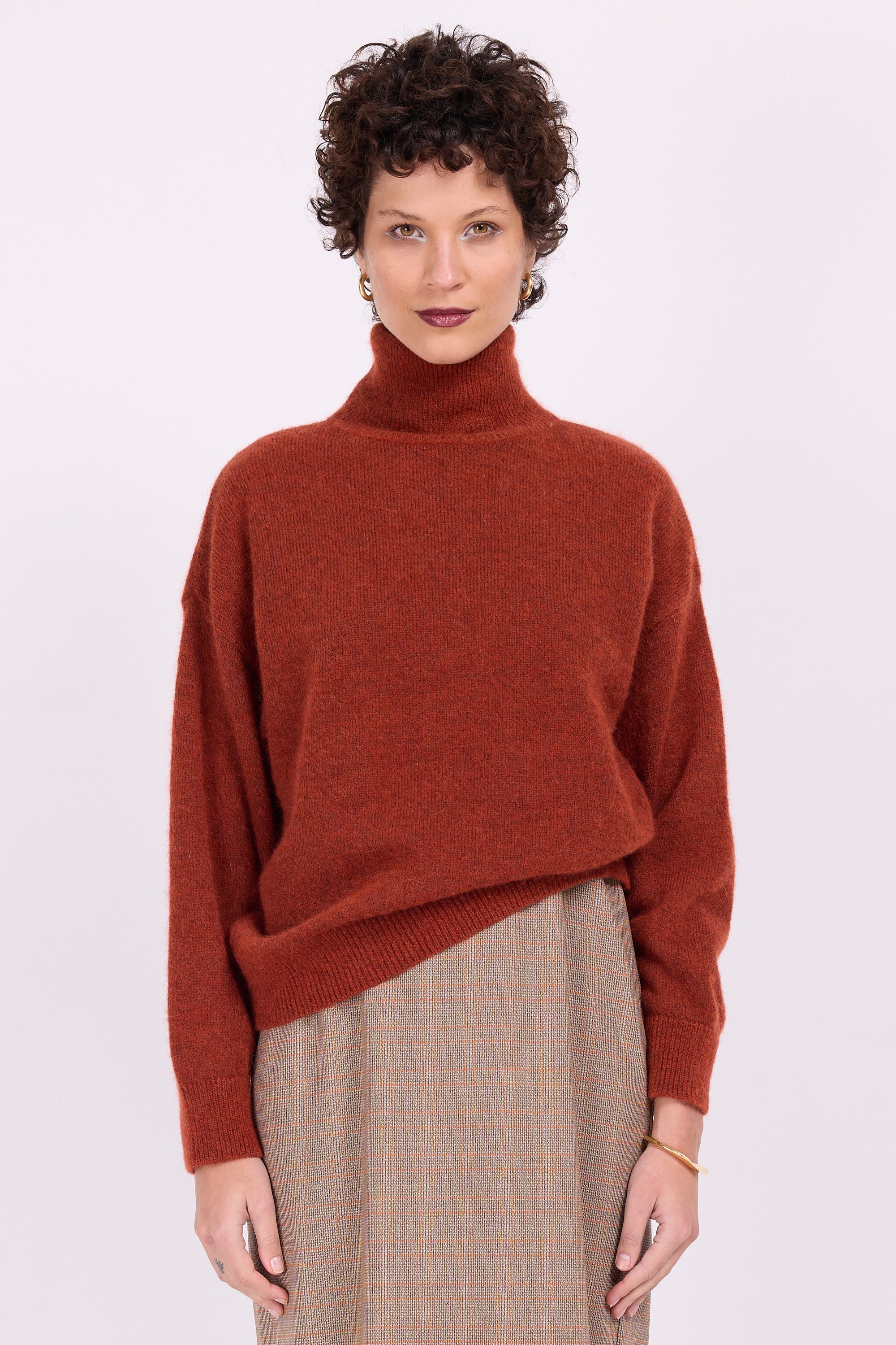 Pull tombant avec col montant en mélange de laine d'alpaga, tricoté en Belgique. Décontracté, robuste et particulièrement agréable à porter.