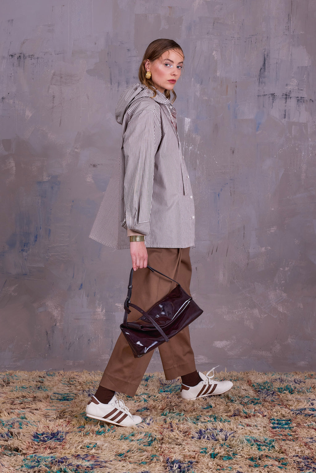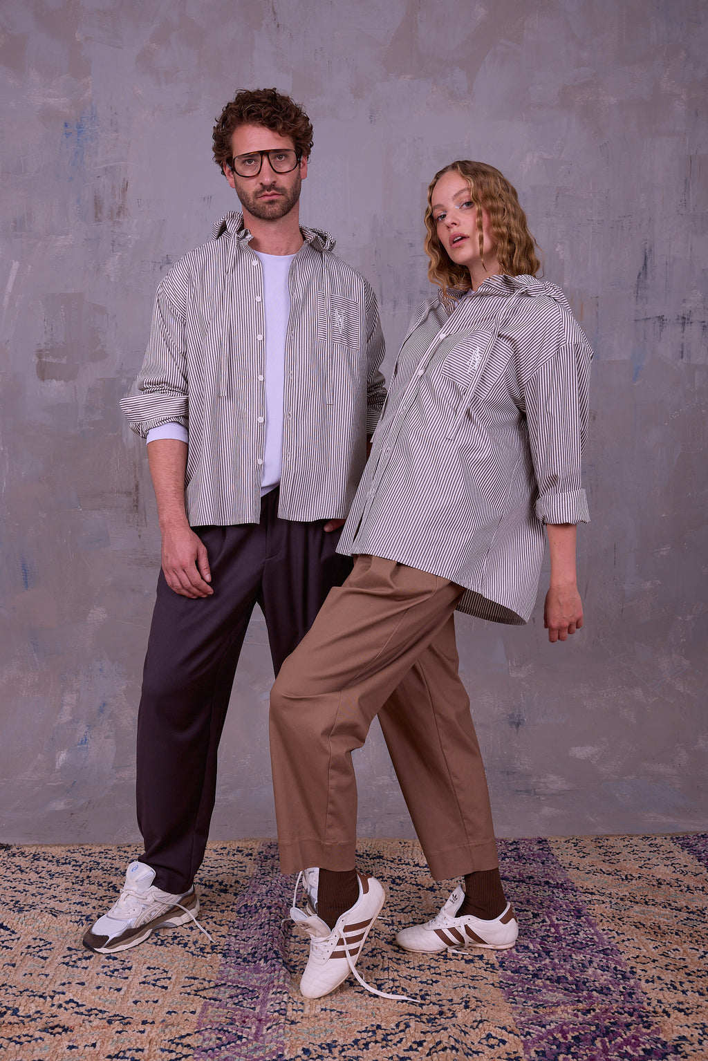 Gonzola n’est pas une chemise parmi une douzaine comme les autres. Avec sa coupe unisexe et ample et sa capuche caractéristique, il se distingue en termes de coupe, mais le tissu est également spécial. Il est confectionné dans un tissu en rayures de coton vintage avec des allures "preppy cool", qui sont encore rehaussées par l’emblème NV brodé sur la poche poitrine.