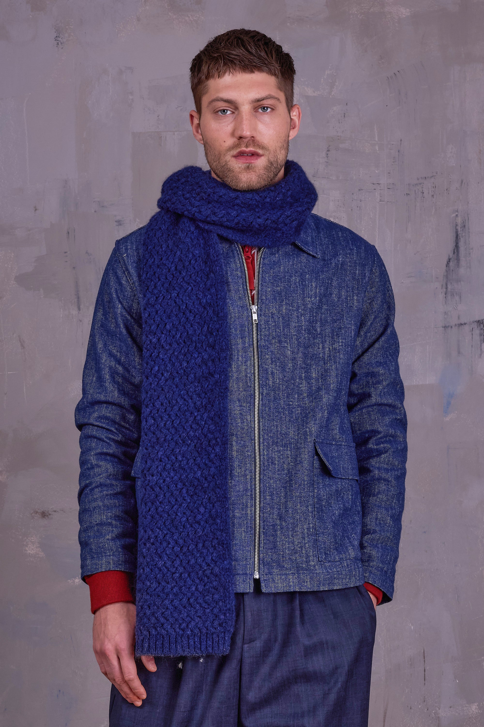 Écharpe à motif tissé, tricotée en Belgique dans un fil duveteux : un mélange 100% naturel de bébé alpaga, coton et laine mérinos.