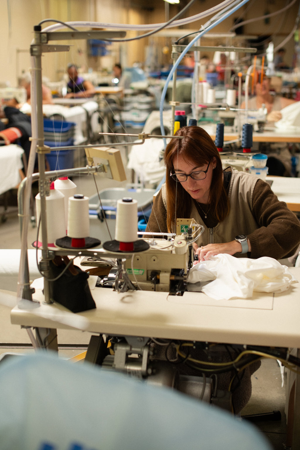Comme l'équipe créative, commerciale et administrative est logée sous un même toit à Anvers, l'impact sur l'environnement reste limité. Dans le reste de la chaîne de production, nous essayons également de minimiser l'impact sur l'environnement. C'est pourquoi nous maintenons depuis plus de 20 ans plus de la moitié de la production en Belgique, aussi bien pour la confection que pour le tricot. Sur l’image, vous voyez notre atelier de confection belge.
