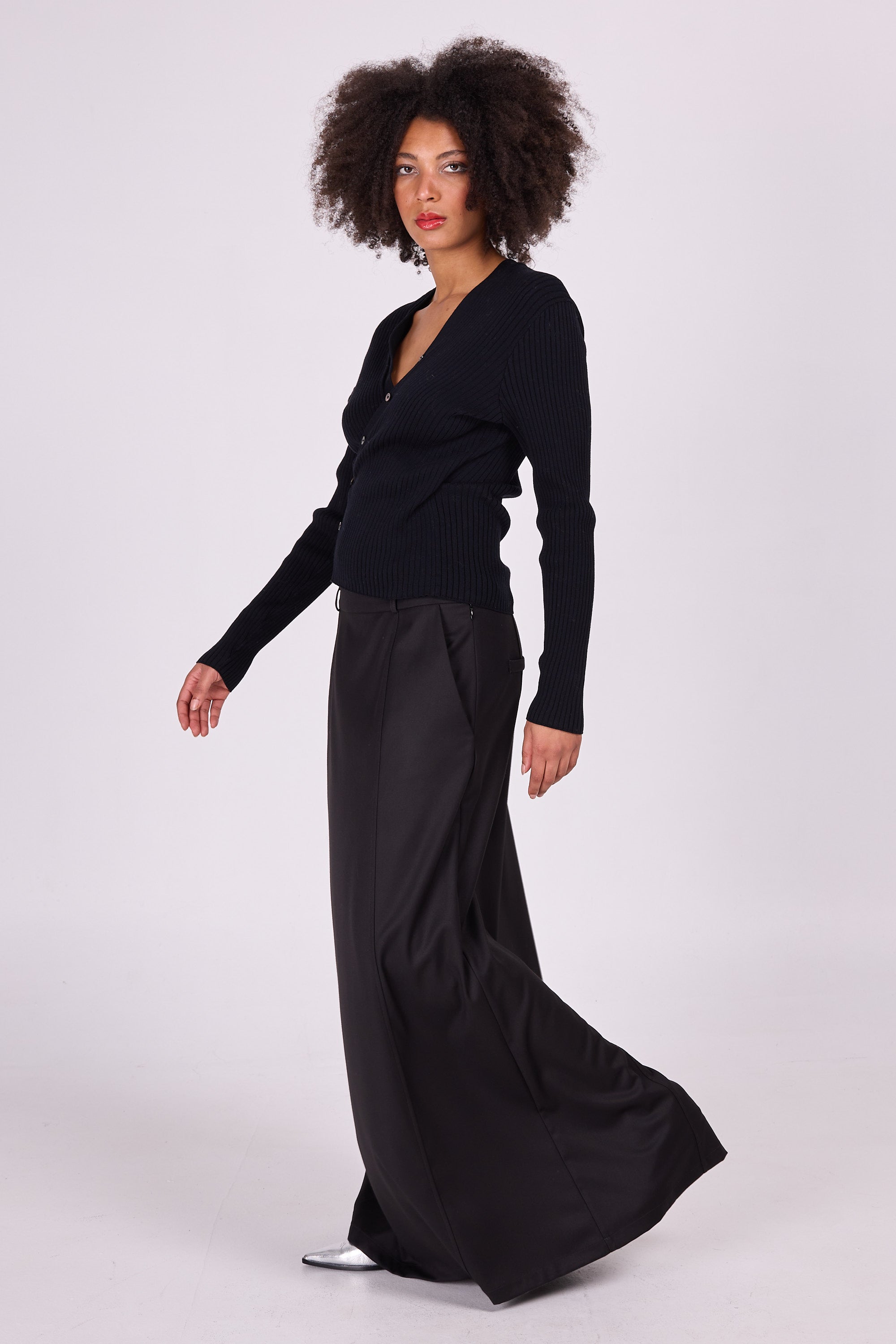 Passender Wickelpullover mit Rippenmuster und verspielter Knopfreihe. Aus Satin-Baumwolle gestrickt, weich auf der Haut.