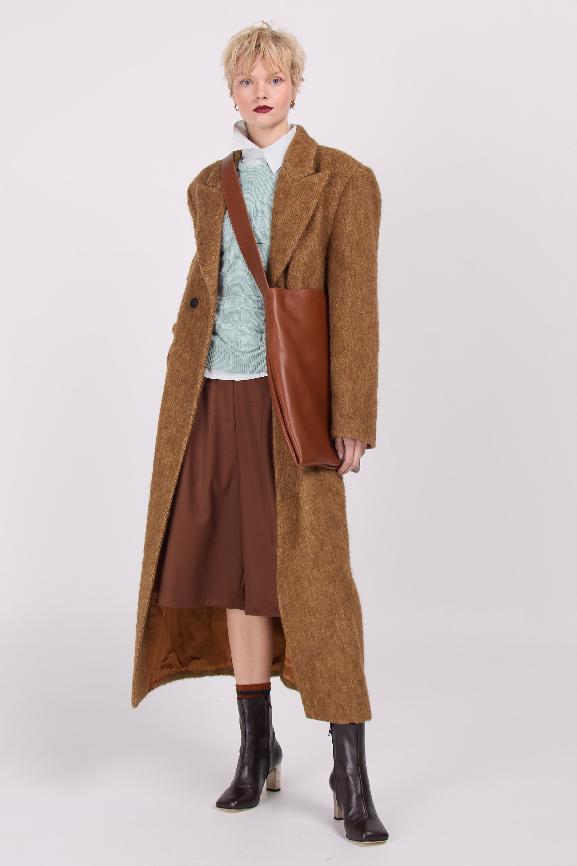 Manteau avec des vibrations 'grandpa chic'. Des épaules angulaires et une longueur généreuse définissent le style, le tissu en tweed poilu brun doux lui confère un caractère intemporel.