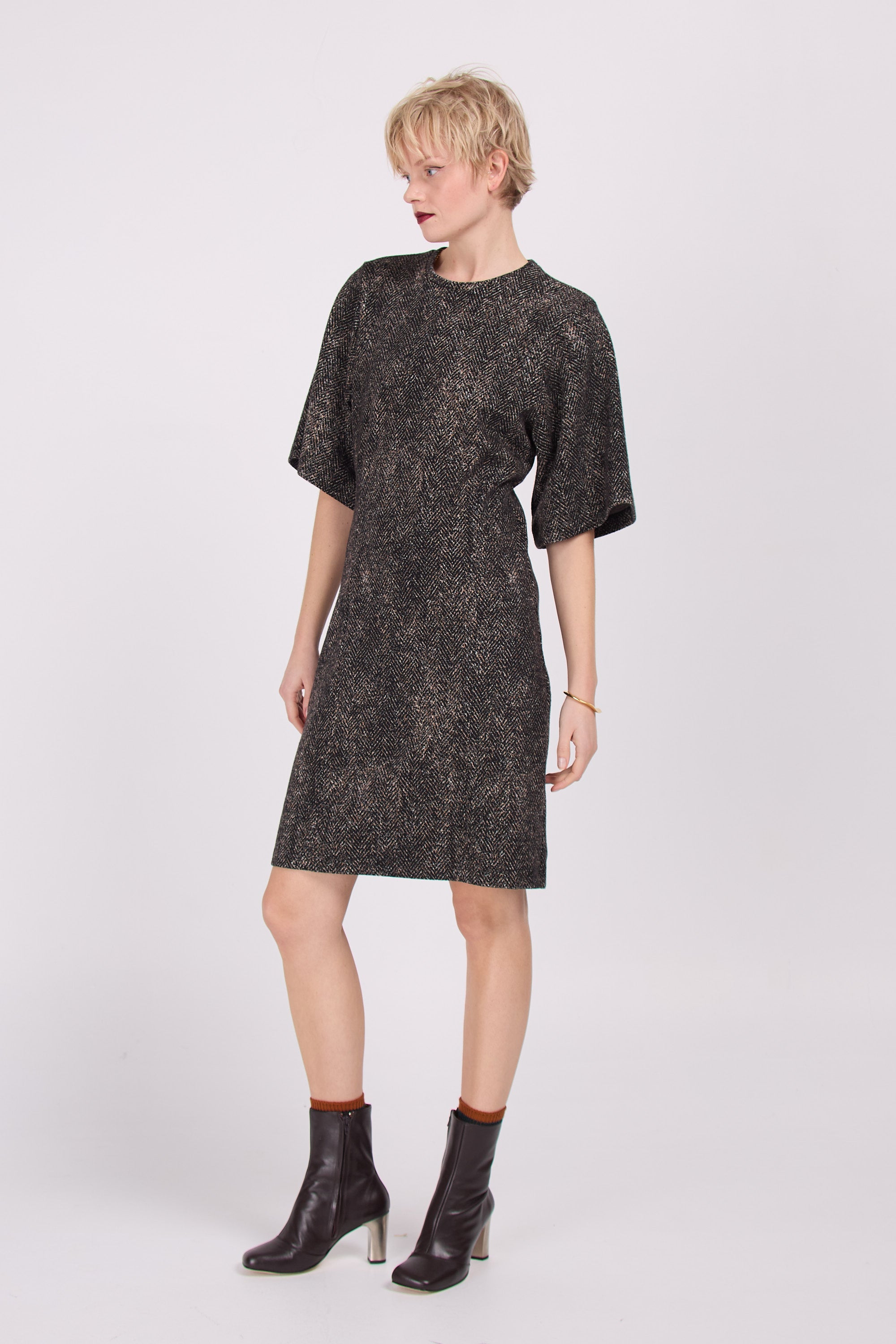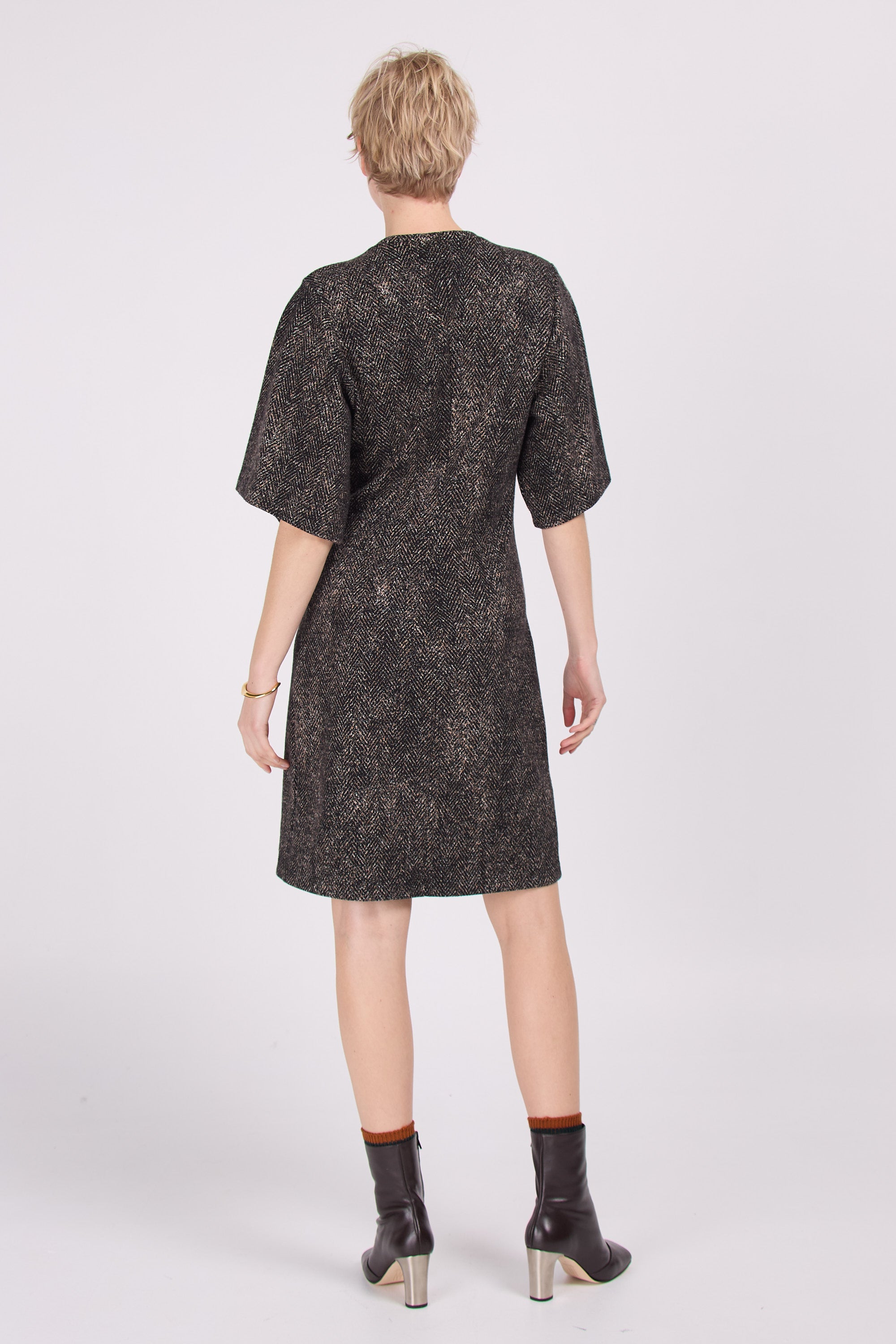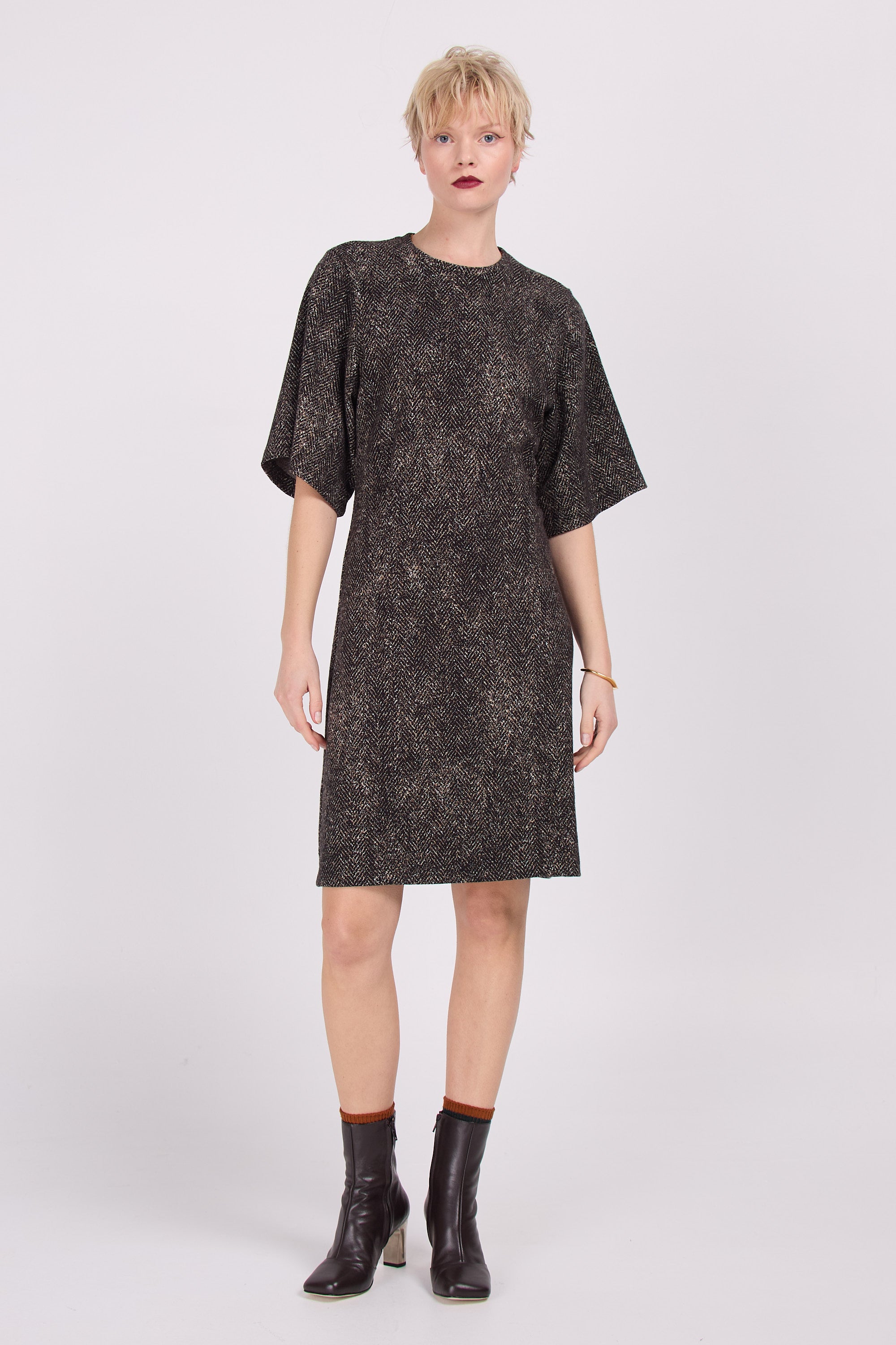 Robe ajustée avec des manches larges en un tissu jersey solide avec un motif en chevrons en noir avec des accents marron et beige. Belle avec ou sans des bas noirs.