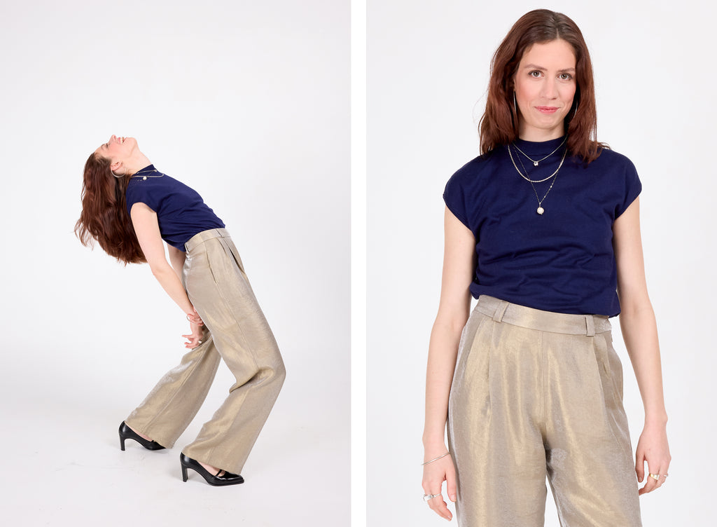 -"Deze top is in midnight blue - het mooiste blauw dat er bestaat. De broek is in een shiny stof die van zilver naar goud vloeit wanneer je beweegt - dat vind ik echt geweldig."