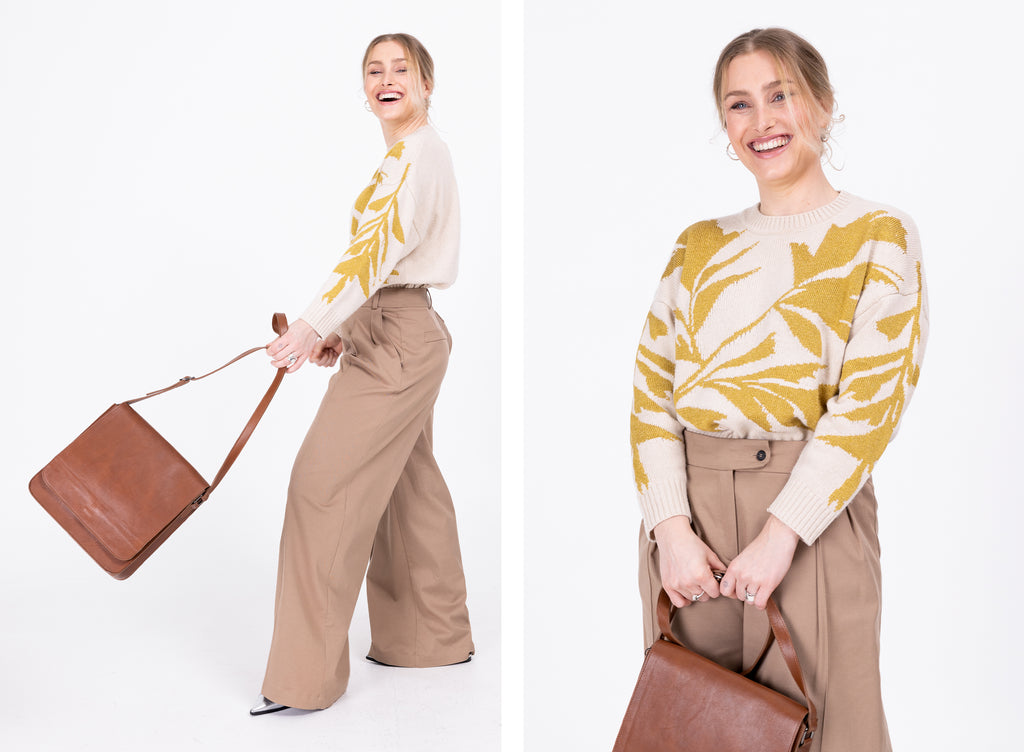 -"Dit is mijn favoriete outfit omdat de broek bij werkelijk àlles mooi is en de print van de trui vind ik heel bijzonder. Ik voel me hier heel goed in. Volgens mij de kwaliteiten van een Nathalie Vleeschouwer-look: mooie kleuren, verschillende texturen en mooie fits van de broeken."