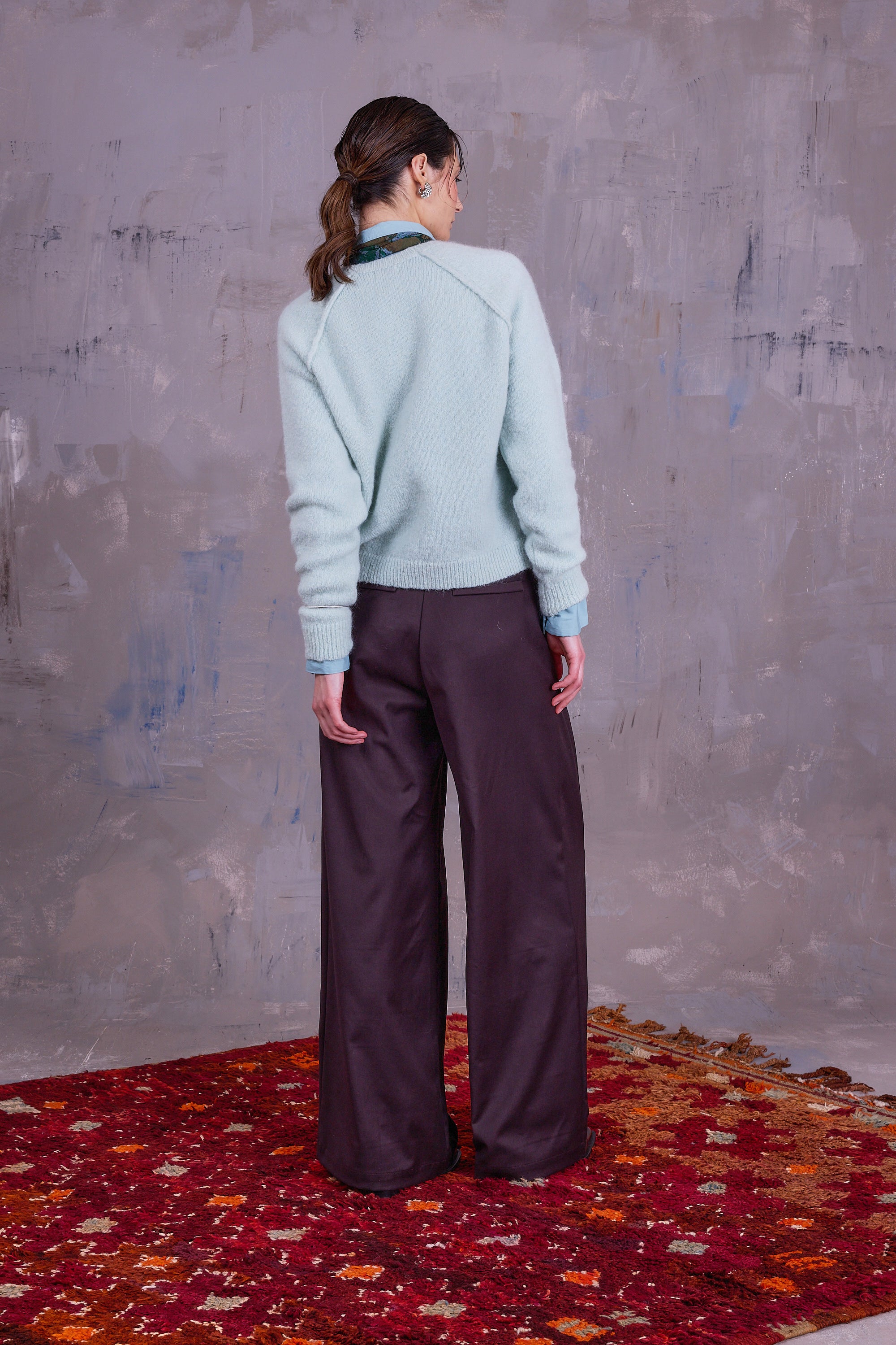 Pullover, der seine ganze Kraft aus der herrlichen Farbe und dem warmen Garn schöpft. In Belgien gestrickt aus einer Mischung aus Mohair und Merinowolle. Kein Winter zu kalt, kein Kälteschauer zu unerschütterlich.