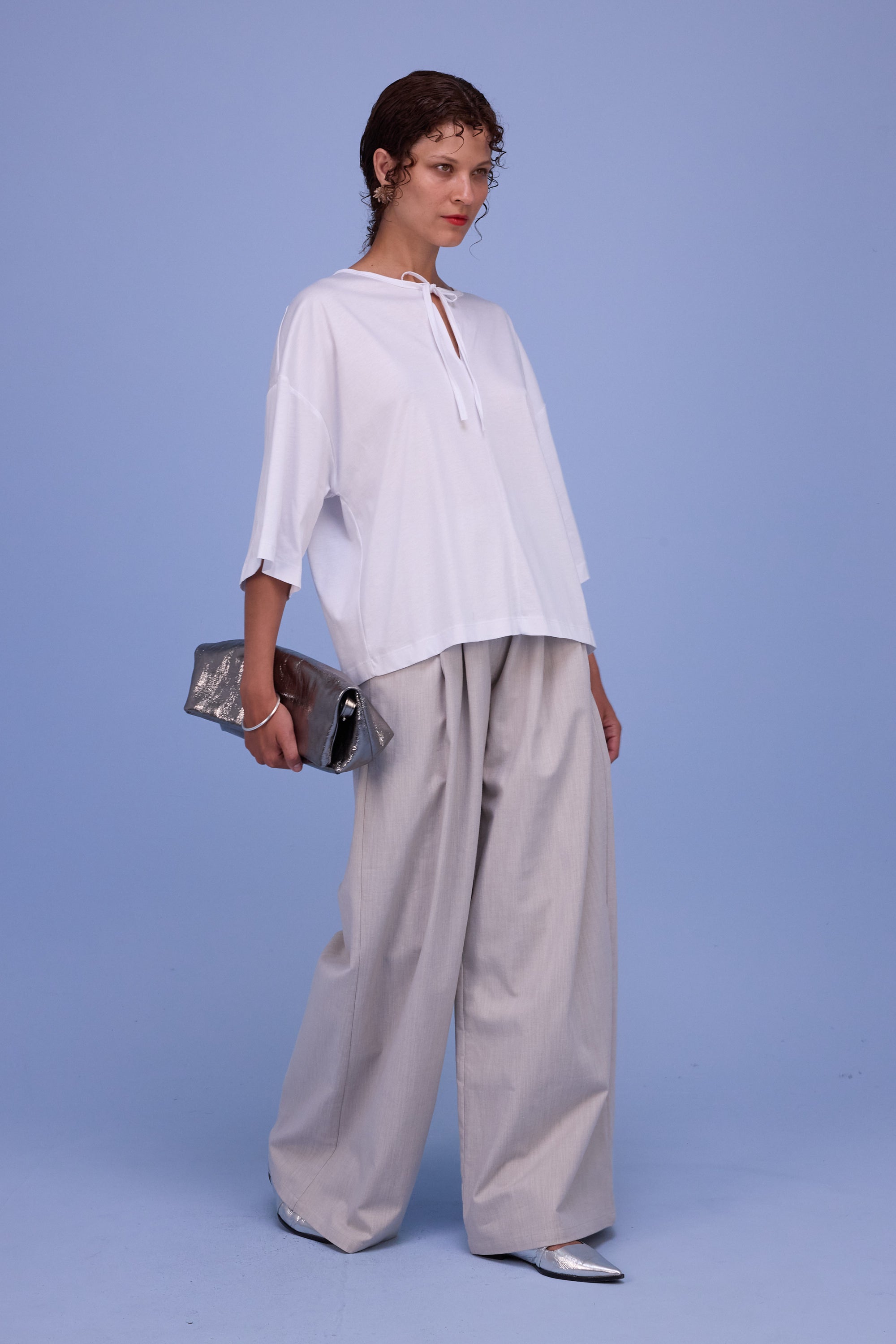 Locker sitzendes T-Shirt mit Bändchen auf der Brust. Die herabfallenden, weiten Ärmel bestimmen ebenfalls die großzügige Passform dieses T-Shirts.