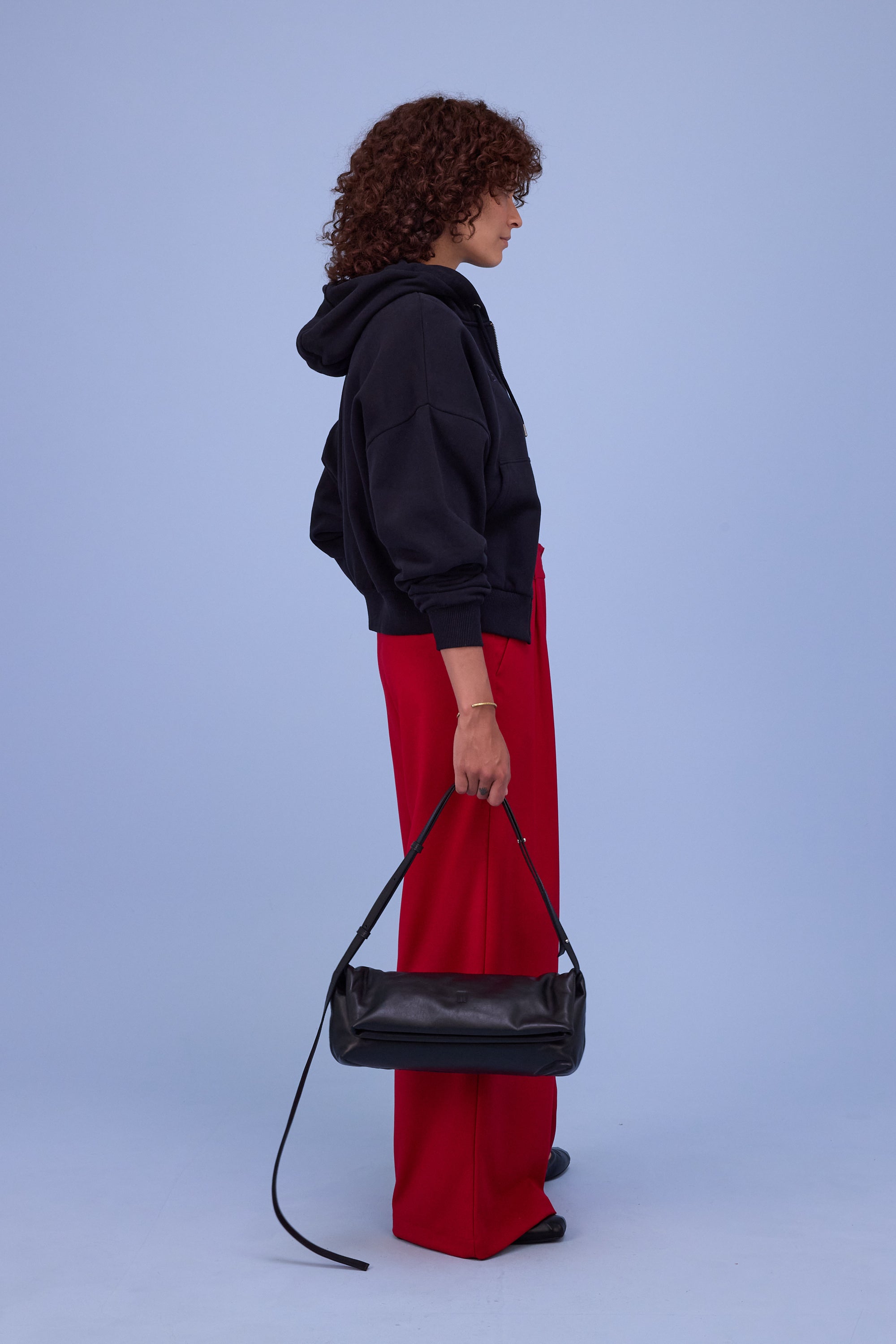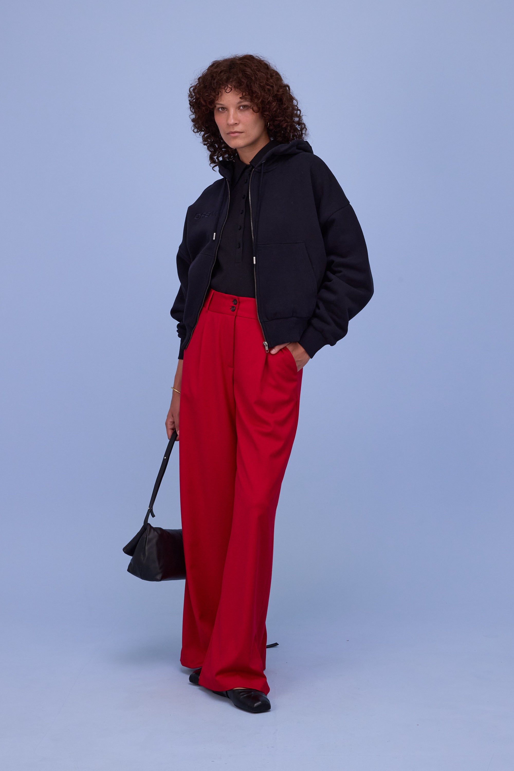 Übergroße Passform, aber mit kurzem Rumpf und anliegendem Taillenbund. Nimm deine übliche Größe.